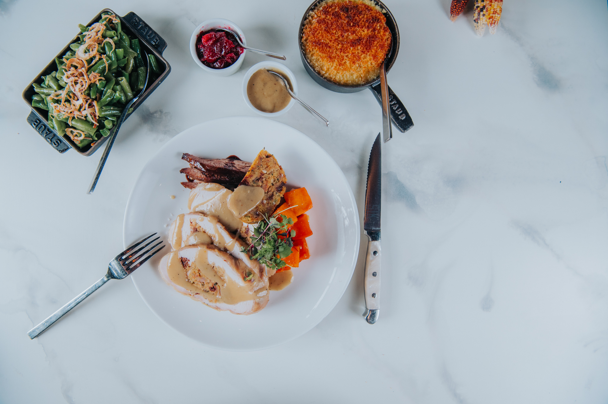 The Lowdown: Go from brunch at the St Julien ballroom to a three-course Thanksgiving dinner at Jill’s Restaurant. The menu features a choice of roasted cauliflower soup or kale and local apple salad for starters, oven-roasted turkey with all the traditional fixings, pistachio-crusted branzino, braised Colorado short beef rib or vegan sweet potato tart and an assorted dessert bar with pumpkin cheesecake, pecan pie, flourless chocolate cake and carrot cake. Reservations are recommended.