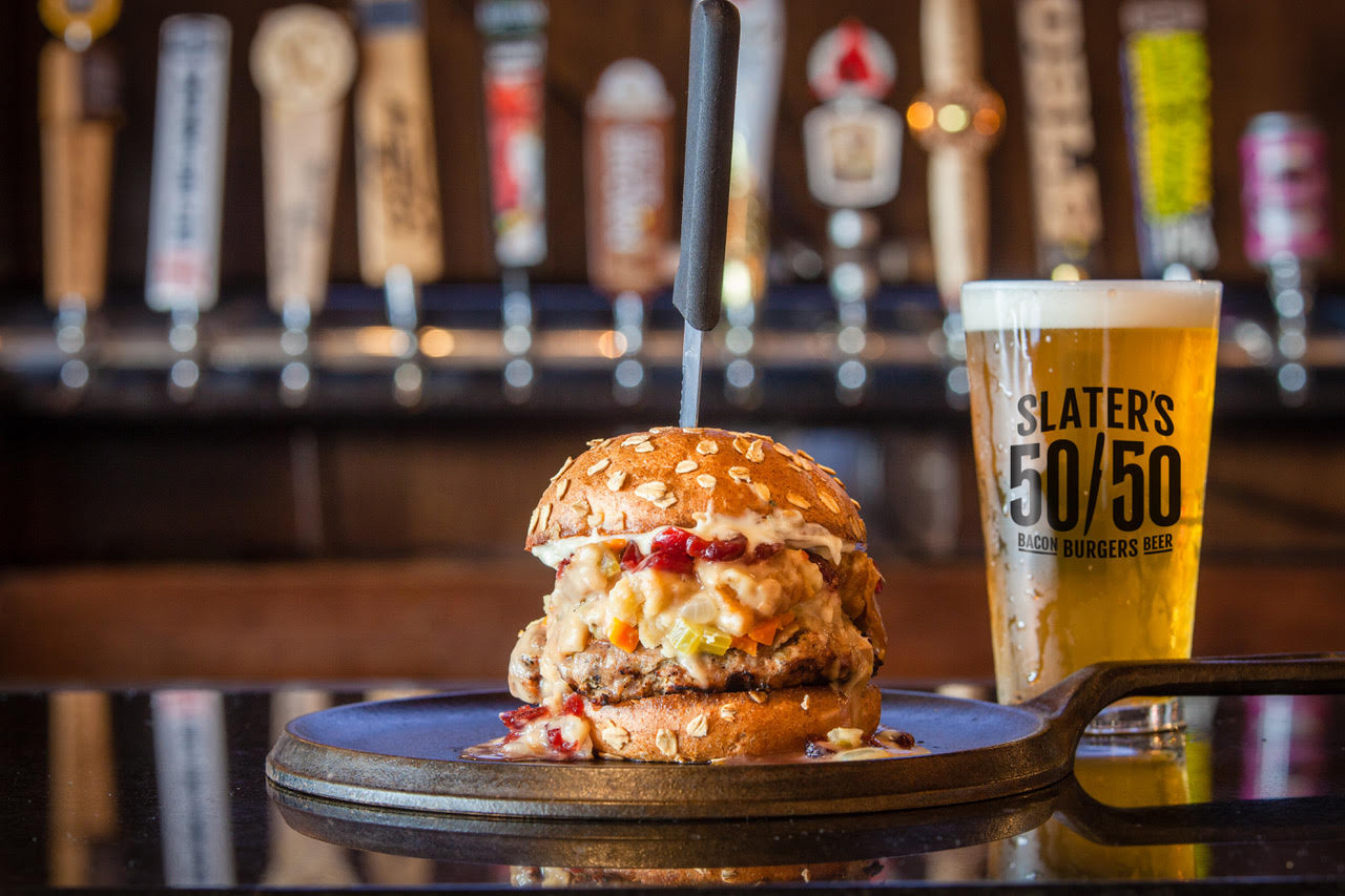 The Lowdown: For November, enjoy two of Slater’s 50/50 specialty menu items: the “Slaterized” bacon lava cake and Thanksgiving burger. Both pack a mouth-watering bite of sweet and savory holiday flavors sure to make your tastebuds sing. The “Slaterized” bacon lava cake is topped with chopped bacon, caramel drizzle, vanilla bean ice cream, a strip of bacon and sea salt sprinkle. While the Thanksgiving burger is packed with a turkey patty, brioche stuffing, turkey gravy, cranberry sauce and garlic and sage aioli on a honey wheat bun.
