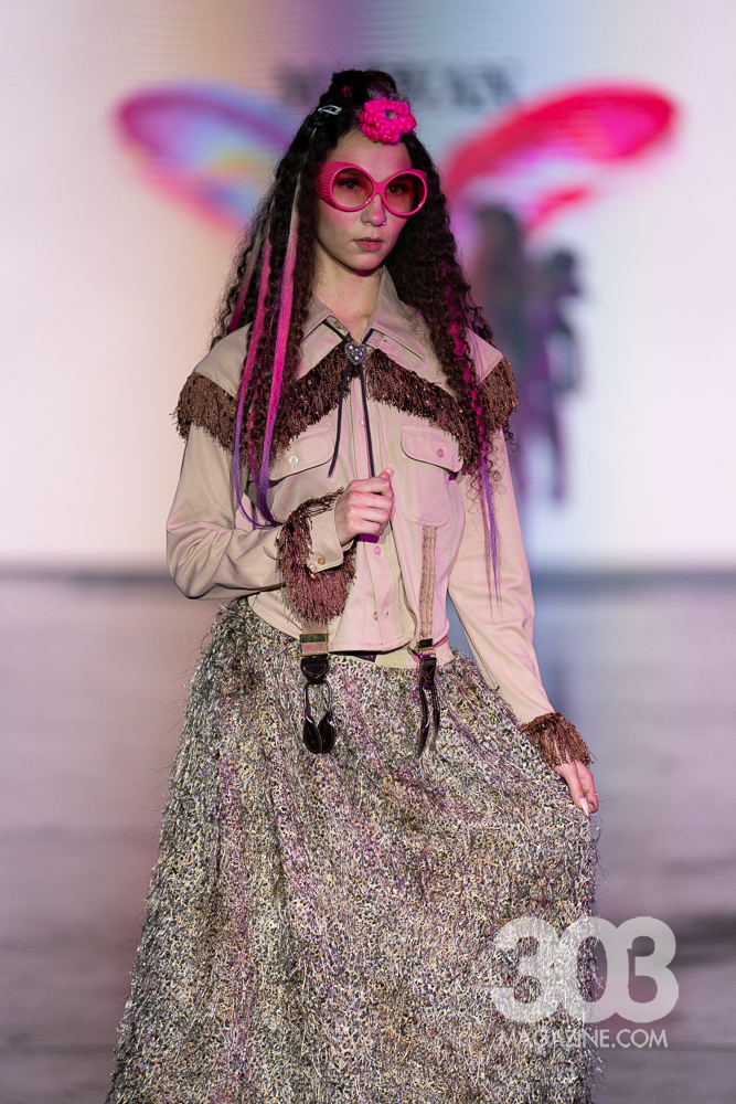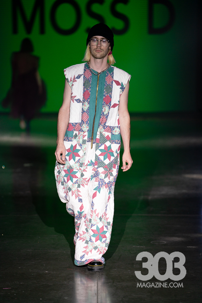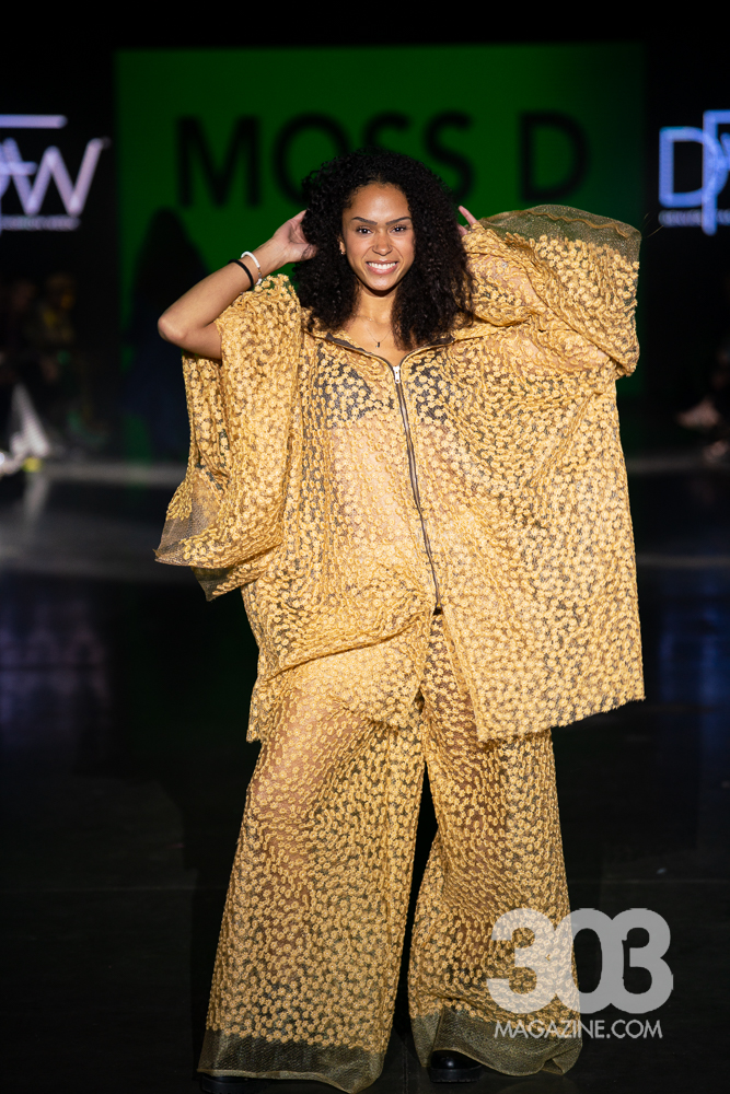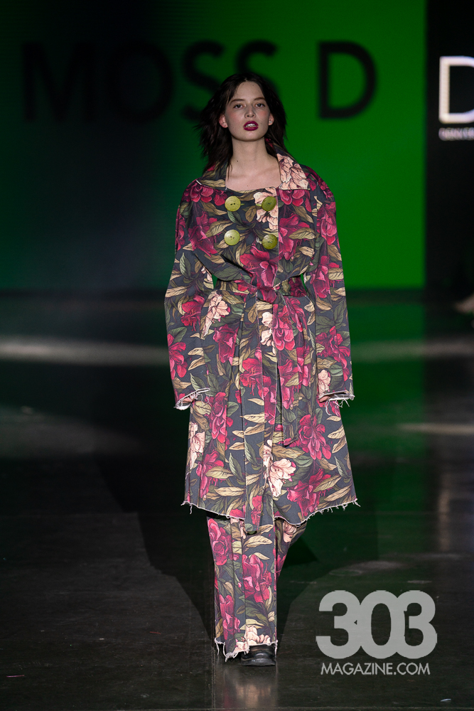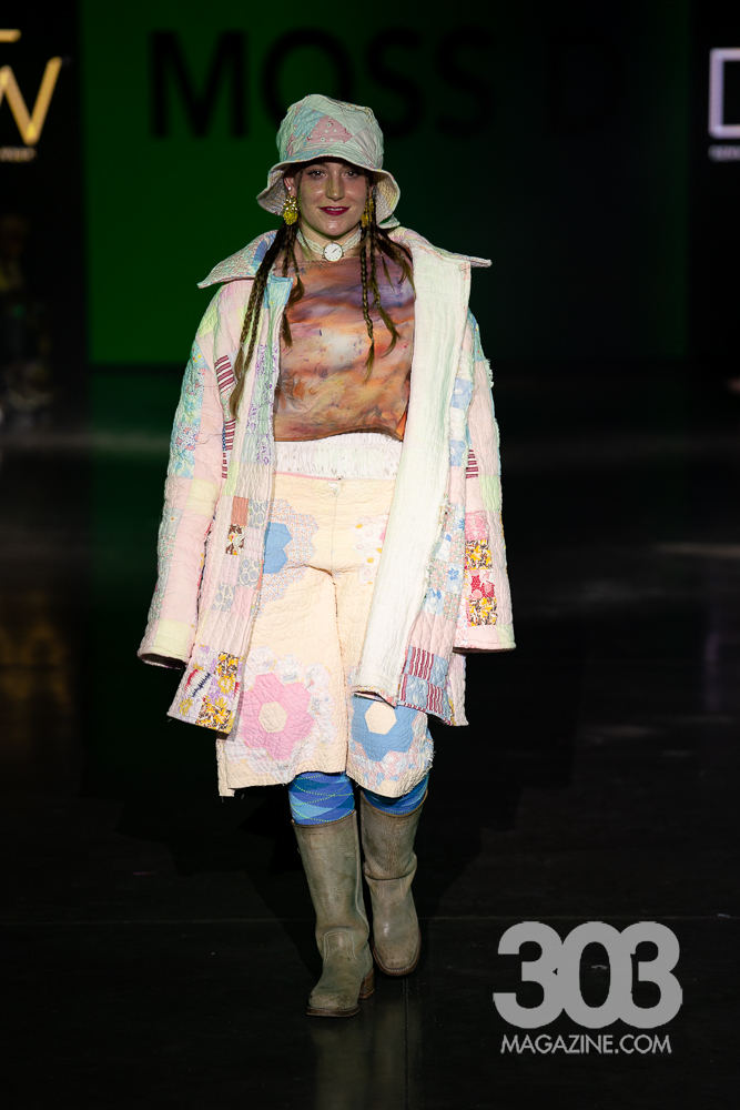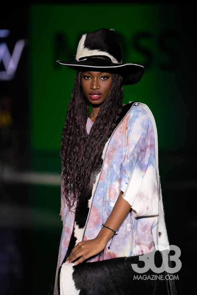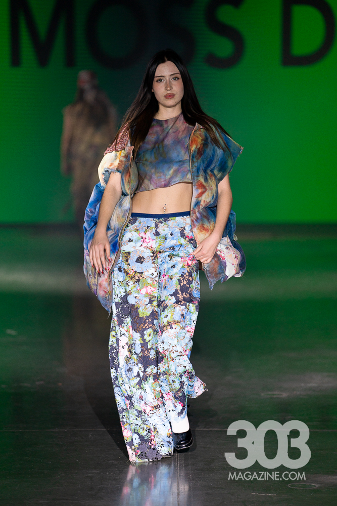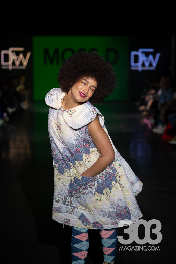 MOSS D designer Marcia Kay Davis was born for a maximalism theme. For her return to the Denver Fashion Week runway, her latest collection did not disappoint. From cow hide to Davis’s trademark florals, the entire collection had a natural and free-flowing feel, emphasized by the looks’ loose silhouette. Overall, the MOSS D collection brought comfort and joy to the runway, with models dancing down the runway and genuine smiles on their faces.