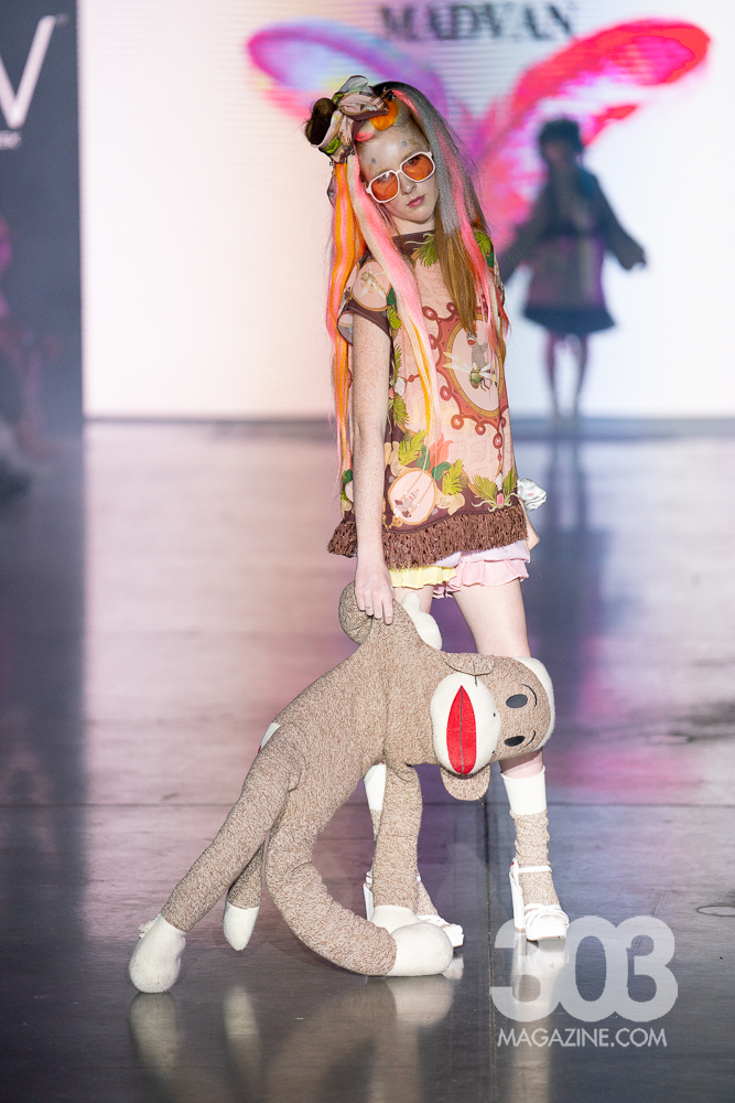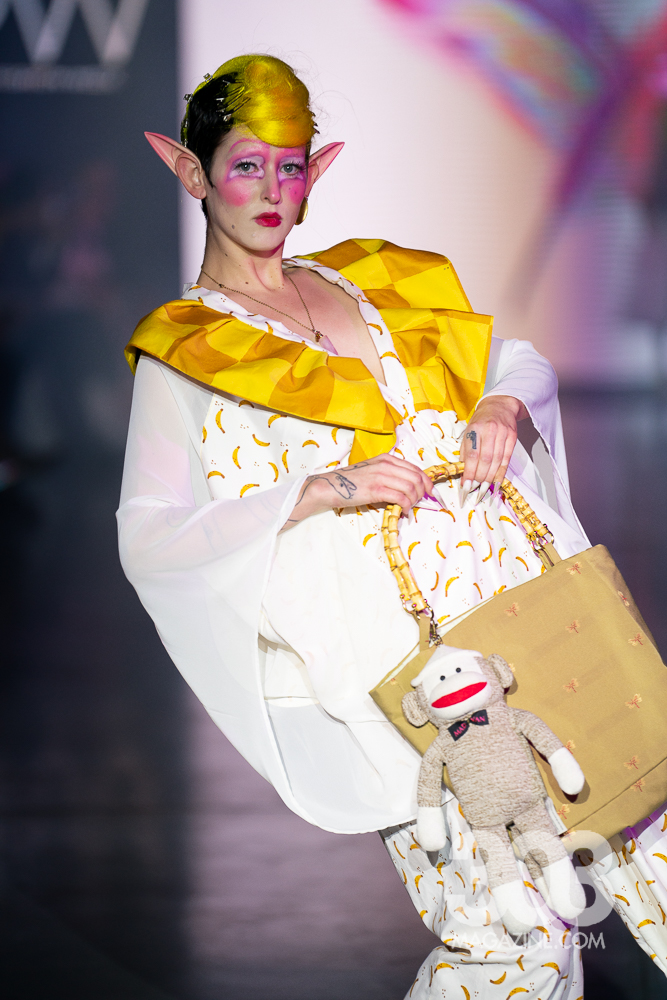 As such, the MadVan Design collection was equal parts precious and playful. Models carried sock monkeys down the runway. Each look was joyfully combined pastels and gentle tones with bright make-up and hair. The collection brought quirky and lively charisma to the stage, partially inspired by Harajuku girls. And of course, in classic MadVan style, a few of the looks centered around unique patterns — including unicorns and bananas (another nod to the beloved sock monkey).
