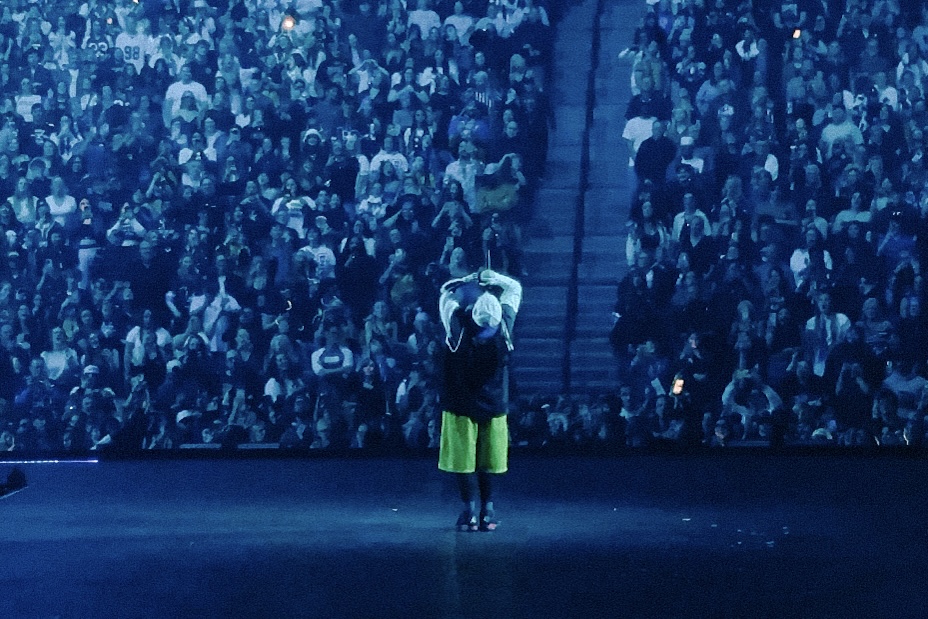 Billie then hushed the audience, sat at the center of the stage, and performed a live harmony loop of “When the Party’s Over.” For two minutes, the arena was eerily quiet, a sharp contrast to the near-constant roar of the crowd since the show began. Her angelic melodies floated through the air, serene and hauntingly beautiful. When she finished, she laid back on the stage as the lights illuminated her in a soft, white glow, adding to the haunting effect as she continued to sing. The audience joined in unison, every voice hitting each lyric perfectly, turning the moment into a breathtaking shared experience.