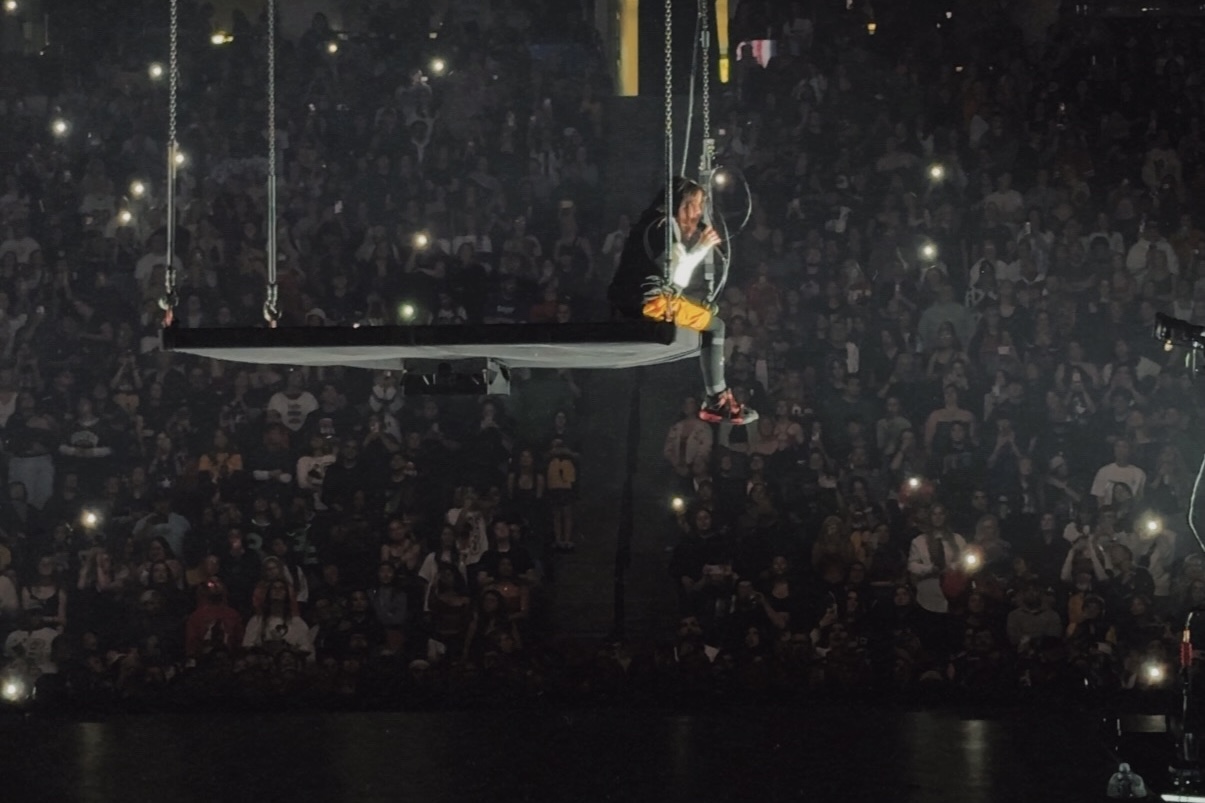 The stage was a large rectangle placed at the center of the stadium, with a towering box in the middle and band pits flanking both sides. Overhead hung a massive jumbotron, ensuring no detail of the performance went unseen. The crowd surrounded the stage from all angles, making it the epicenter of the night’s energy. This setup created a uniquely intimate experience, allowing fans to see every angle of the performer and become completely immersed in the visuals. No matter where you looked, the stage was surrounded by thousands of screaming fans, their collective excitement forming a palpable, electric presence that never wavered.
