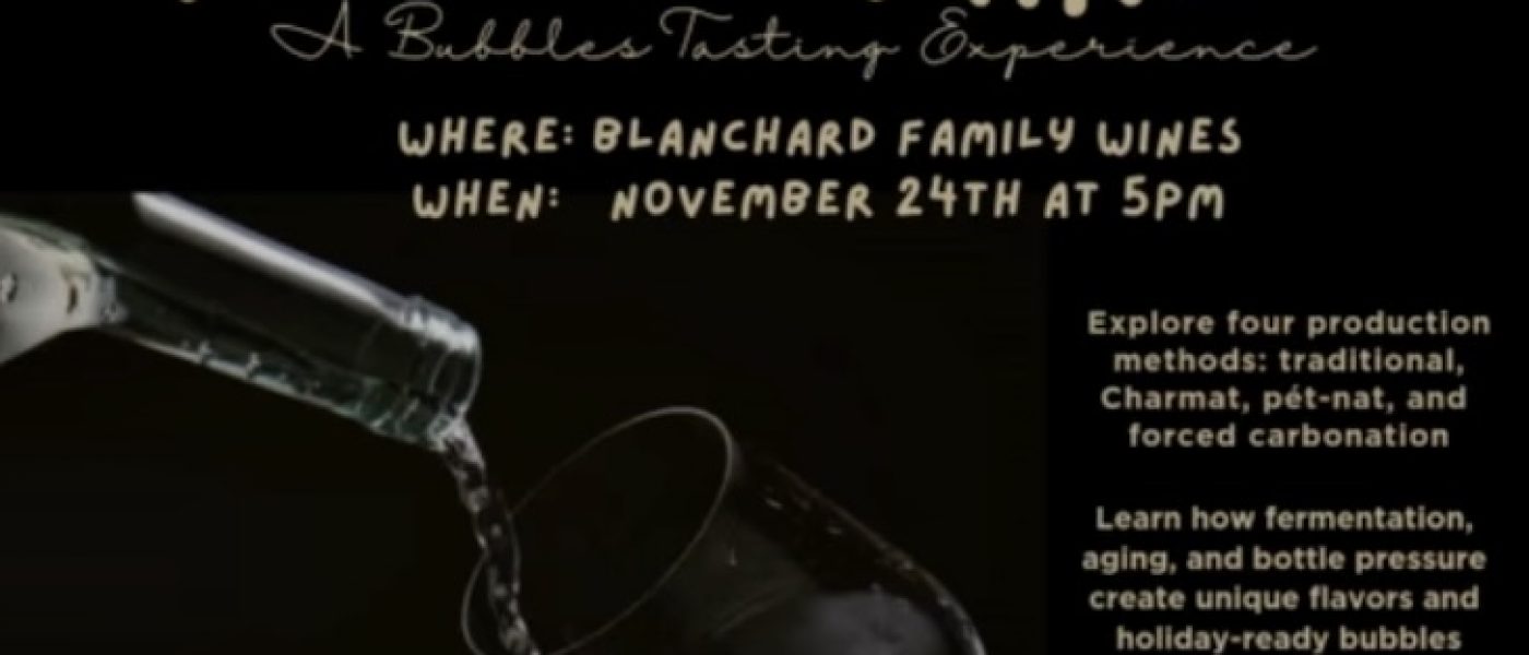 The Lowdown: Blanchard Family Wines brings this festive tasting experience to you, where you may try four methods of sparkling wine production with wines made in Colorado and California. James Blanchard will guide guests through the explanation of the four sparkling wines, including the secrets behind their sparkles and how fermentation, aging and bottle pressure affect the wine.