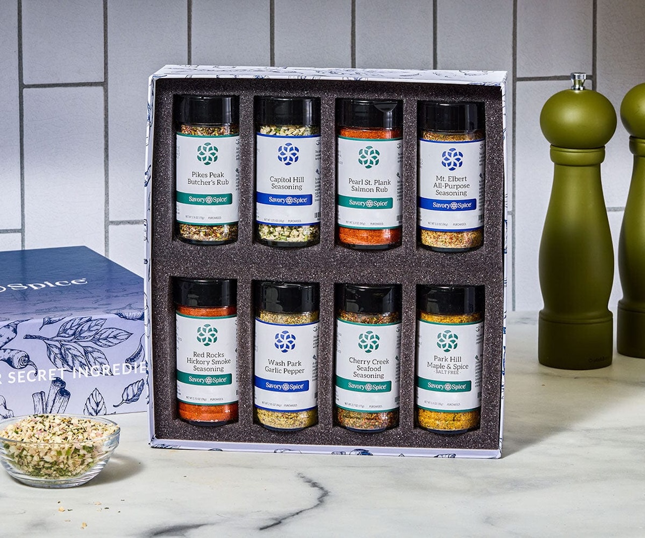 What’s included: Pikes Peak Butcher’s Rub, Capitol Hill Seasoning, Pearl St. Plank Salmon Rub, Mt. Elbert All-Purpose Seasoning, Red Rocks Hickory Smoke Seasoning, Wash Park Garlic Pepper, Cherry Creek Seafood Seasoning, Park Hill Maple & Spice.