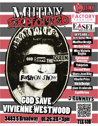 What to Expect: Factory Fashion is producing A Tribute to Vivienne Westwood Fashion Show at Mutiny Comics & Coffee (formerly Mutiny Information Cafe) 3483 S Broadway, Englewood, CO 80113 and EASEL Englewood Art Studio, Events & Lessons, 3485 S Broadway, Englewood, CO 80113. This show features designers SKYEAIRE by Skye Barker Maa, MadVan Design, My Gen Swim, Miss Victoria Regina, Ephemeral Concrete, Tokiprism, Second Wave, Shara Jean King, Charlie Price, Sin in Design, glam-it colorado, and Equilibrium.