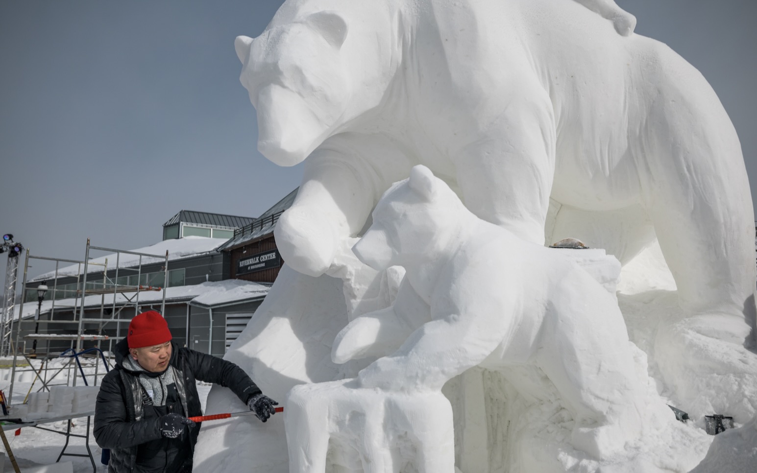 After sculpting from Jan. 20 – 24, the viewing week is currently underway through Jan. 29. At any time, the Riverwalk Center is open to the public to stroll through and admire the temporary outdoor art gallery.