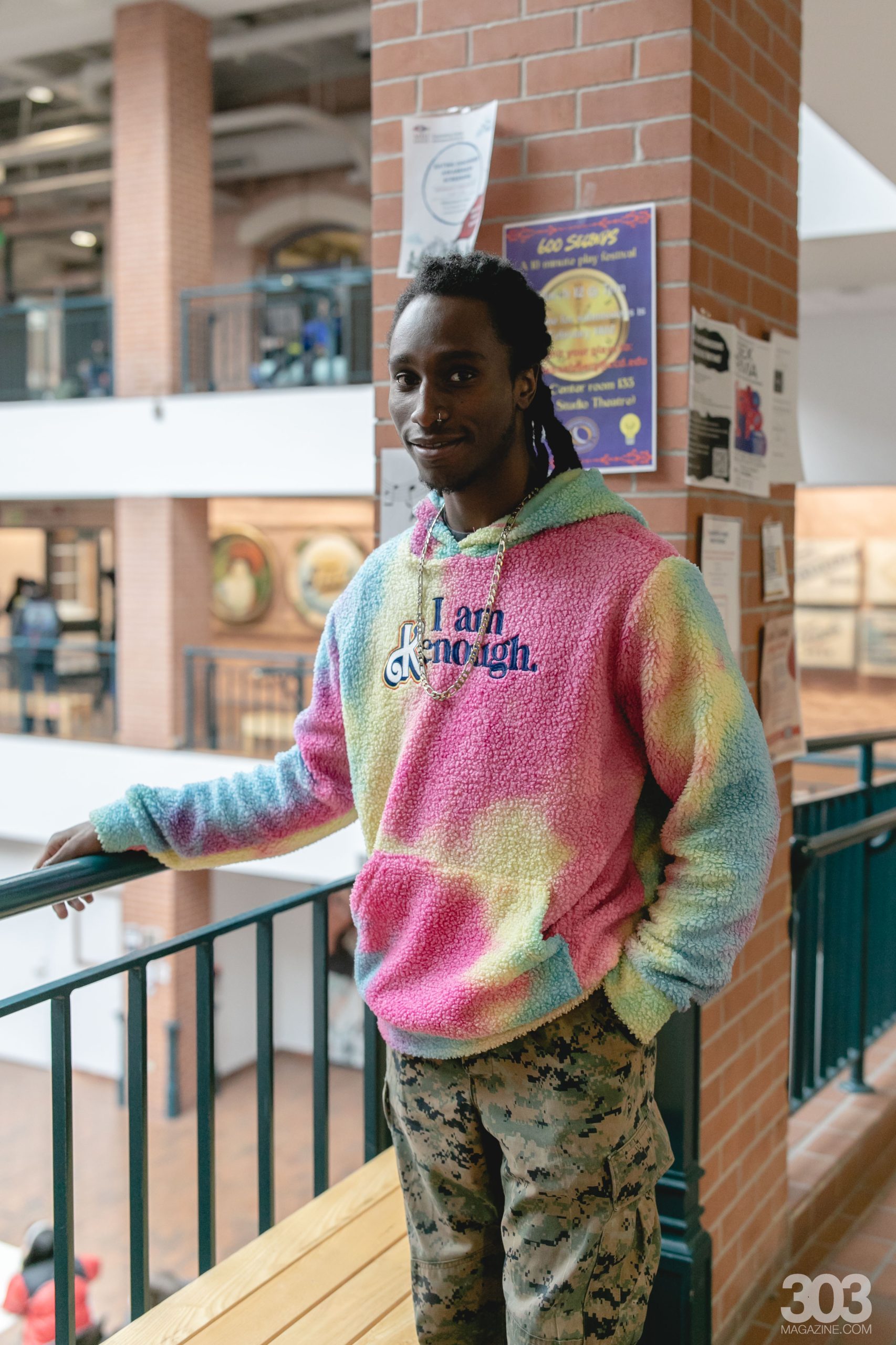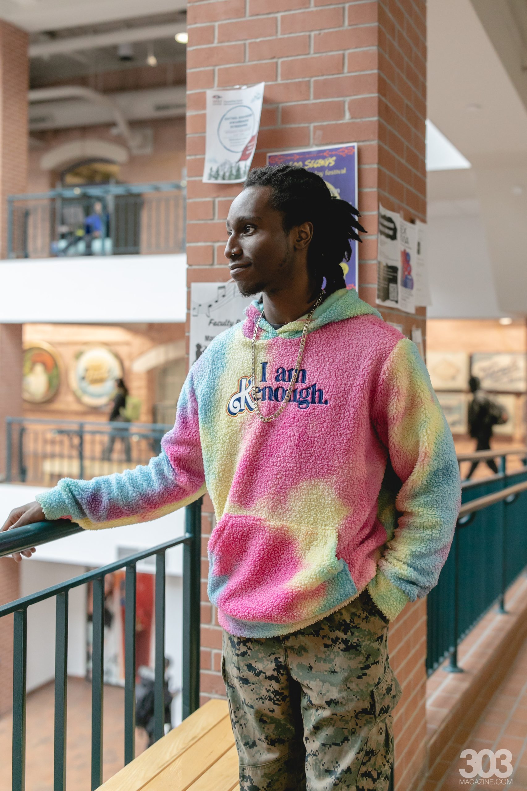 The cold day never stopped these students from shining, but when asked if their outfits were inspired by the weather I was met with surprising feedback. The first student I met was named Trey. Trey dressed in a rainbow “I am Kenough” fleece hoodie and veterans camouflage pants. “Today I want to be cozy and confident and that’s kind of my goal everyday, I wore this hoodie because I know I am Kenough,” said Trey.