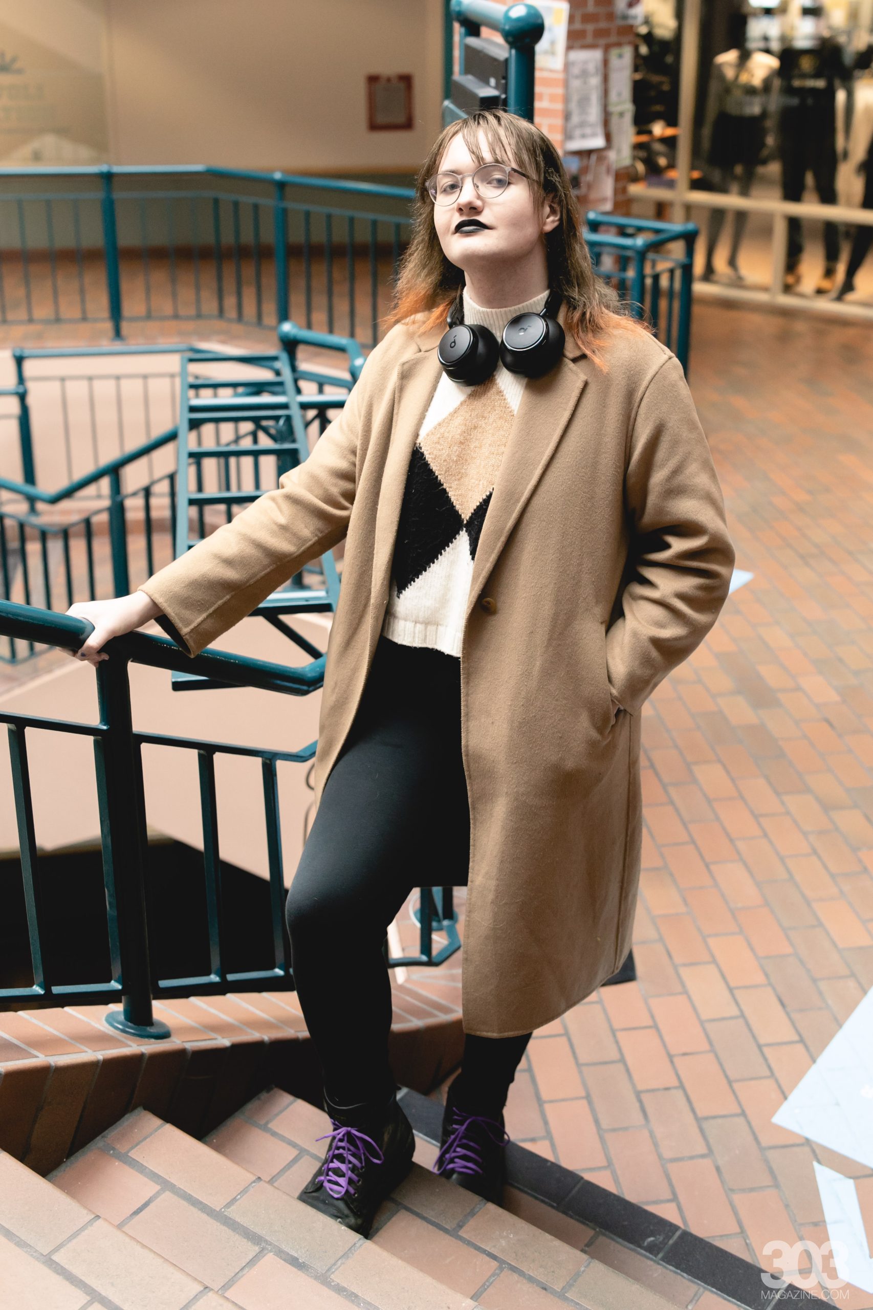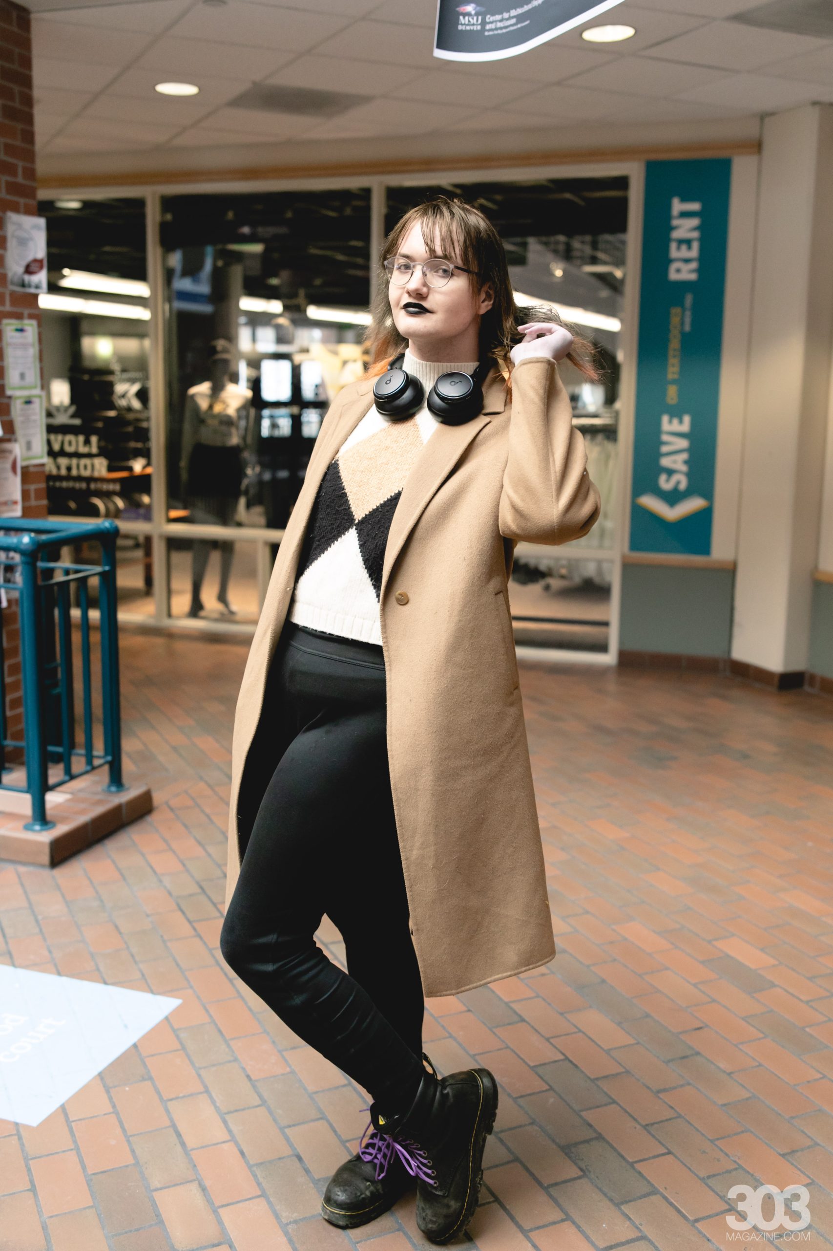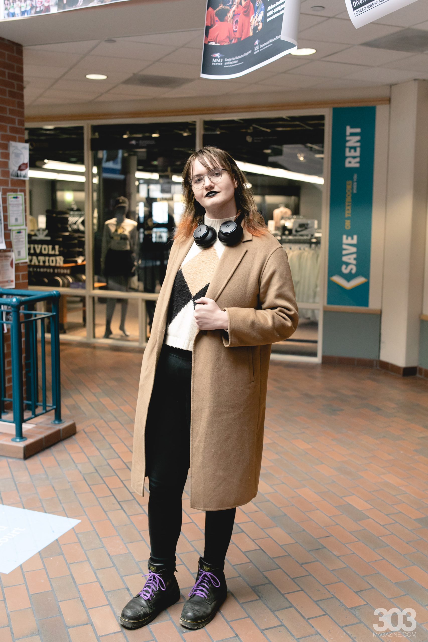 The last Denver student we spoke too wore more neutral colors, with the tans and blacks in their clothing making their purple shoe laces stand out. Clare’s black lipstick drew this look from classic to dark academia.