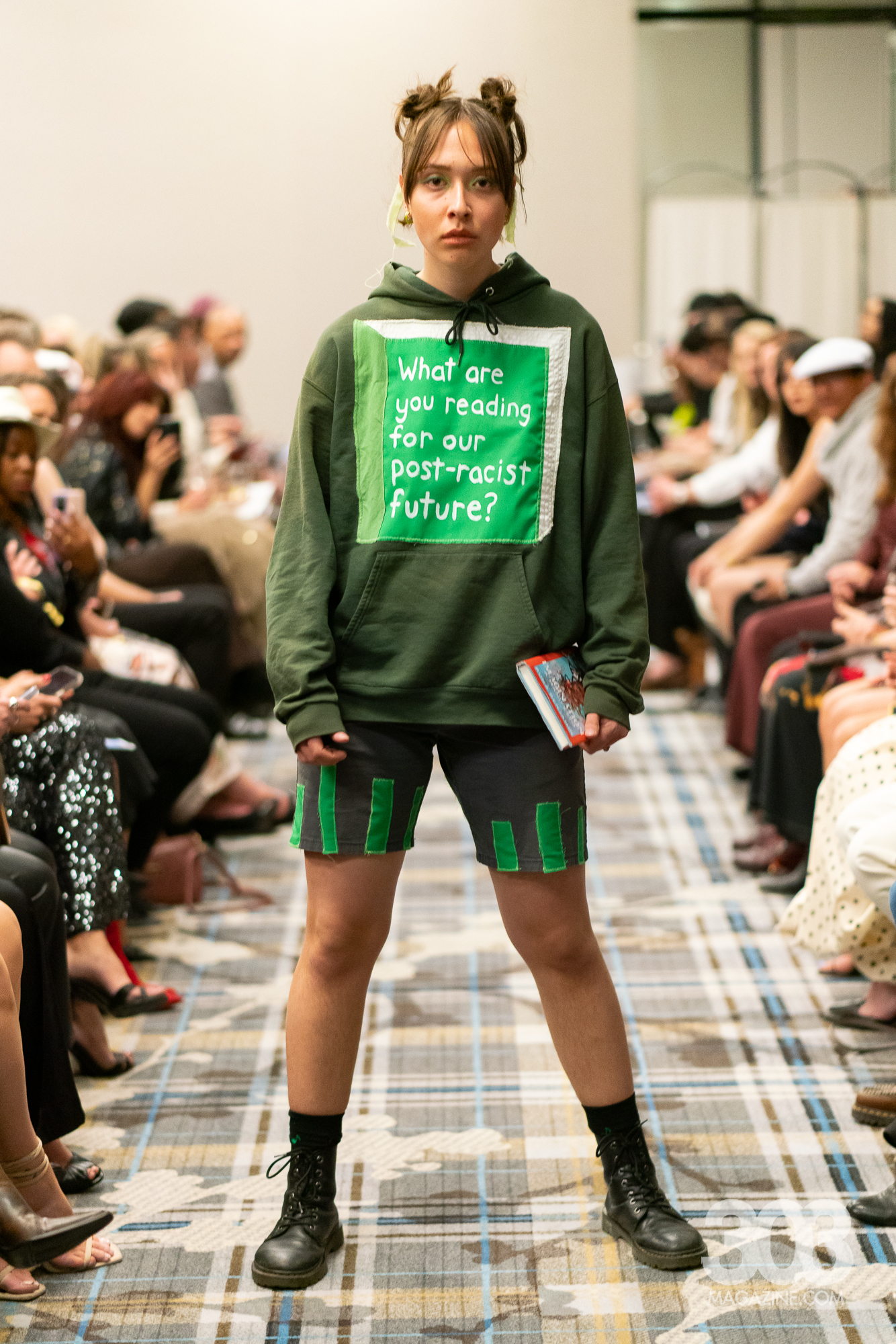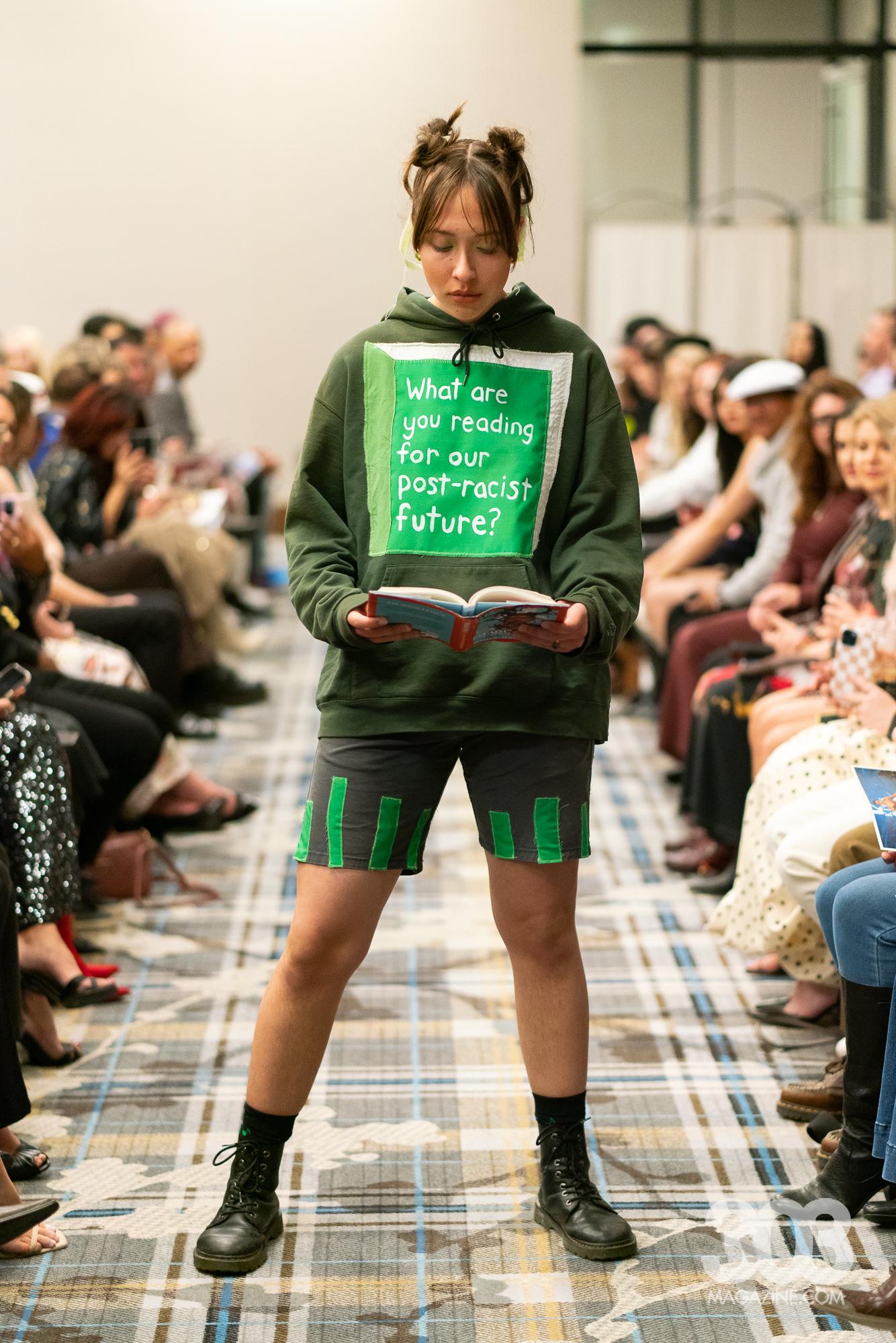 Medicine Mender aka Sarah Fitzpatrick created circular fashion with a statement. Made from sustainable fabrics, these pieces included quotes that spoke to Fizpatrick’s eco-friendly vision, stating “what are you reading for our post-racist future” and “there’s already enough clothing to clothe the next 6 generations”.