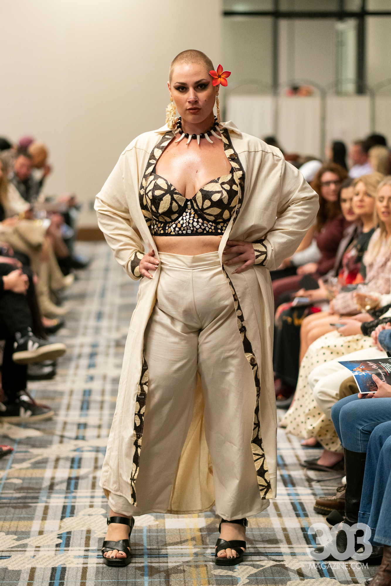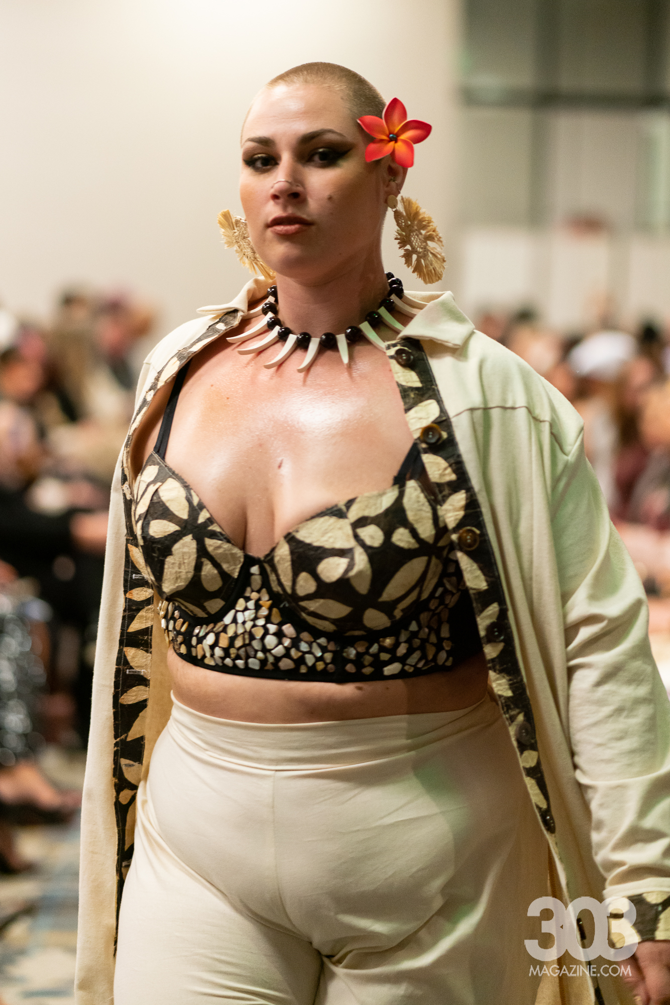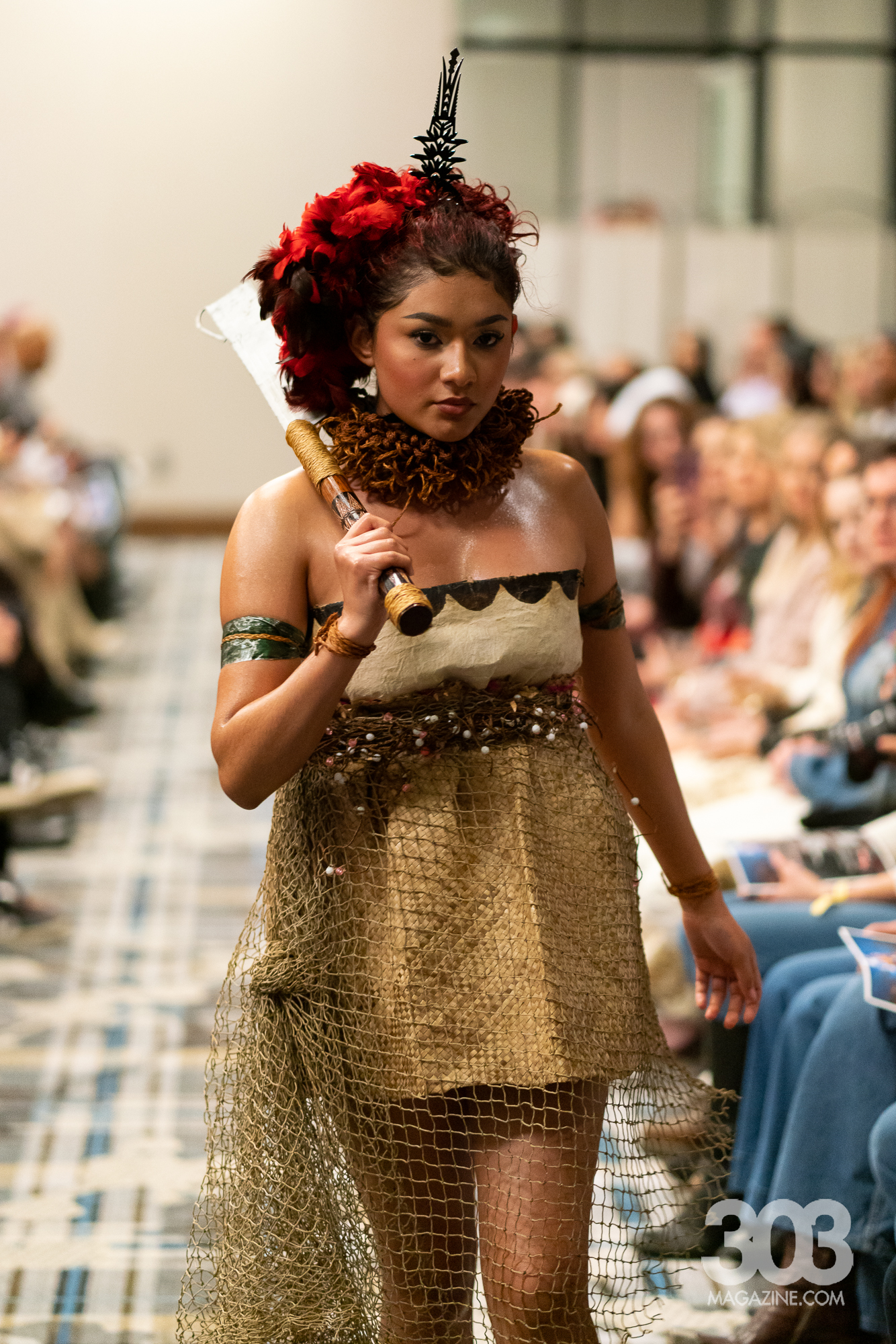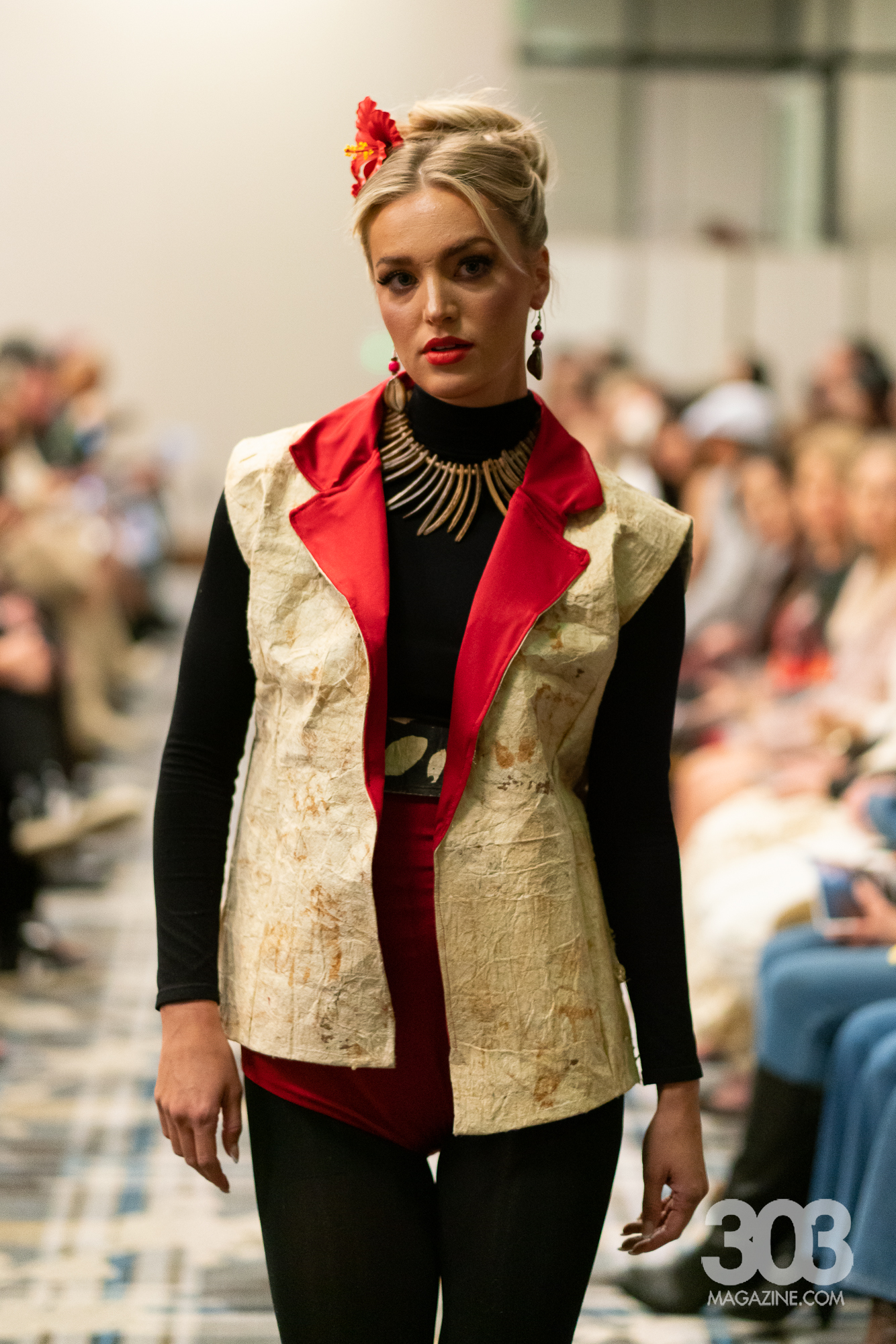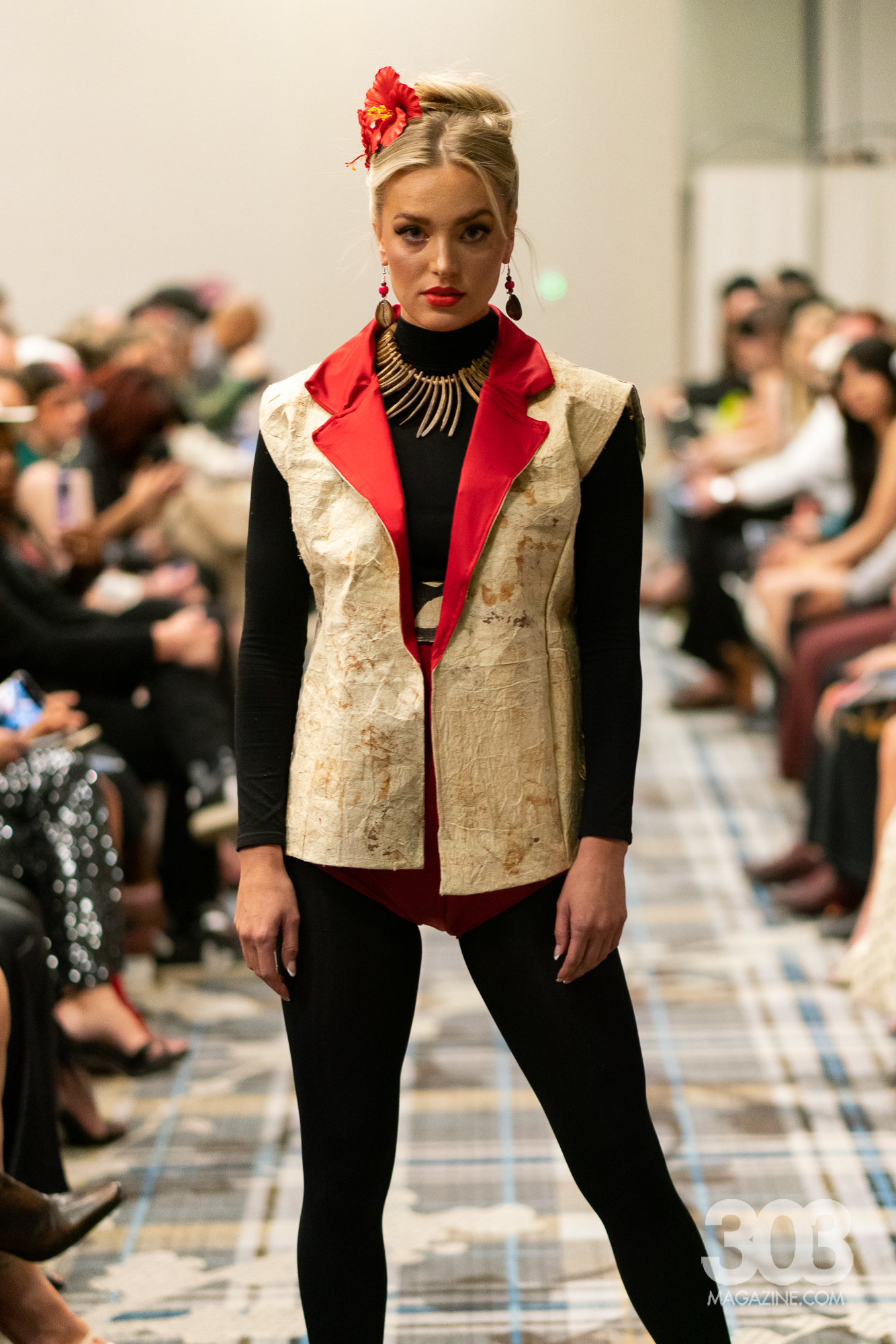 Timeless Trends aka Katherine Peko-Mavaega had her models strut down the runway in her classic pieces inspired by her Pacific Island roots. The collection was made up largely of earth tones with tasteful pops of red, including traditional Pacific Island accessories against modern silhouettes. The judges noted that they “haven’t seen something like this done before at Denver Fashion Week” which certainly swayed their vote.