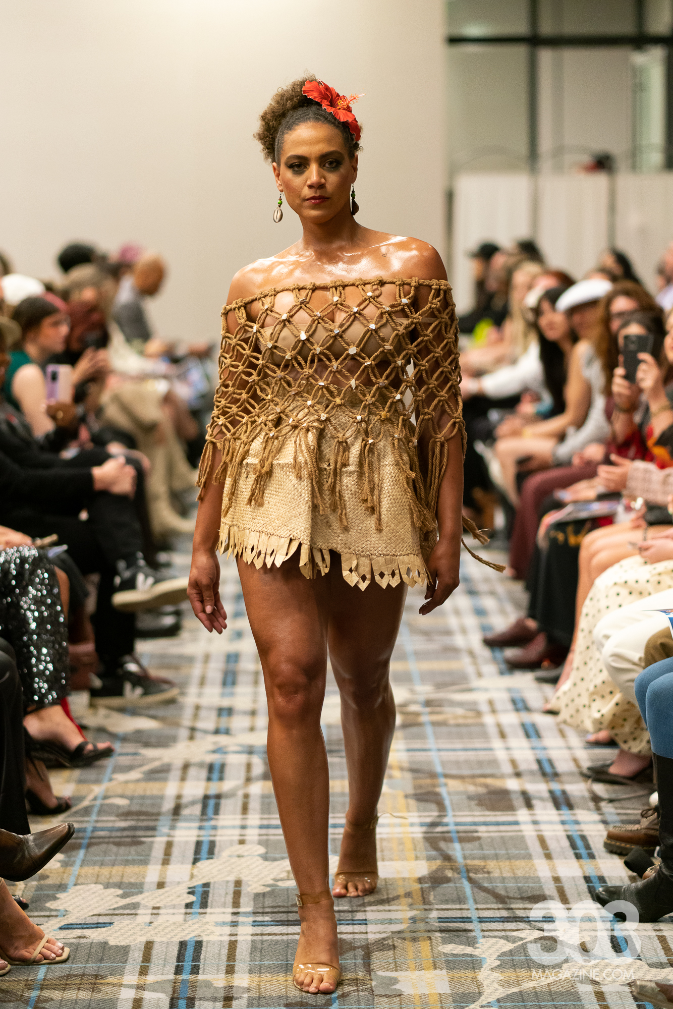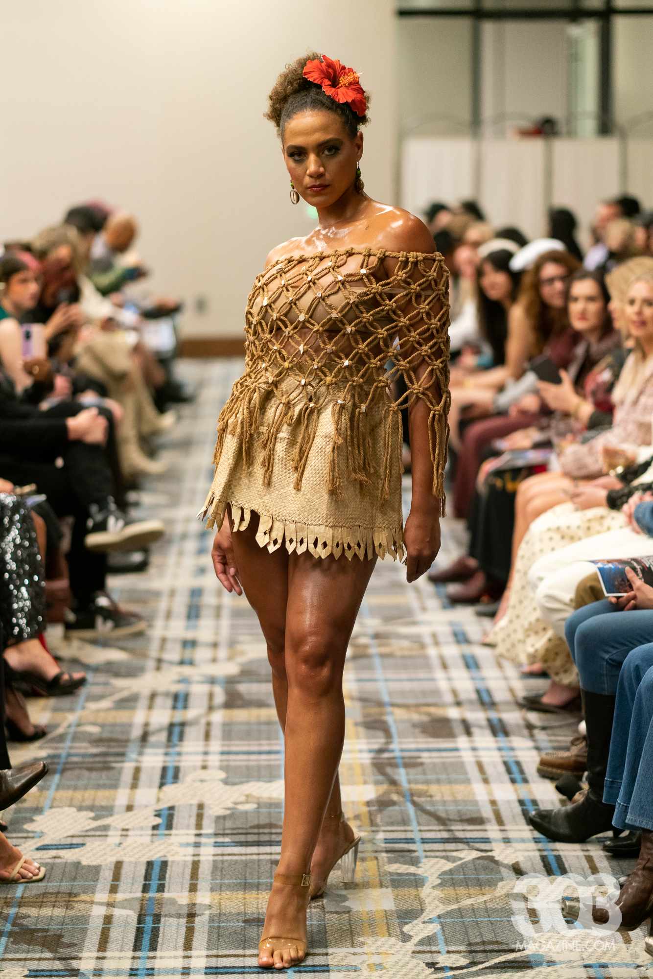 Nohealani aka Jasmine Lee’s presented a seamless and cohesive collection that payed tribute to her Hawaiian heritage. These pieces brought color and warm island energy to the runway, even thoughtfully matching each models’ makeup looks to their clothing.