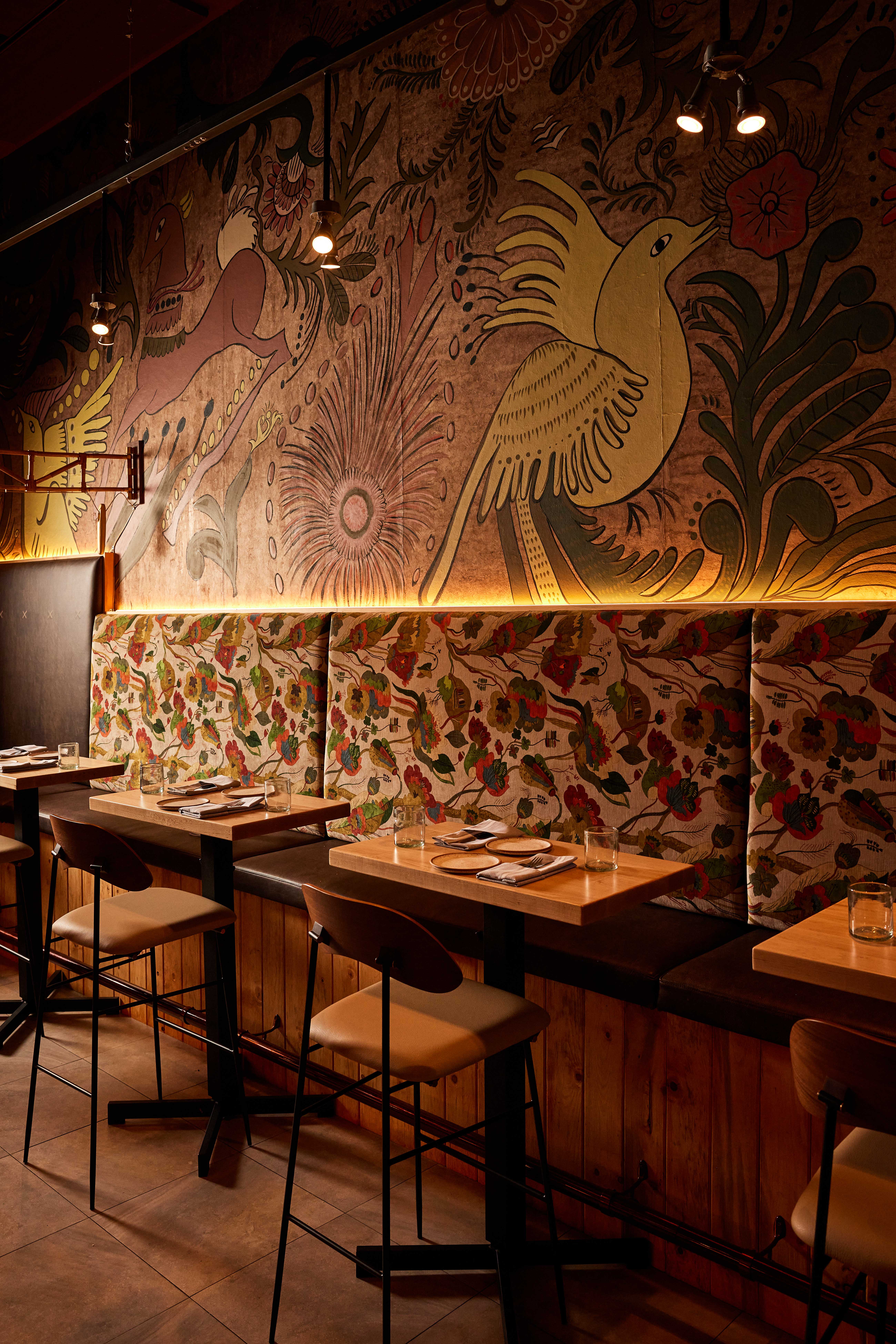 As transportive as the menus are, Mezcaleria Alma finds even more CDMX nostalgia in its space. Working with Agatha Jane Interior Design, the vibrancy on the plate and the effervescence in the glass is matched by the mosaic behind the ladder-clad ceiling-height bar shelves, the embroidery of the floral booth backs, and the smattering of art. “We want Mezcaleria Alma to embody the essence of a traditional mezcaleria,” explained Kasie, “blending rich textures, native materials and vibrant greenery. Together with the design team, we’re able to do so by incorporating treasures from Johnny’s travels to Mexico City throughout the space and creating a focal centerpiece – a mural on traditional bark paper by local LatinX artist Maria Morante, a powerful homage to Mexican folk art.