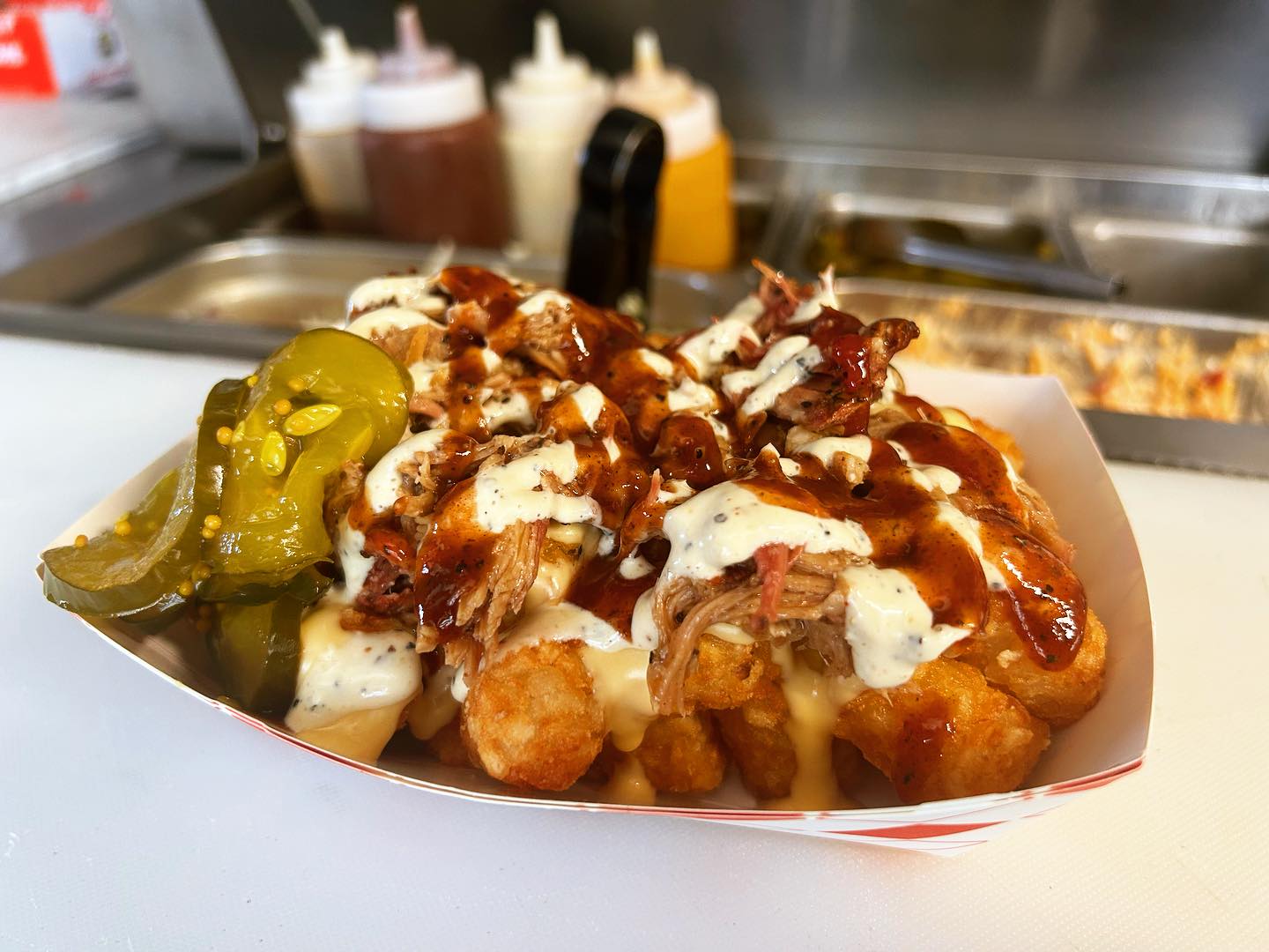 Other standouts on the menu include pimento cheese featured on the Fried Chicken Biscuit Sandwich and in the Mac ‘N’ Cheese, as well as the standout Nashville Hot Sandwich and Pulled Pork Sandwich on a Squishy Bun. To finish your meal with a sweet treat, Mama Jo’s offers Fried Banana Pudding Pie and Apple Fritters drizzled with salty butterscotch. Everything is scratch-made—well, almost. “The only thing we don’t make from scratch is the tater tots,” Jodi joked. “Because we’re not crazy.”