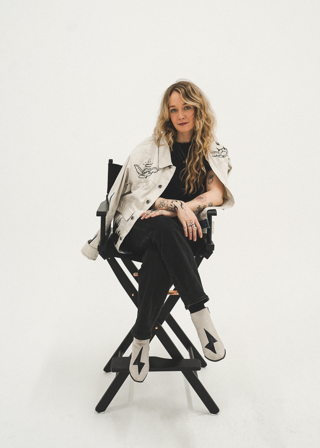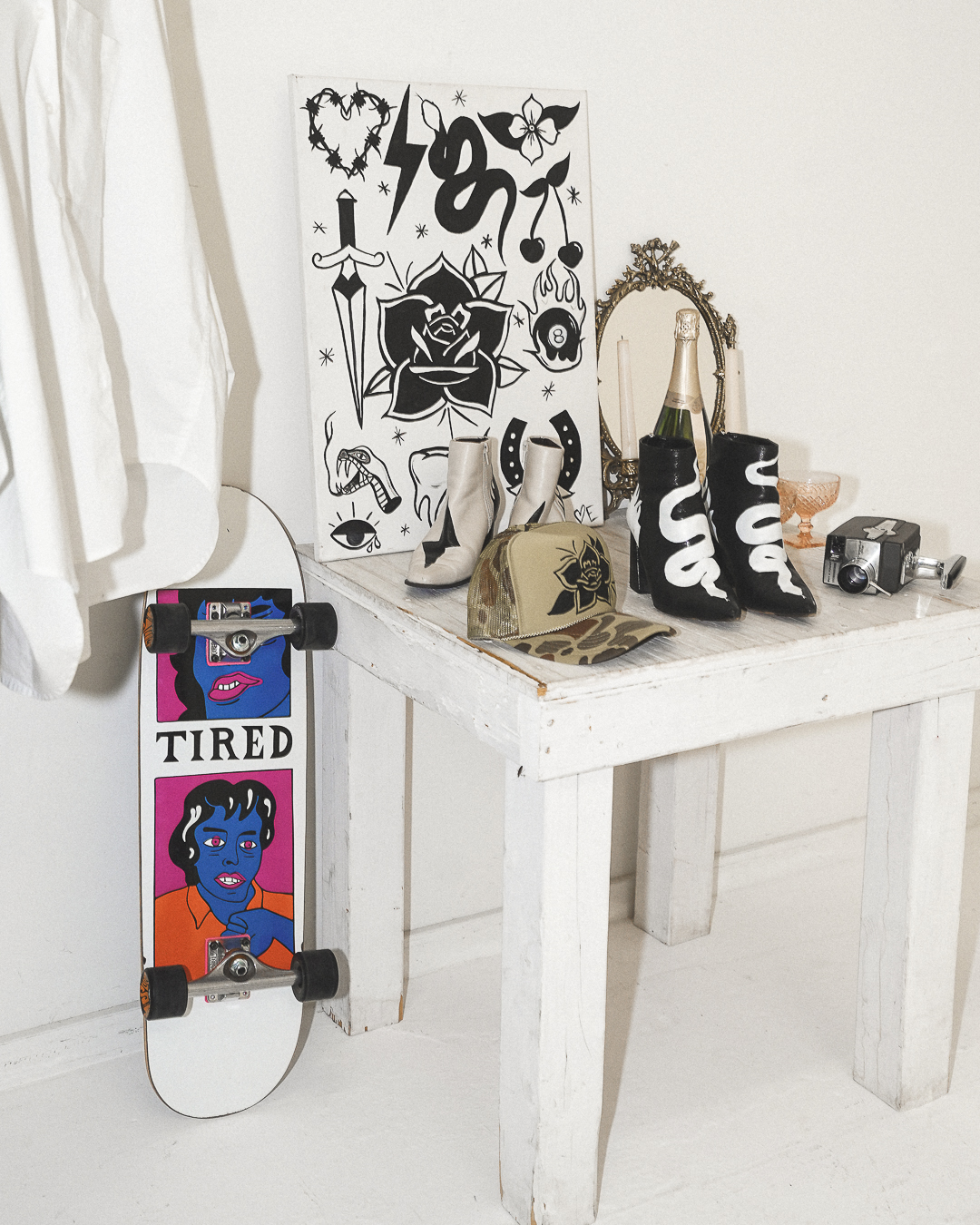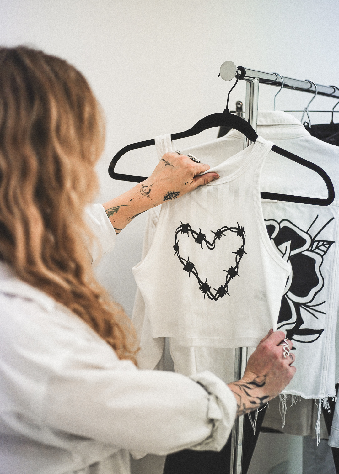 Once the garments were sourced (all secondhand) she approached each item as a canvas, painting bold tattoo-inspired designs that embodied the spirit of rebellion and self expression.