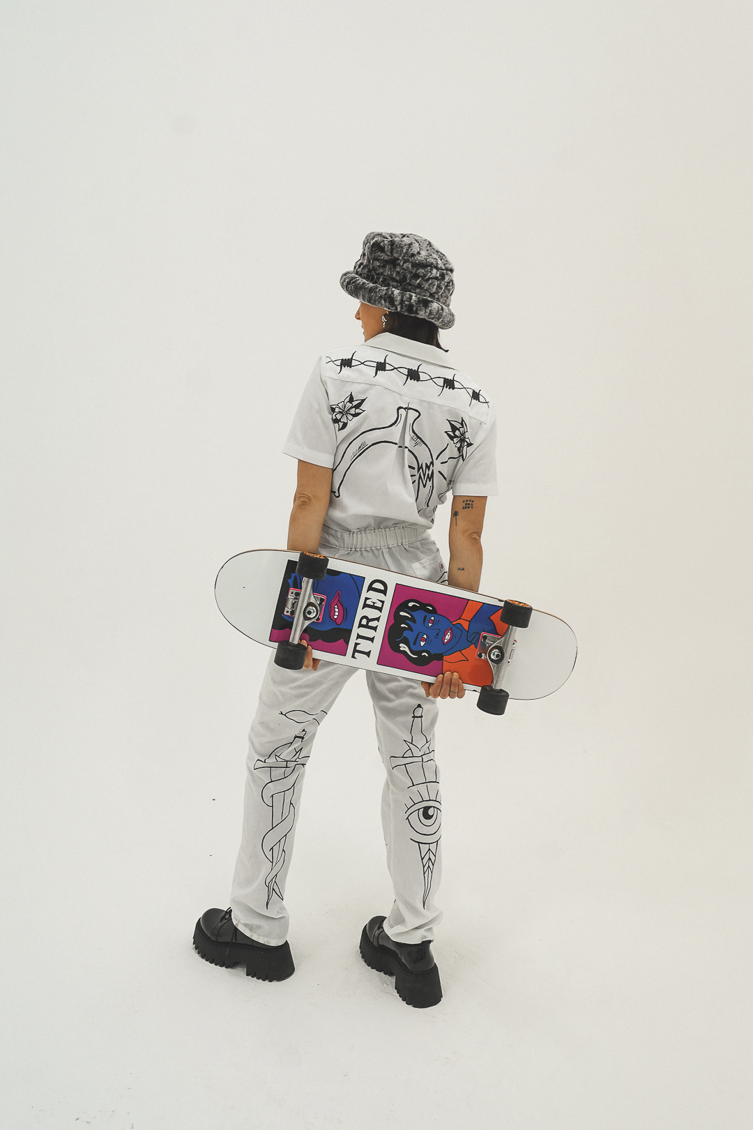 Initially, Strunk didn’t create with the intention to sell. “I wanted to take a break from making art to sell and just make something for myself,” she shared. That moment of personal expression turned into a white pair of coveralls, covered in her illustrations, snakes, bugs and bold tattoo inspired linework.