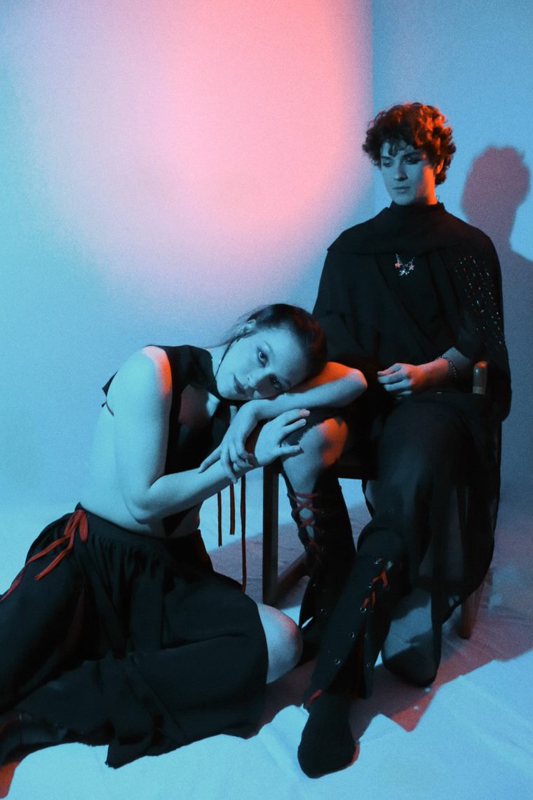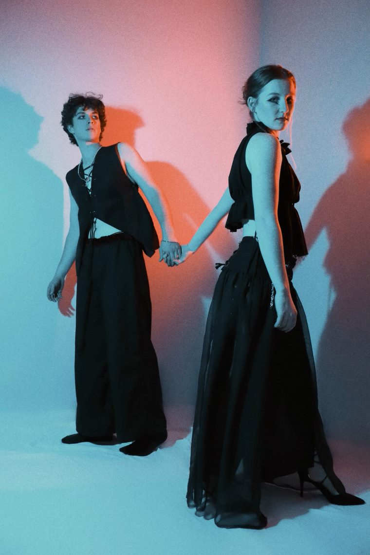 Mk.gee has a very layered production—glitchy guitars— that inspired me to play with mixed materials. I genuinely just used any black fabric I could get my hands on and hodge-podged them together until they made sense (or complete lack of sense, depending on the way you look at them). Asymmetry played a part in this collection as well, which was drawn from the emotion duality of the album. Two Stars equals Two Selves. This fractured identity that is mentioned throughout the album also manifests itself in the intentional frayed/unfinished hems. But it has a quiet side to it as well, which is represented by soft, flowing silhouettes. It feels like dancing in slow motion.