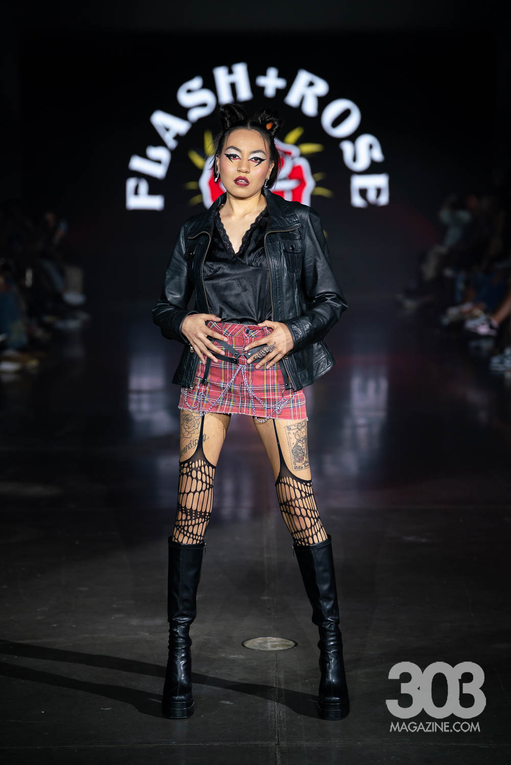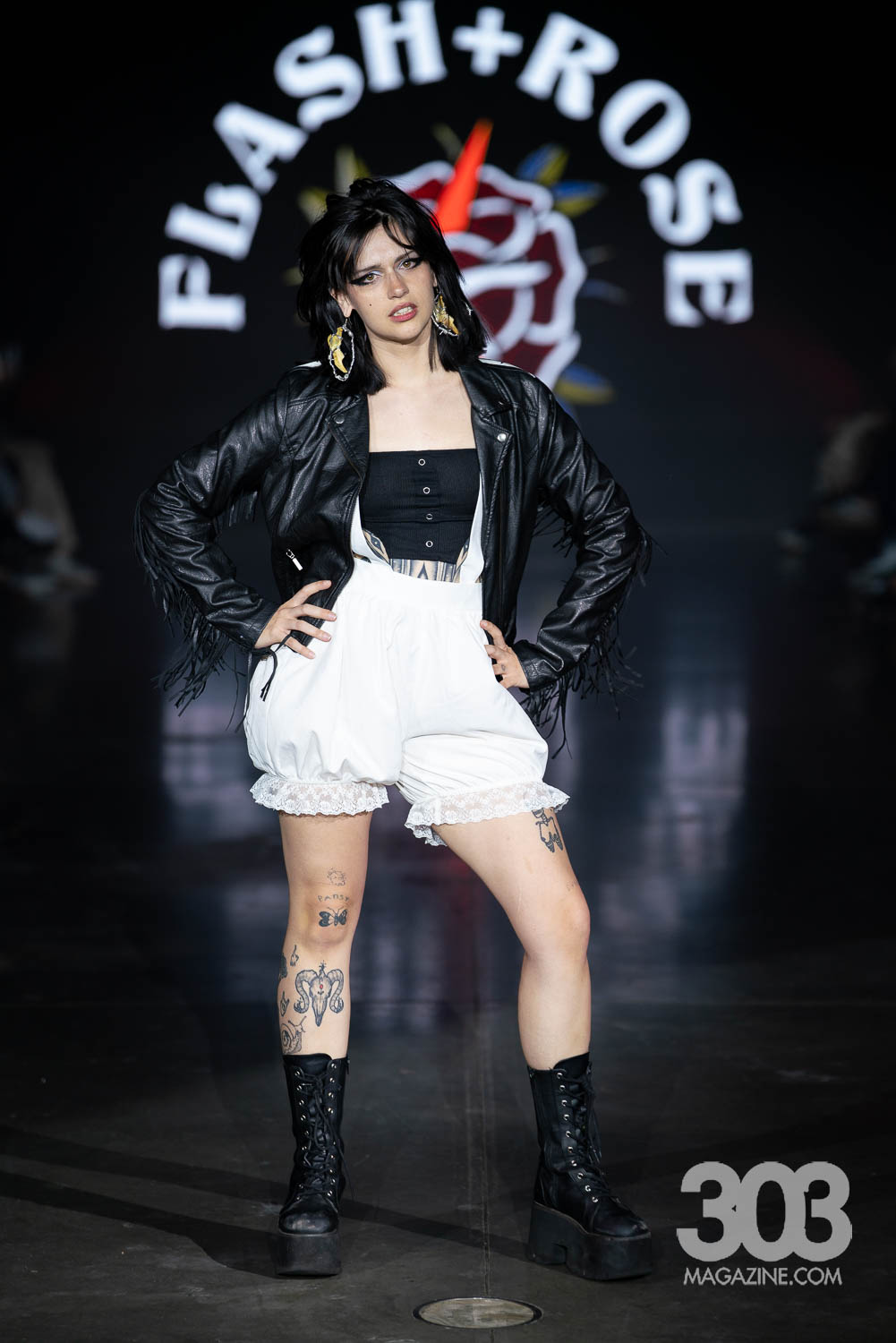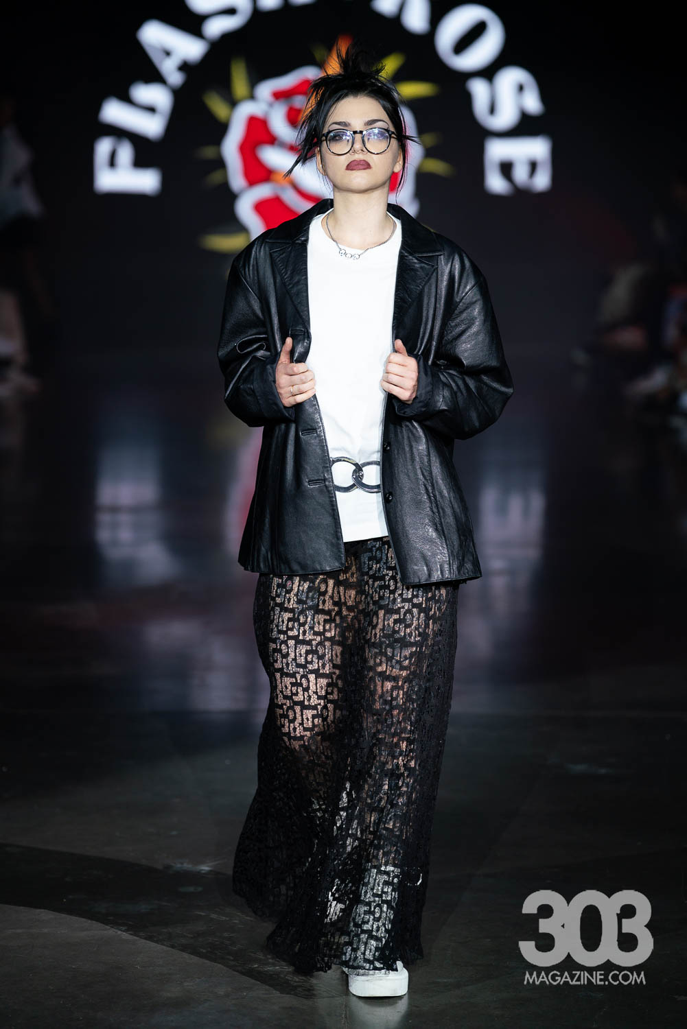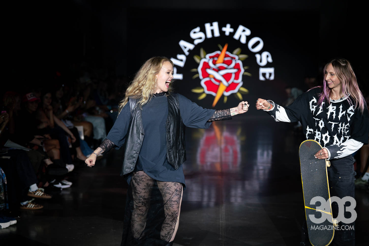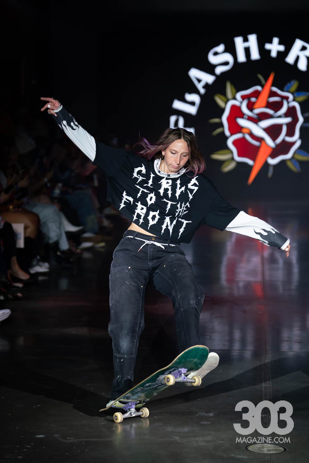 Flash + Rose’s runway look “For The Grrrls,” radiated pure tough-girl energy, turning the catwalk into a battleground of bold confidence and fearless fashion. The first model was a co-founder of Girls Skate Denver, an organization that empowers girls and builds confidence through skating. She skated down the runway to open the collection, setting a gritty energy for the rest of Flash + Rose’s segment.