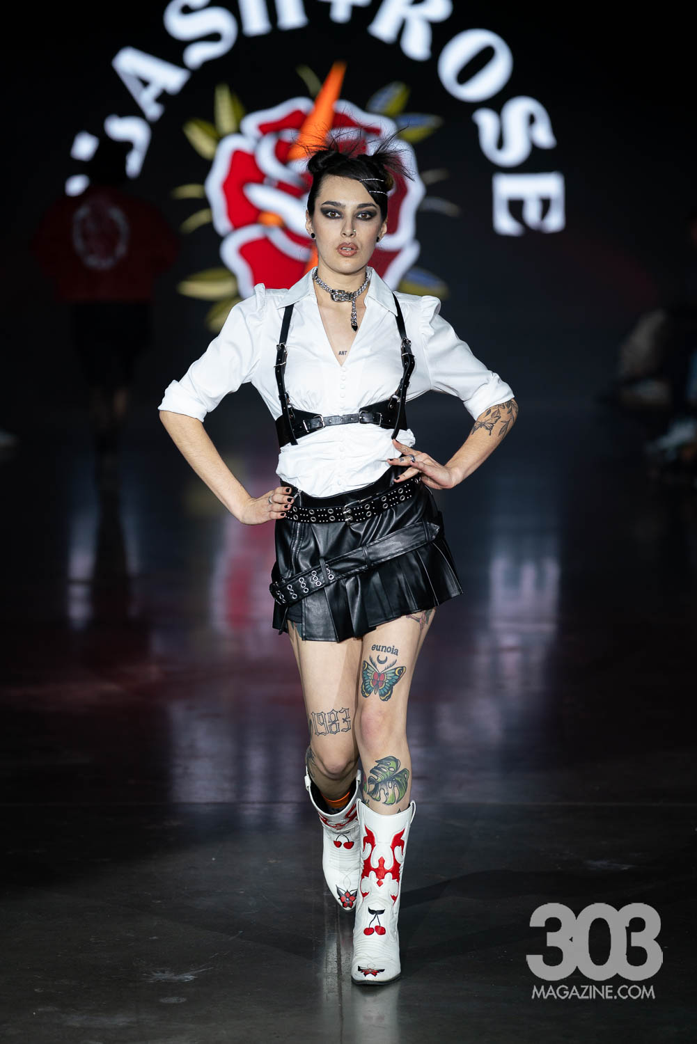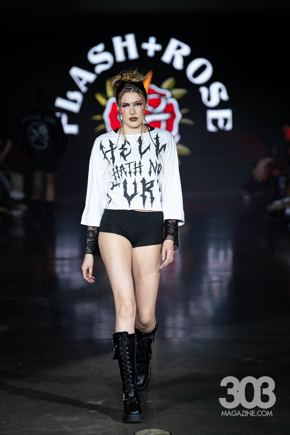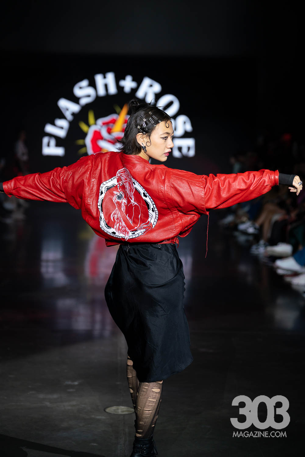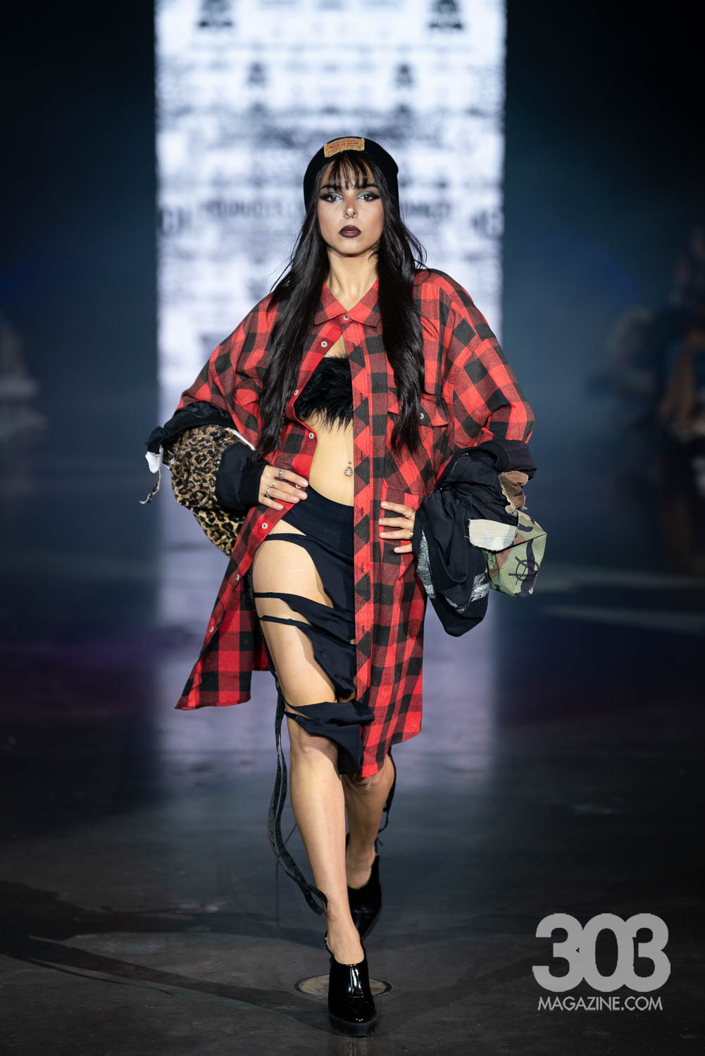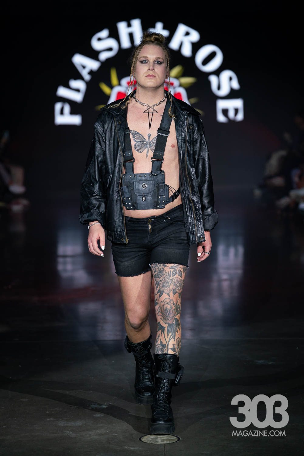Flash + Rose’s runway look “For The Grrrls,” radiated pure tough-girl energy, turning the catwalk into a battleground of bold confidence and fearless fashion. The first model was a co-founder of Girls Skate Denver, an organization that empowers girls and builds confidence through skating. She skated down the runway to open the collection, setting a gritty energy for the rest of Flash + Rose’s segment.
