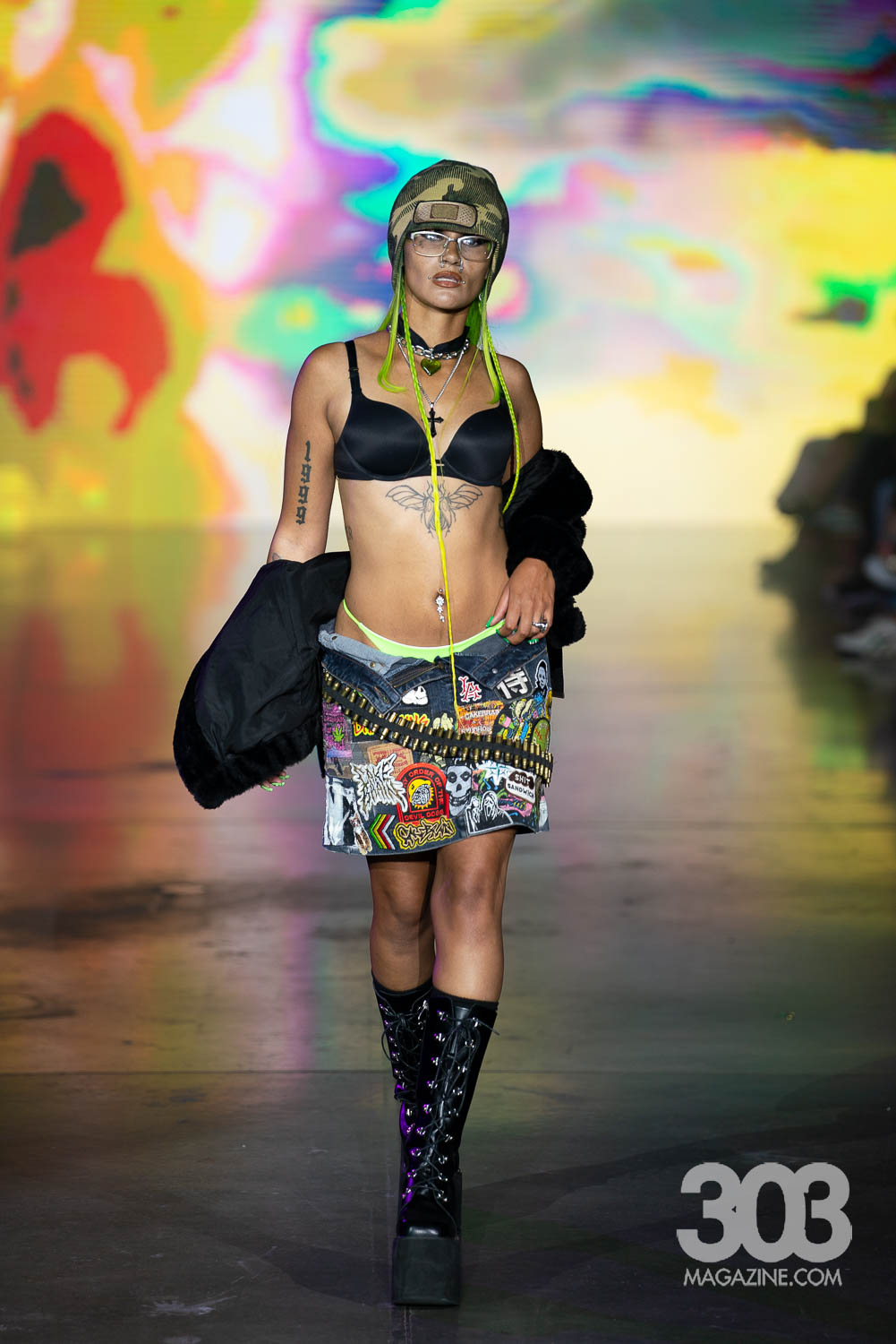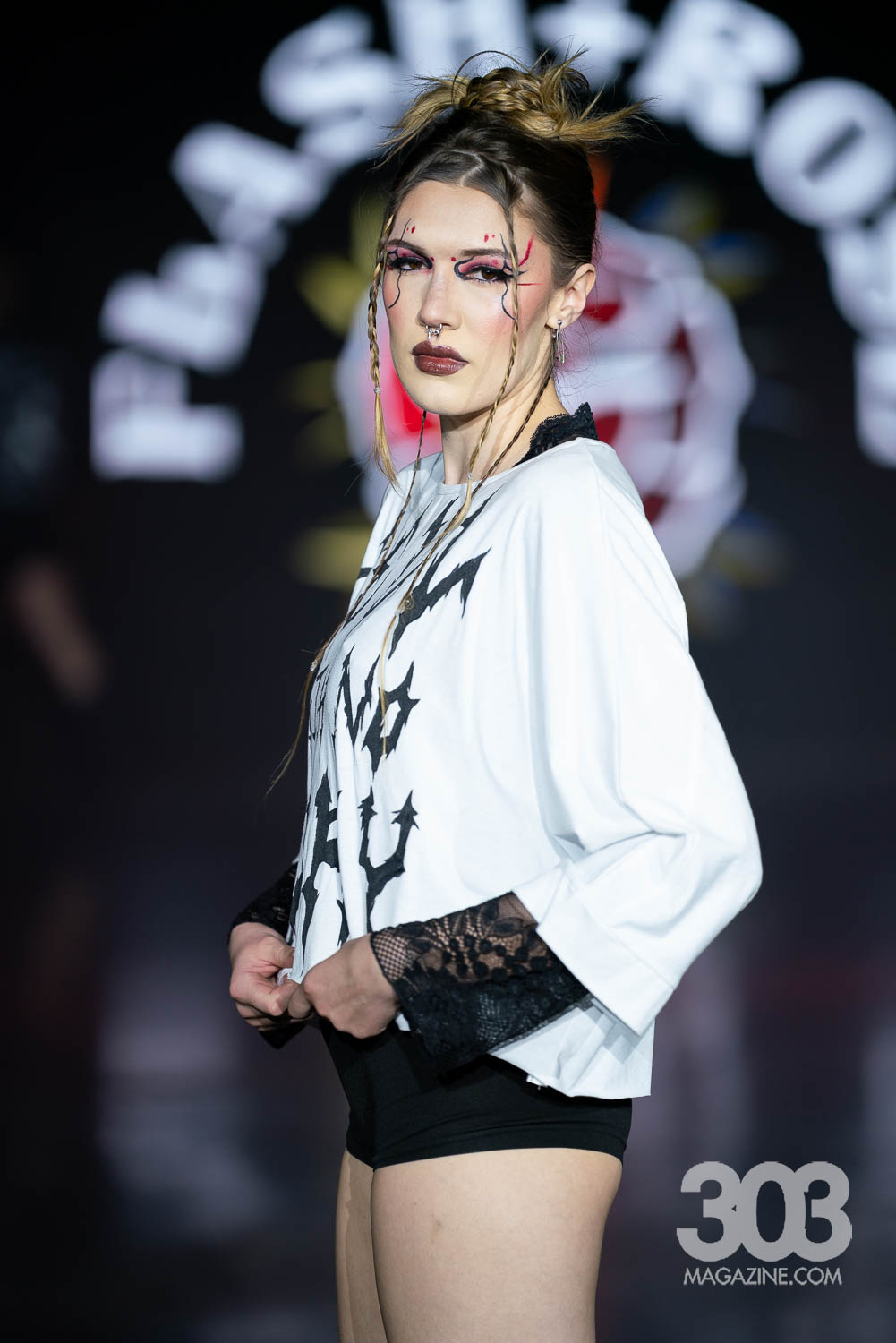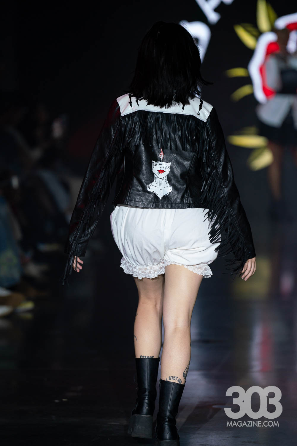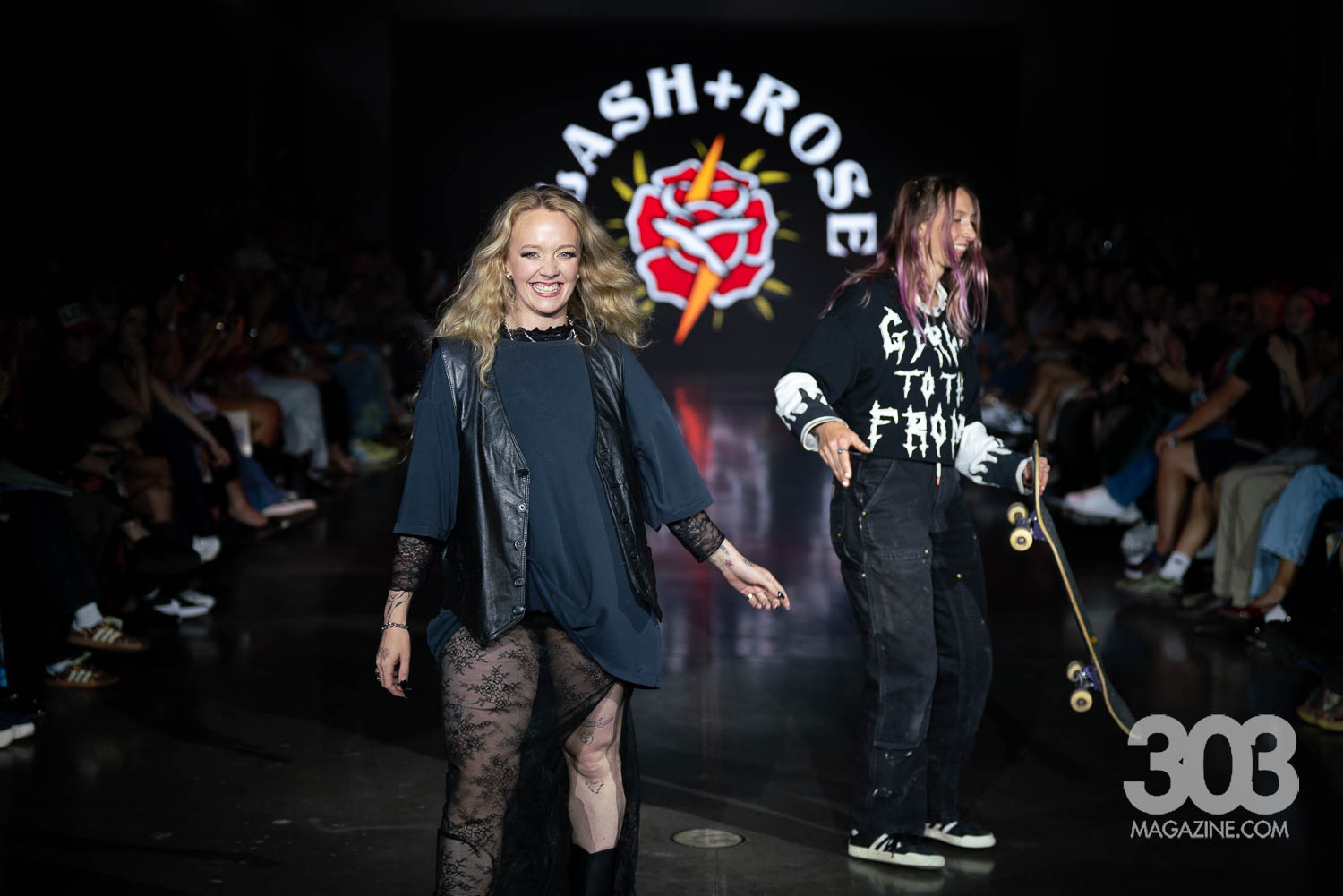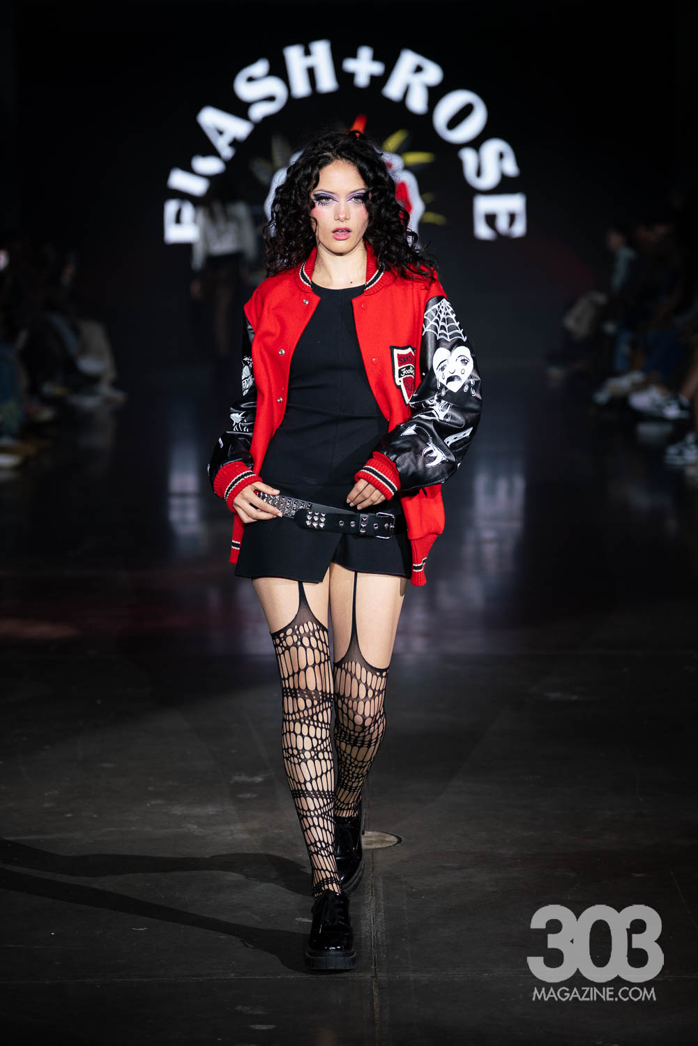 Flash + Rose’s runway look “For The Grrrls,” radiated pure tough-girl energy, turning the catwalk into a battleground of bold confidence and fearless fashion. The first model was a co-founder of Girls Skate Denver, an organization that empowers girls and builds confidence through skating. She skated down the runway to open the collection, setting a gritty energy for the rest of Flash + Rose’s segment.