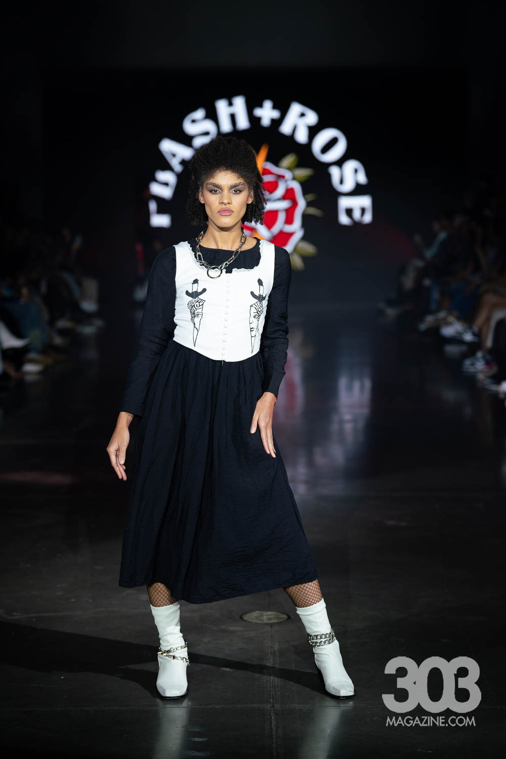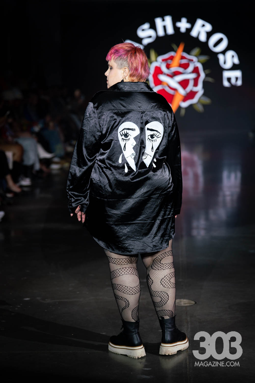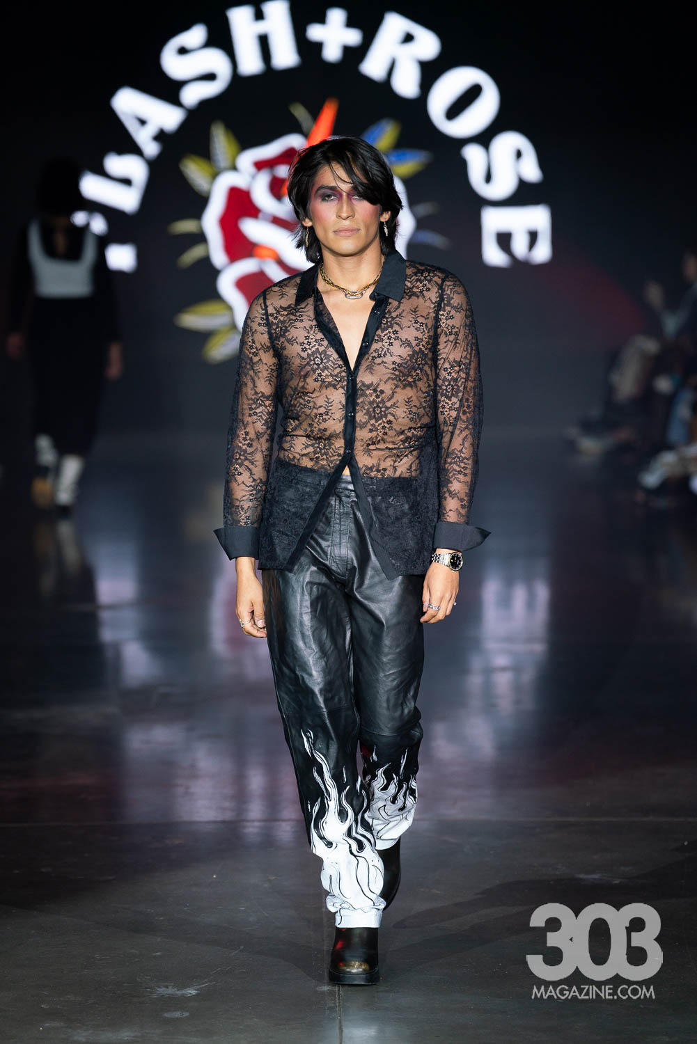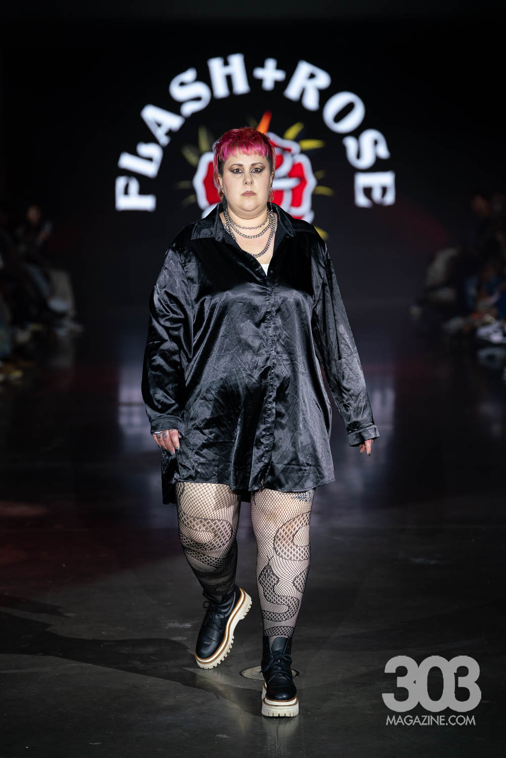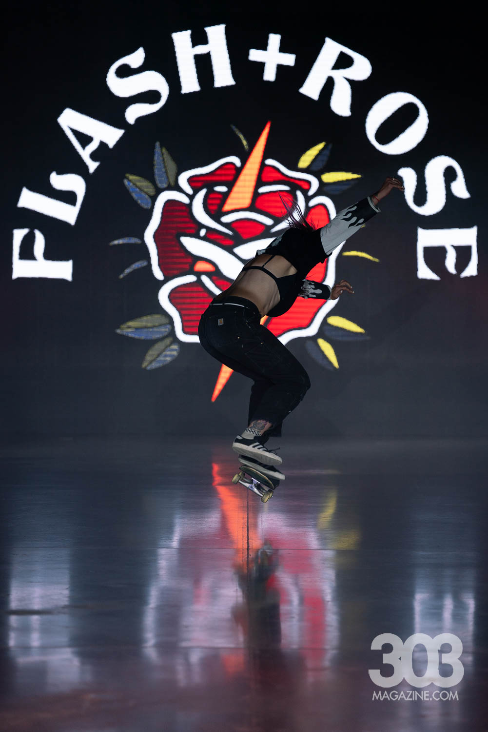 Flash + Rose’s runway look “For The Grrrls,” radiated pure tough-girl energy, turning the catwalk into a battleground of bold confidence and fearless fashion. The first model was a co-founder of Girls Skate Denver, an organization that empowers girls and builds confidence through skating. She skated down the runway to open the collection, setting a gritty energy for the rest of Flash + Rose’s segment.
