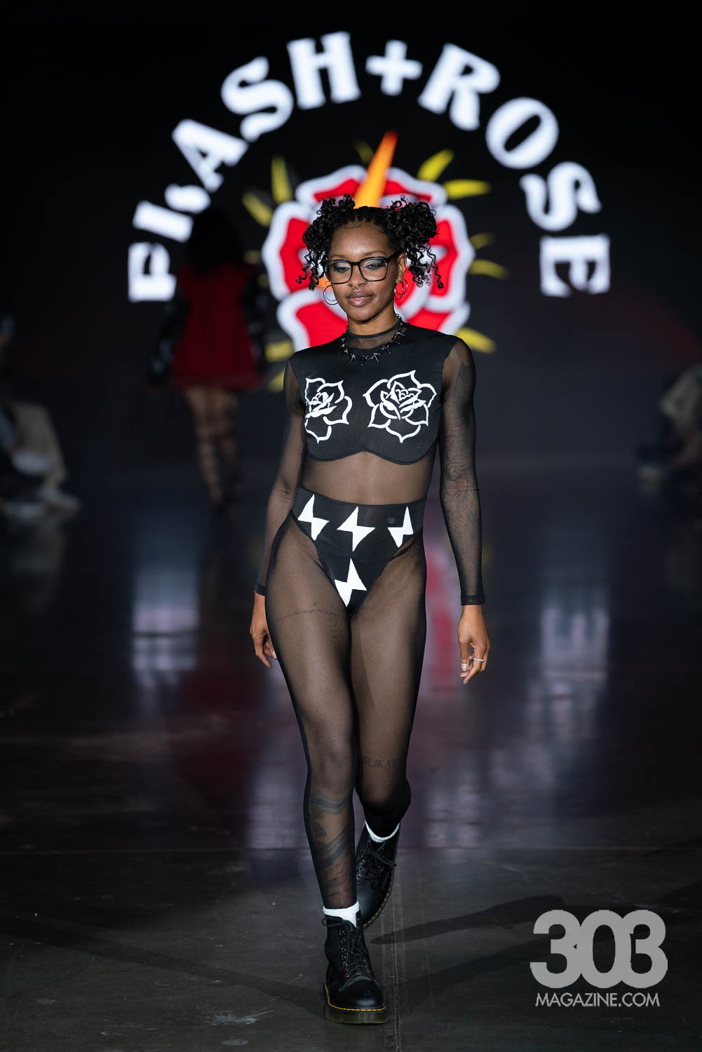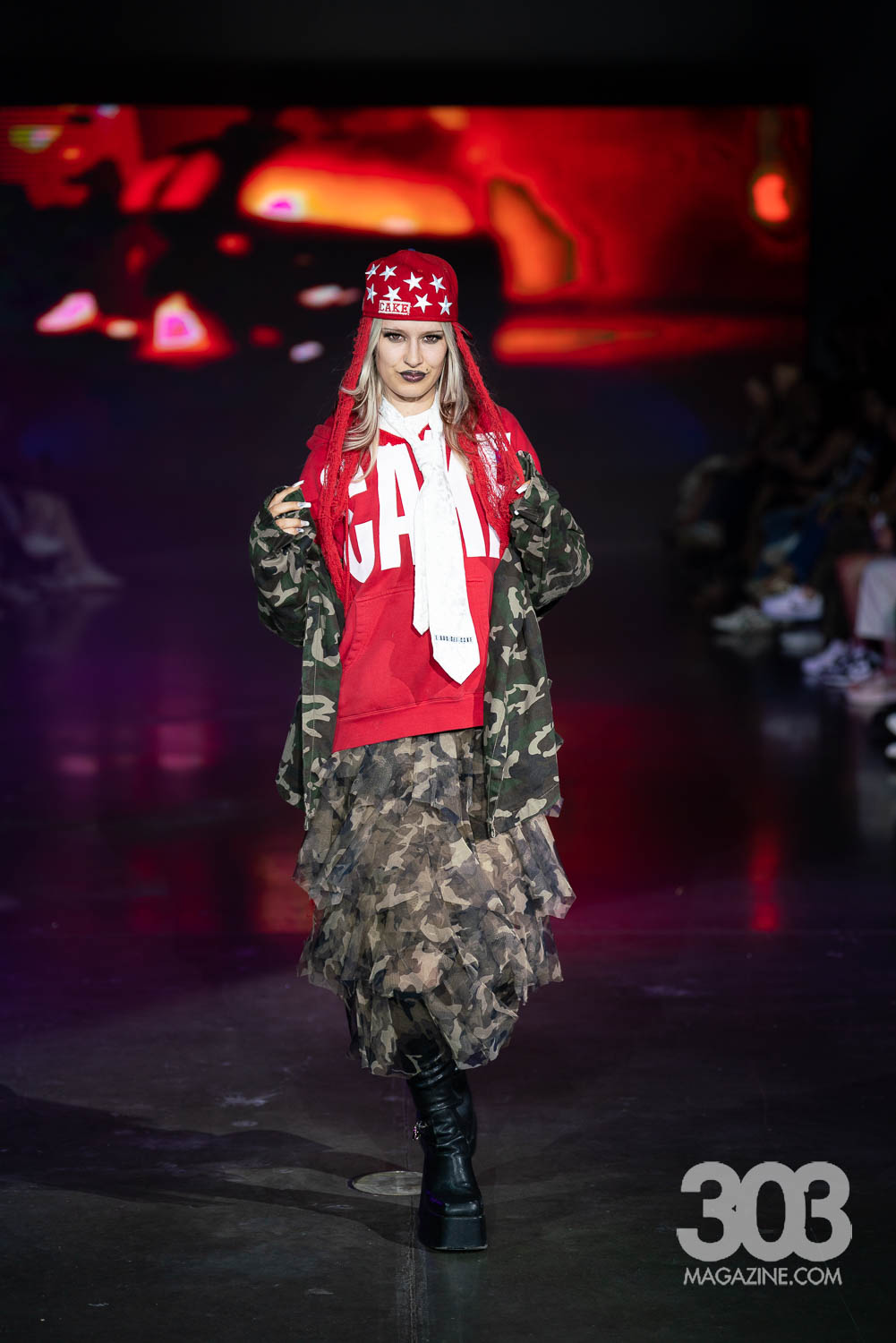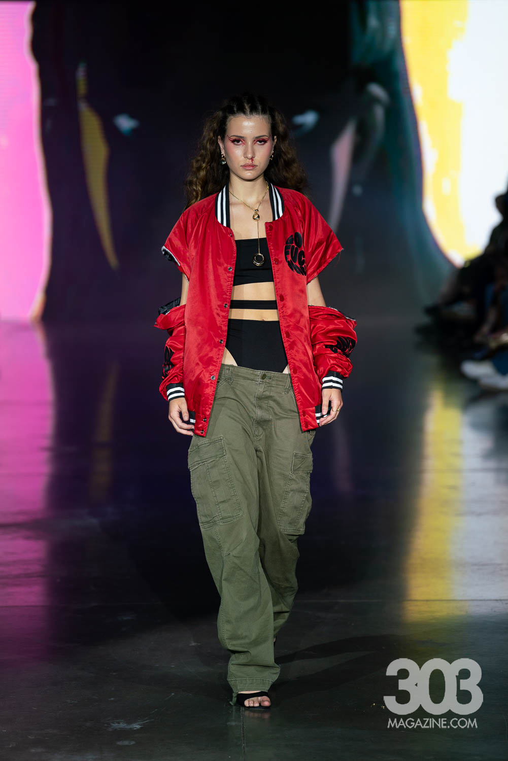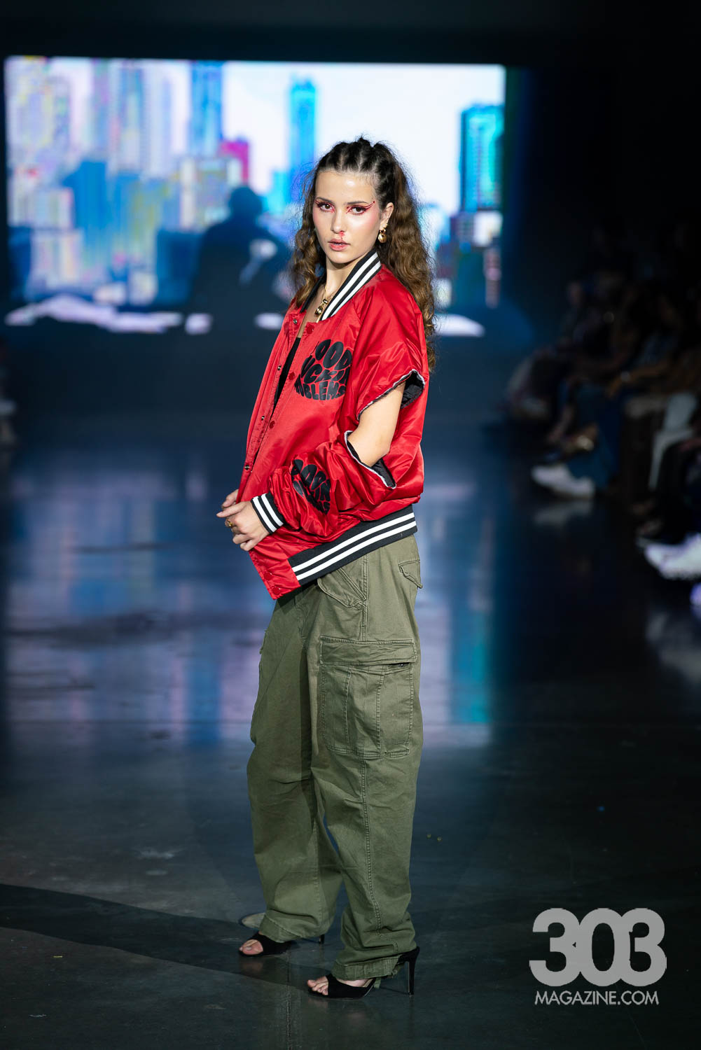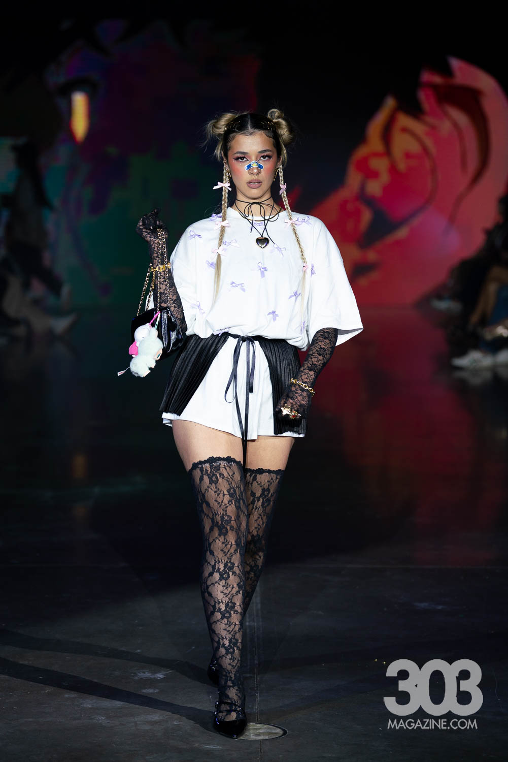 Flash + Rose’s runway look “For The Grrrls,” radiated pure tough-girl energy, turning the catwalk into a battleground of bold confidence and fearless fashion. The first model was a co-founder of Girls Skate Denver, an organization that empowers girls and builds confidence through skating. She skated down the runway to open the collection, setting a gritty energy for the rest of Flash + Rose’s segment.