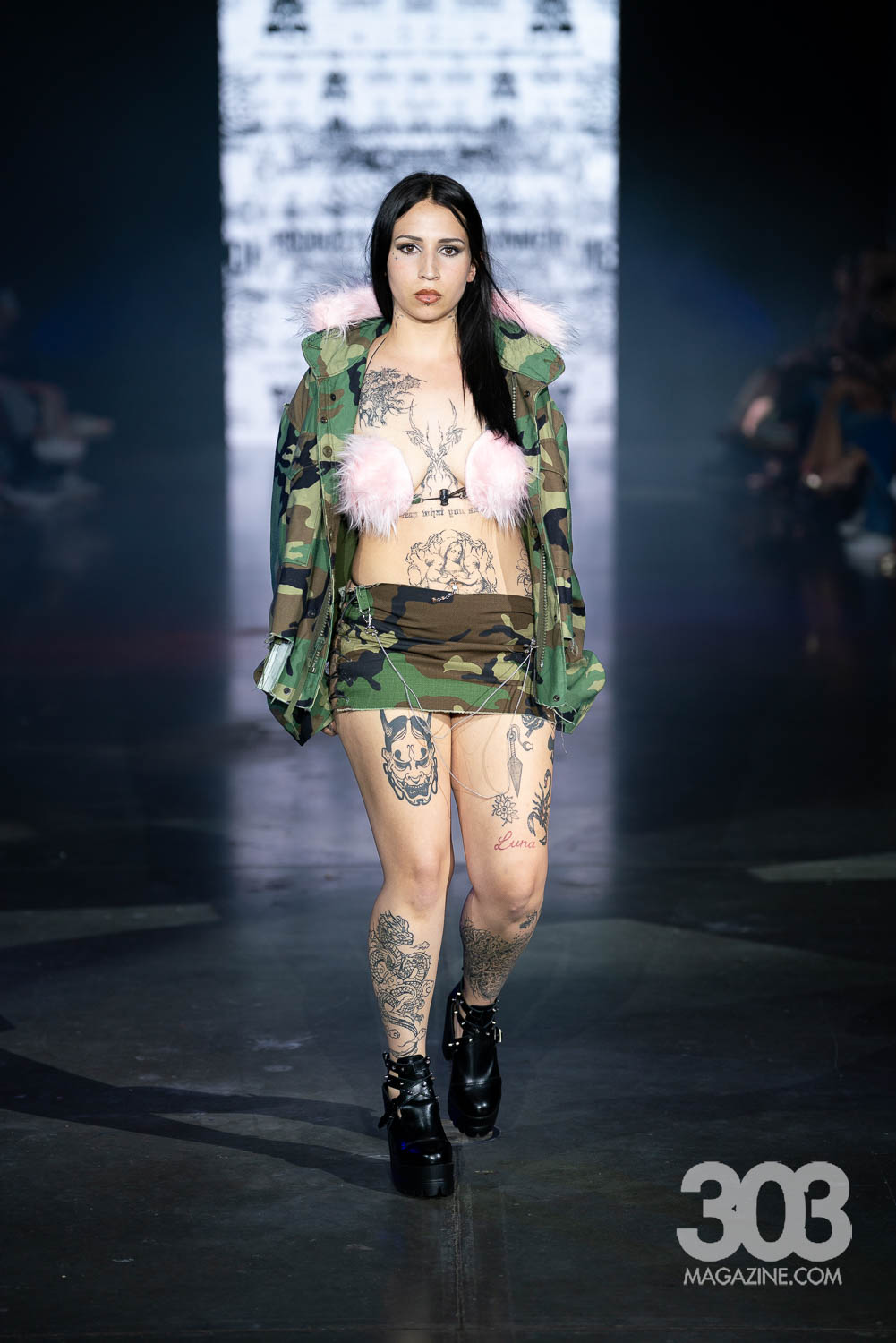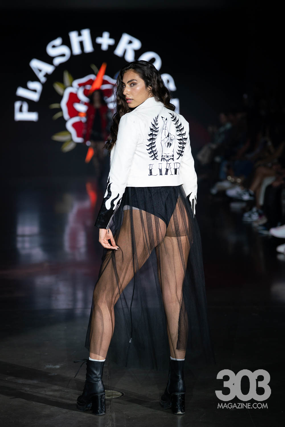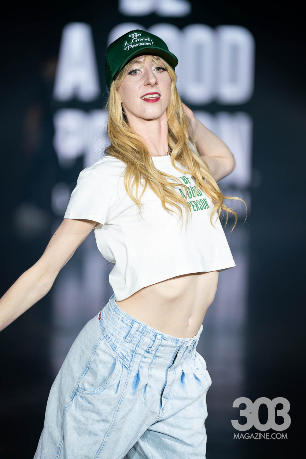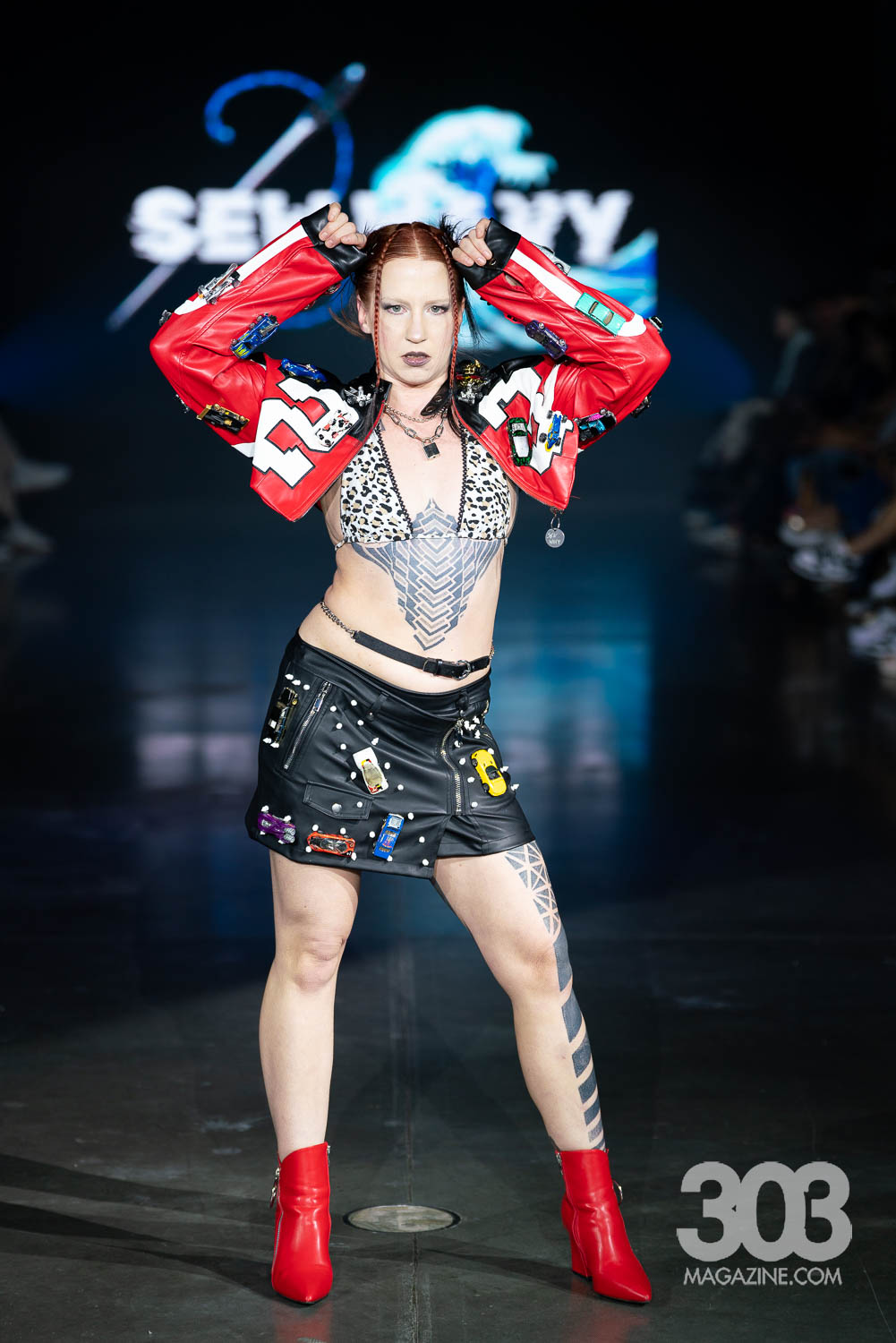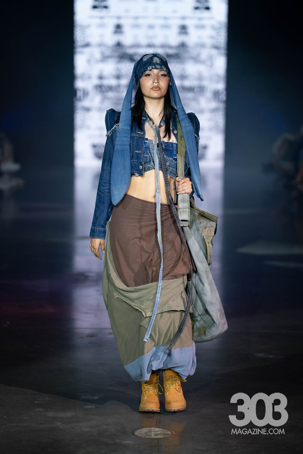 Flash + Rose’s runway look “For The Grrrls,” radiated pure tough-girl energy, turning the catwalk into a battleground of bold confidence and fearless fashion. The first model was a co-founder of Girls Skate Denver, an organization that empowers girls and builds confidence through skating. She skated down the runway to open the collection, setting a gritty energy for the rest of Flash + Rose’s segment.
