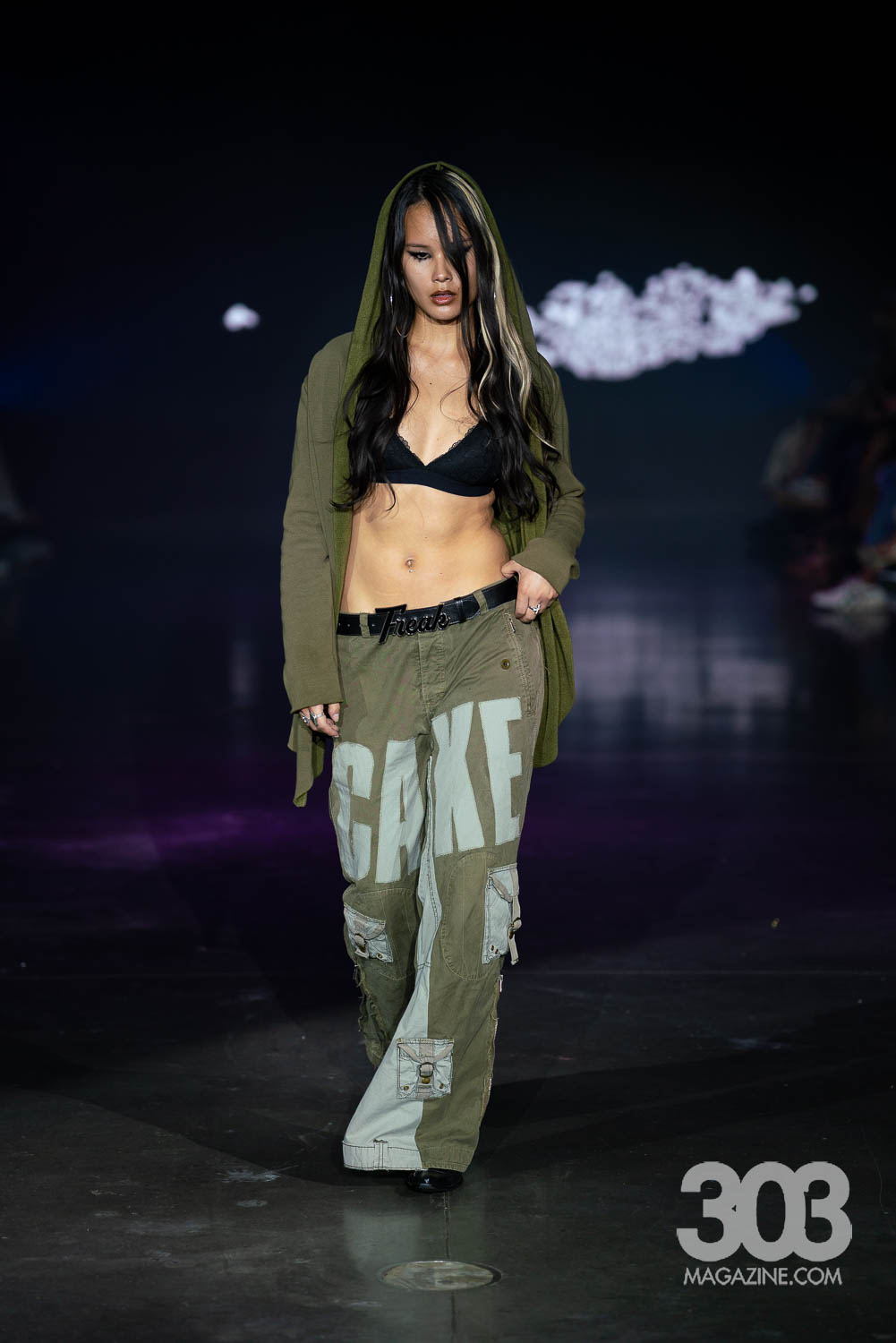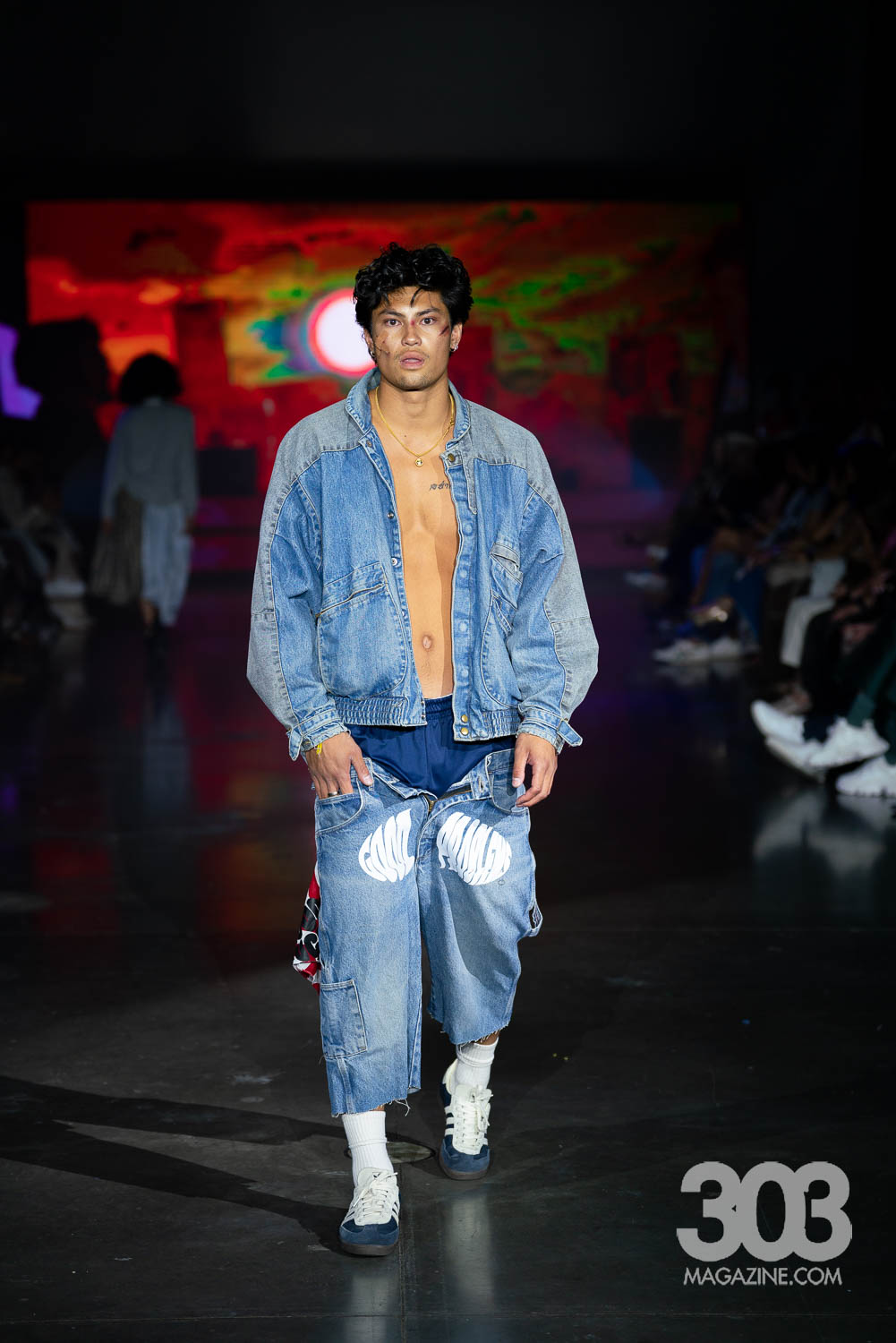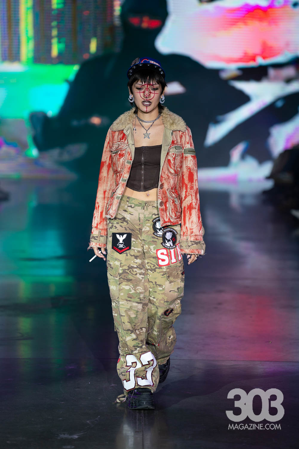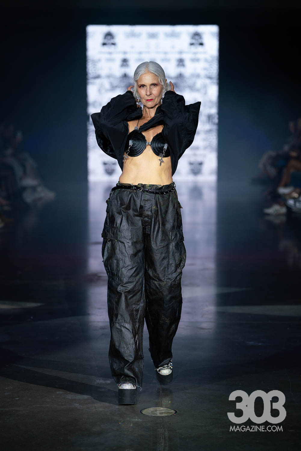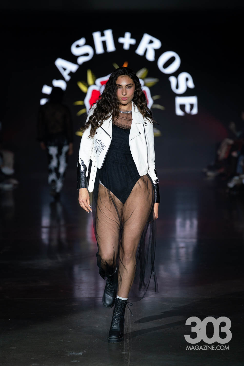 Flash + Rose’s runway look “For The Grrrls,” radiated pure tough-girl energy, turning the catwalk into a battleground of bold confidence and fearless fashion. The first model was a co-founder of Girls Skate Denver, an organization that empowers girls and builds confidence through skating. She skated down the runway to open the collection, setting a gritty energy for the rest of Flash + Rose’s segment.