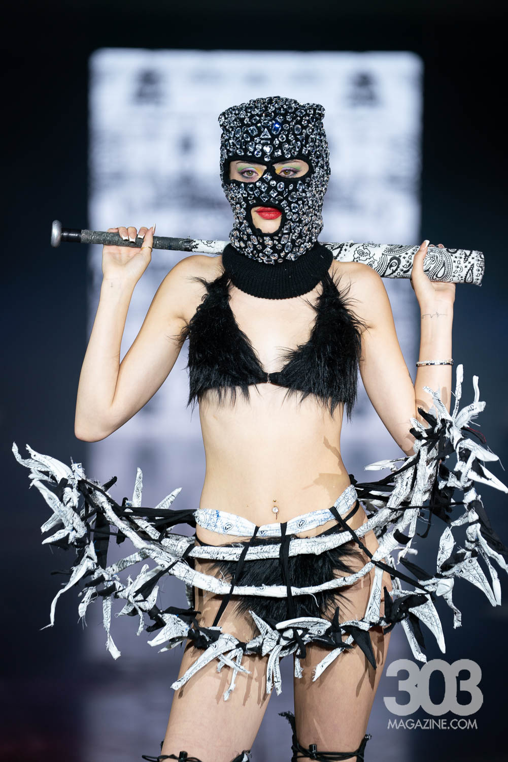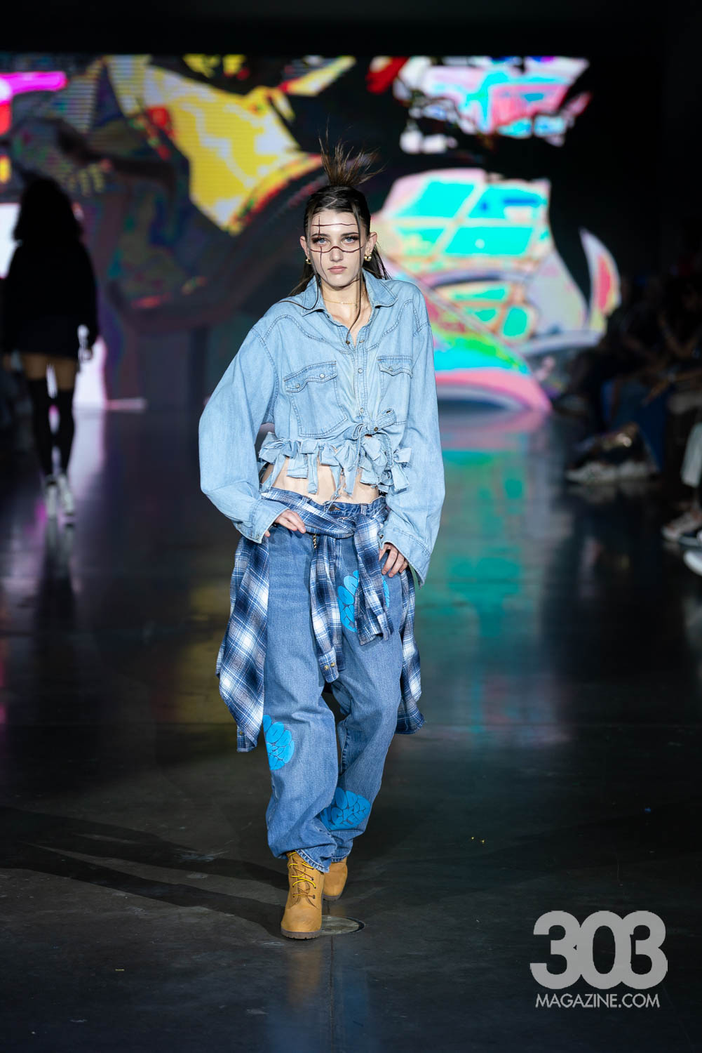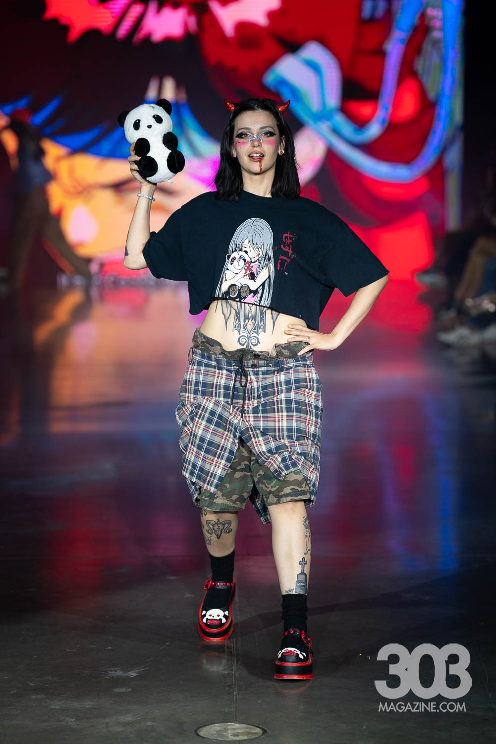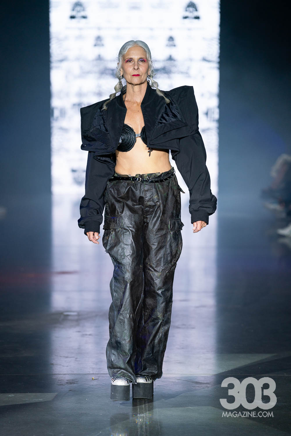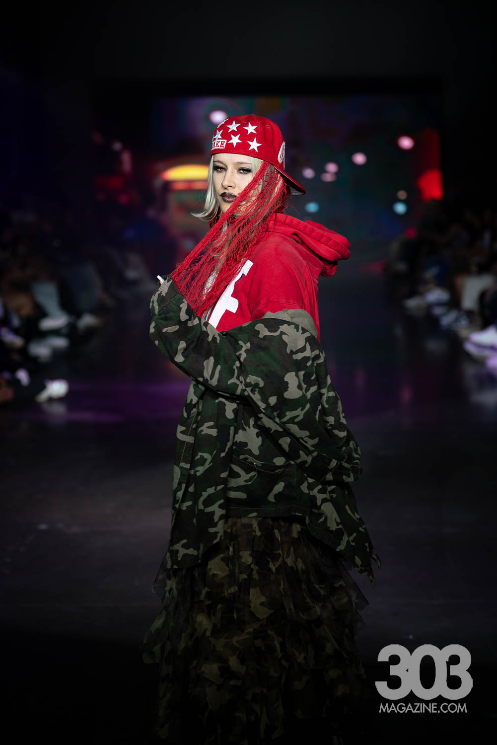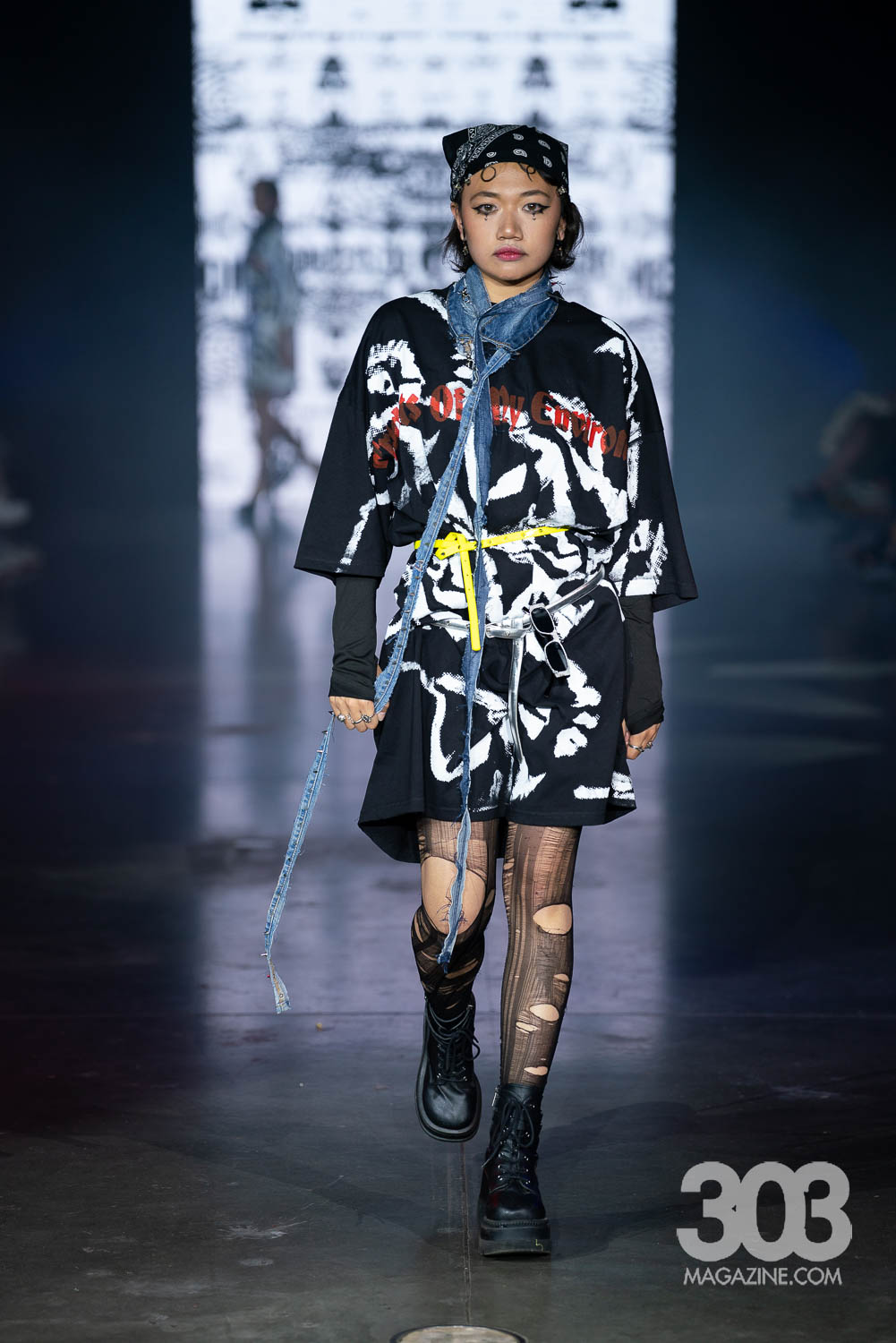 Flash + Rose’s runway look “For The Grrrls,” radiated pure tough-girl energy, turning the catwalk into a battleground of bold confidence and fearless fashion. The first model was a co-founder of Girls Skate Denver, an organization that empowers girls and builds confidence through skating. She skated down the runway to open the collection, setting a gritty energy for the rest of Flash + Rose’s segment.