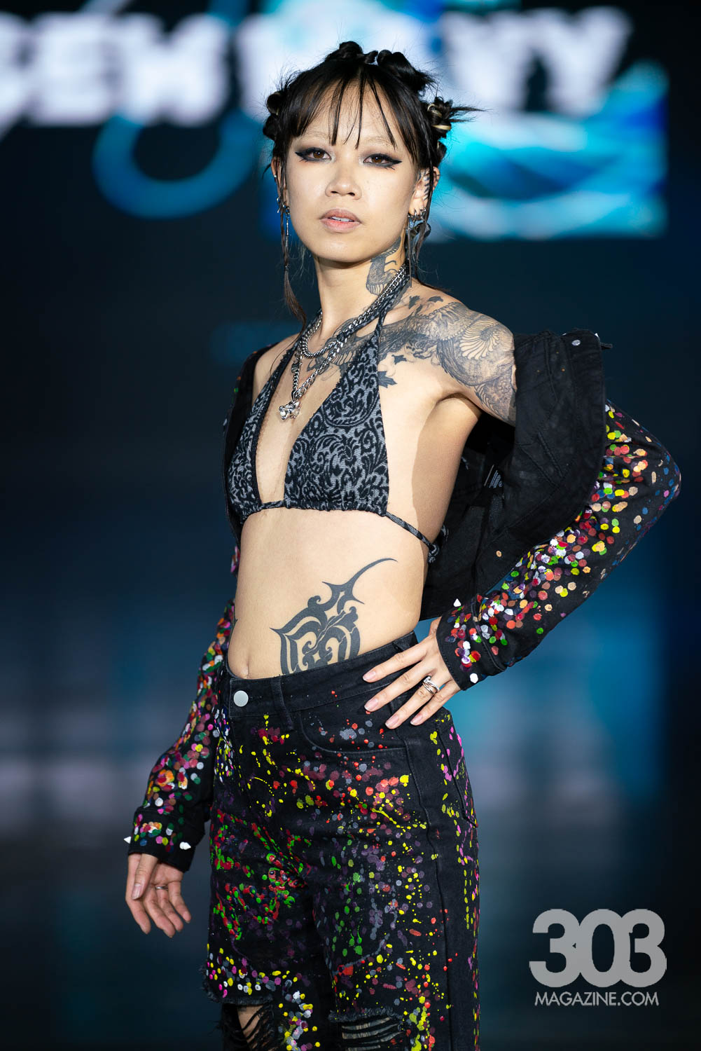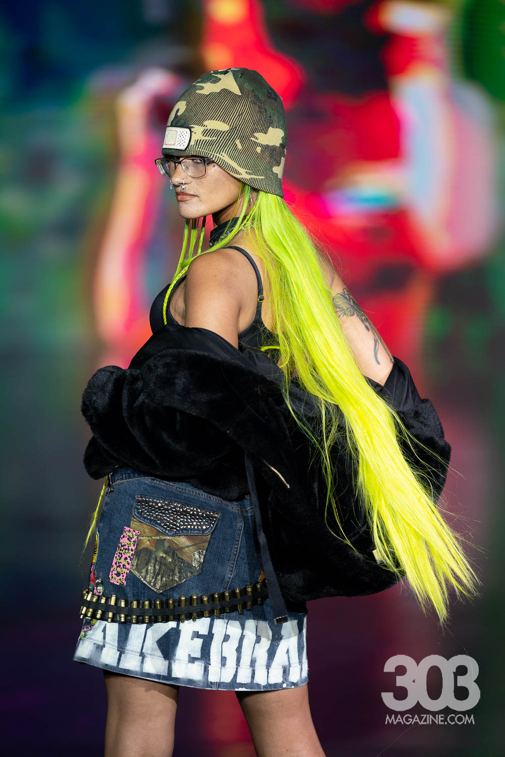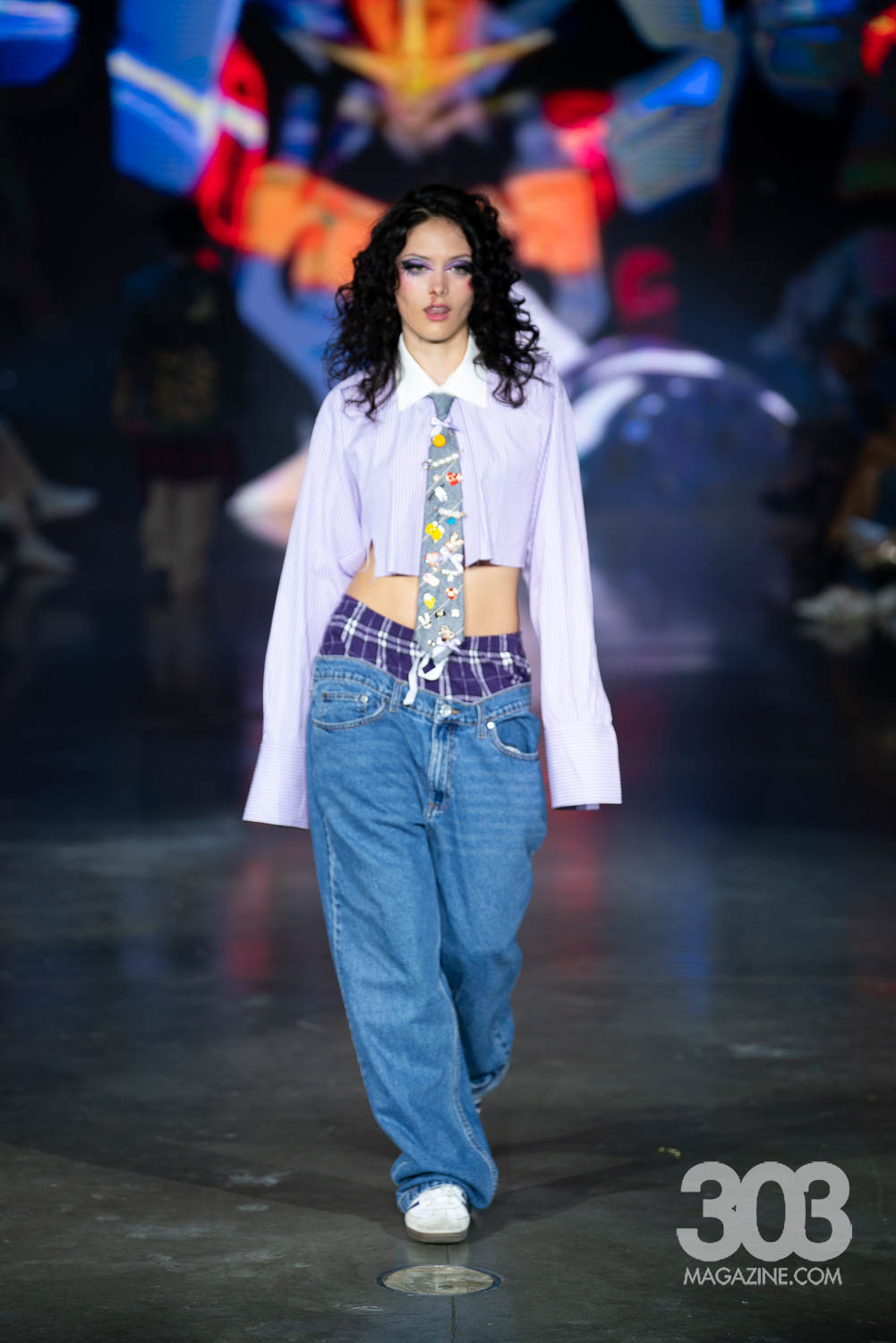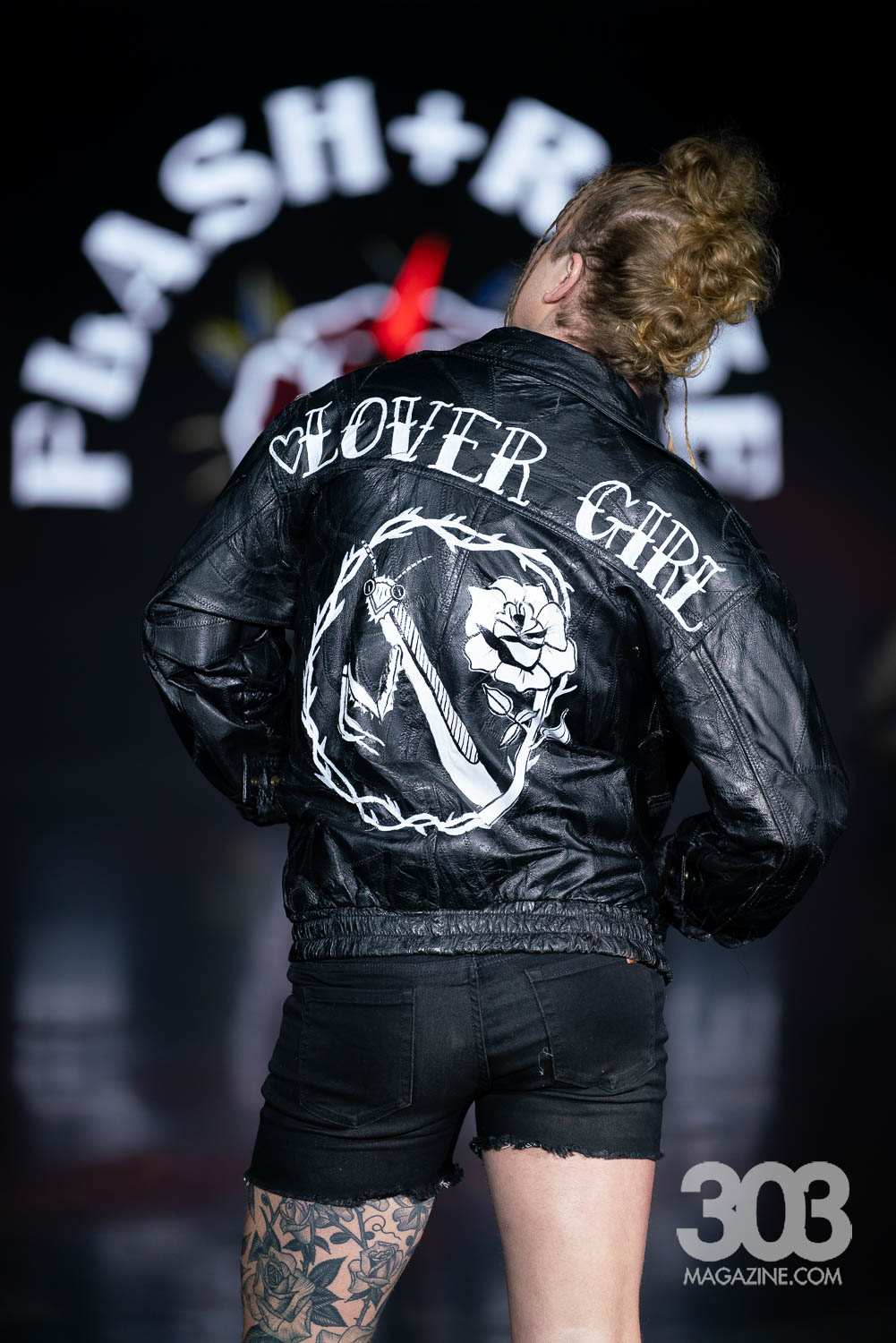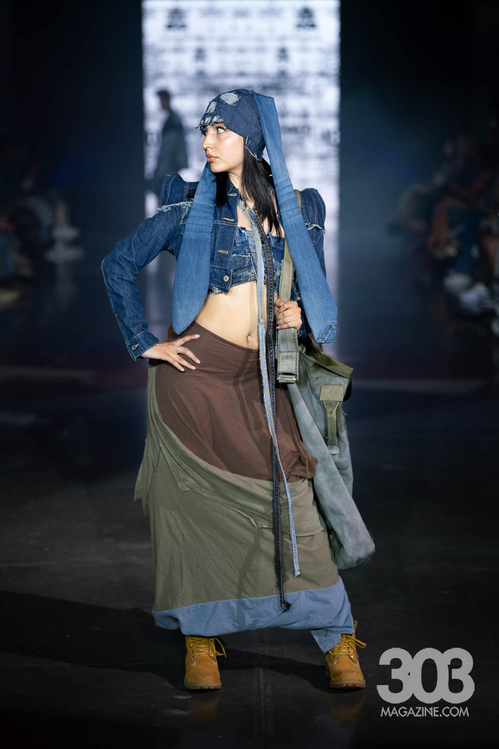 Flash + Rose’s runway look “For The Grrrls,” radiated pure tough-girl energy, turning the catwalk into a battleground of bold confidence and fearless fashion. The first model was a co-founder of Girls Skate Denver, an organization that empowers girls and builds confidence through skating. She skated down the runway to open the collection, setting a gritty energy for the rest of Flash + Rose’s segment.