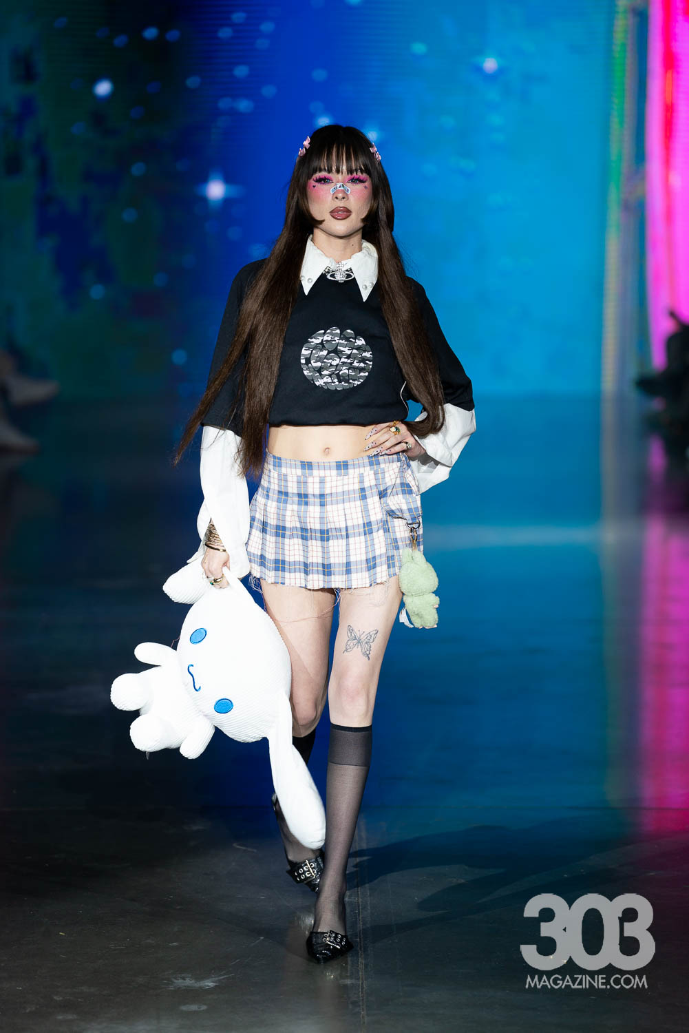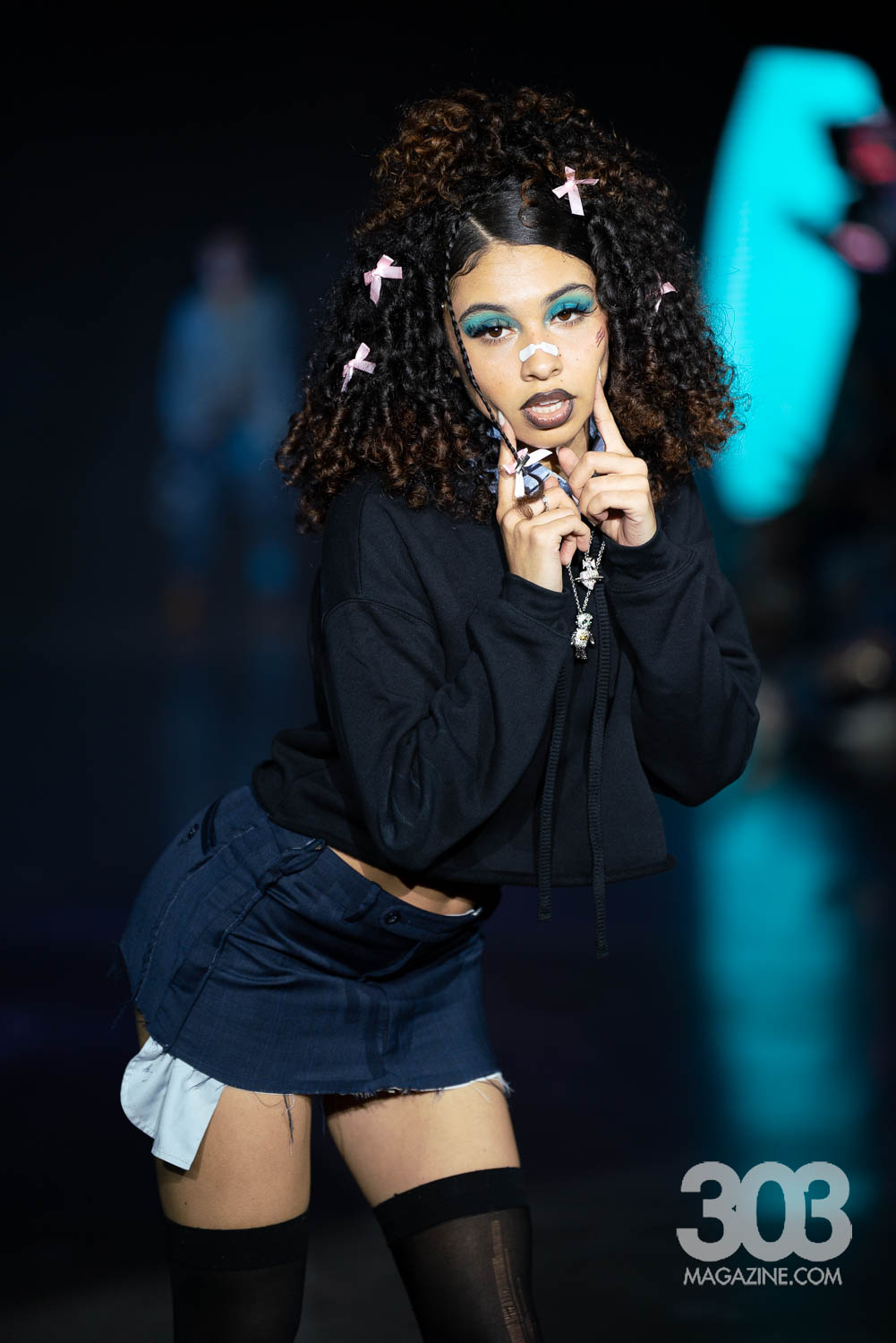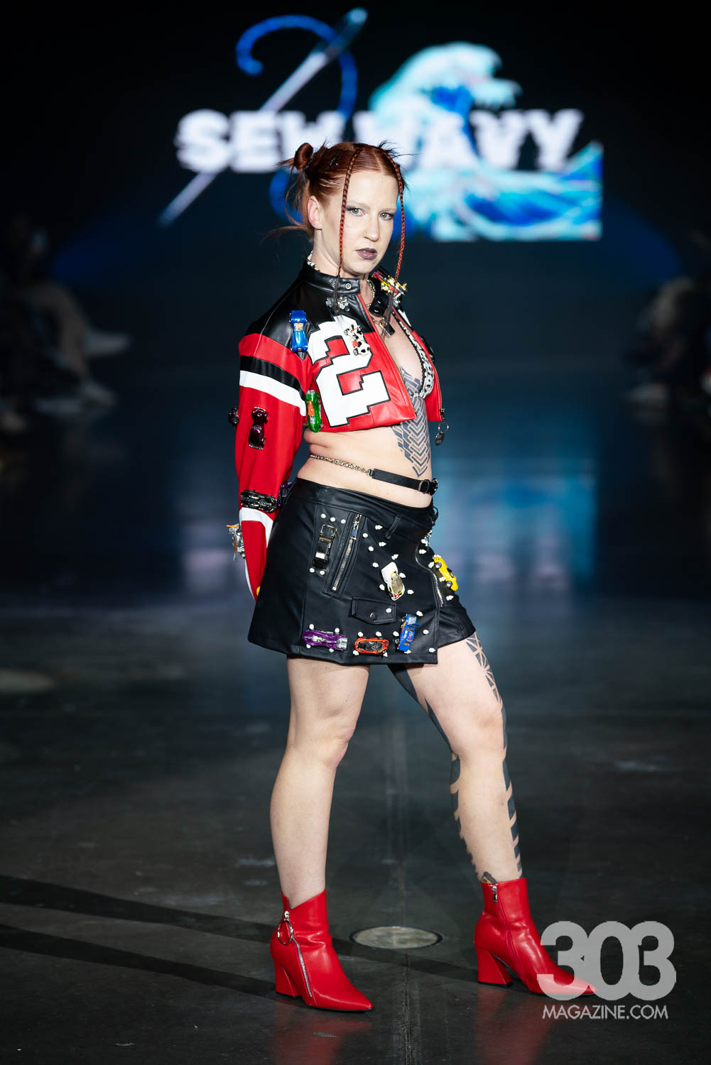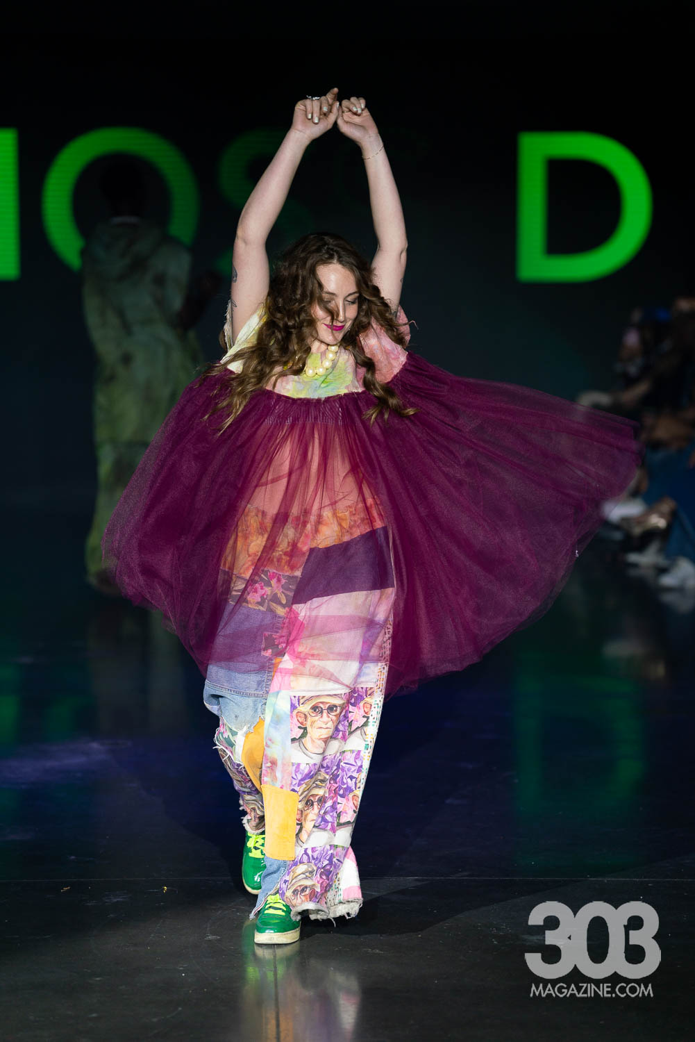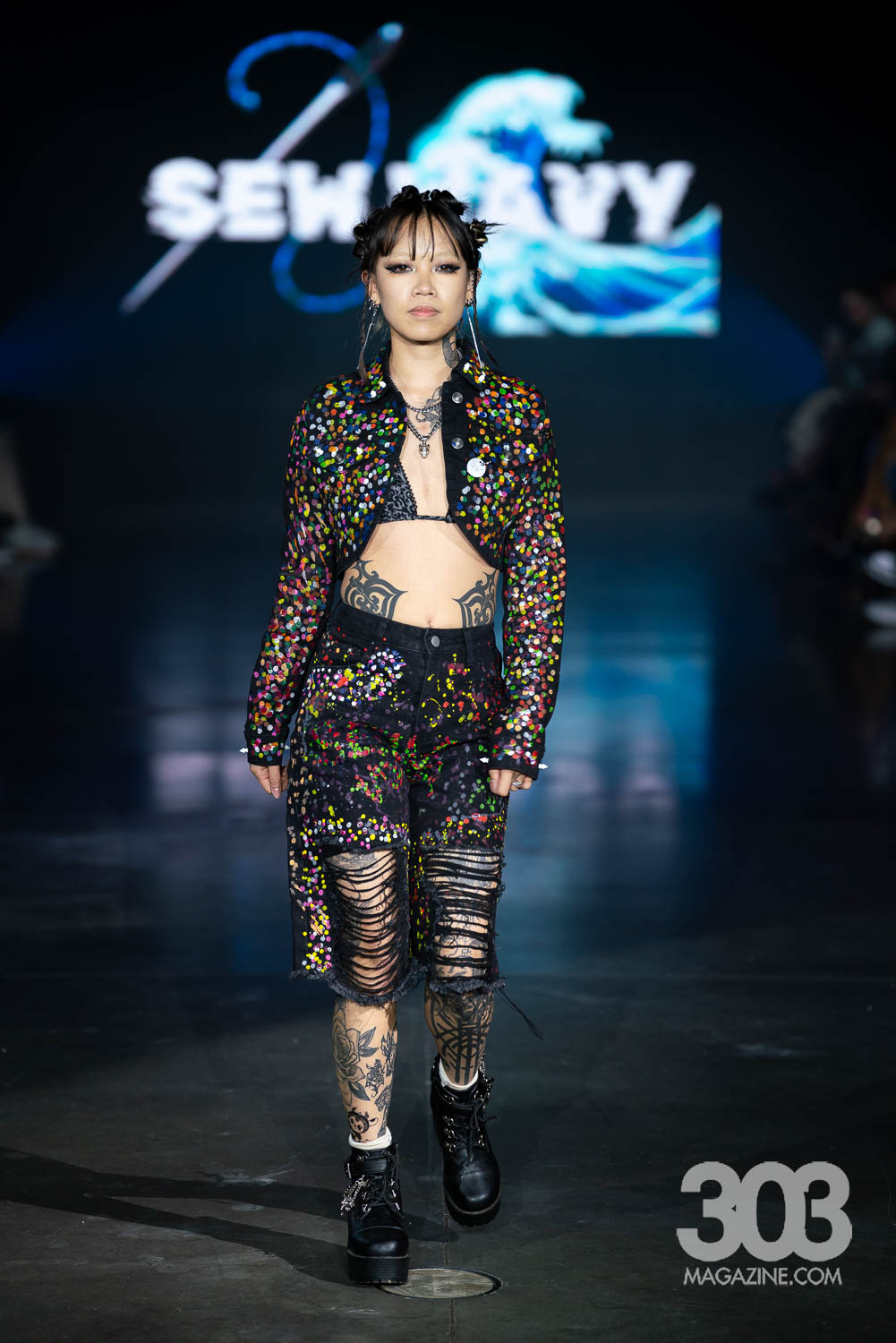 Flash + Rose’s runway look “For The Grrrls,” radiated pure tough-girl energy, turning the catwalk into a battleground of bold confidence and fearless fashion. The first model was a co-founder of Girls Skate Denver, an organization that empowers girls and builds confidence through skating. She skated down the runway to open the collection, setting a gritty energy for the rest of Flash + Rose’s segment.