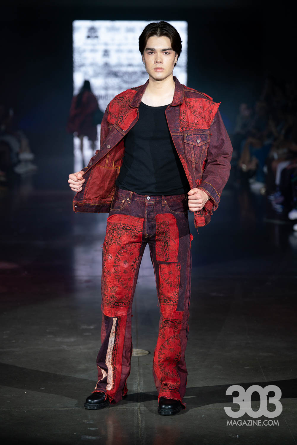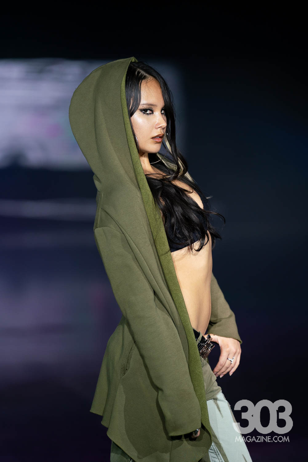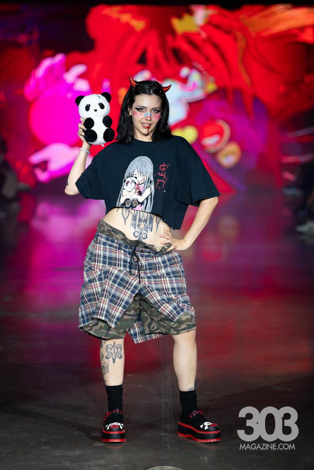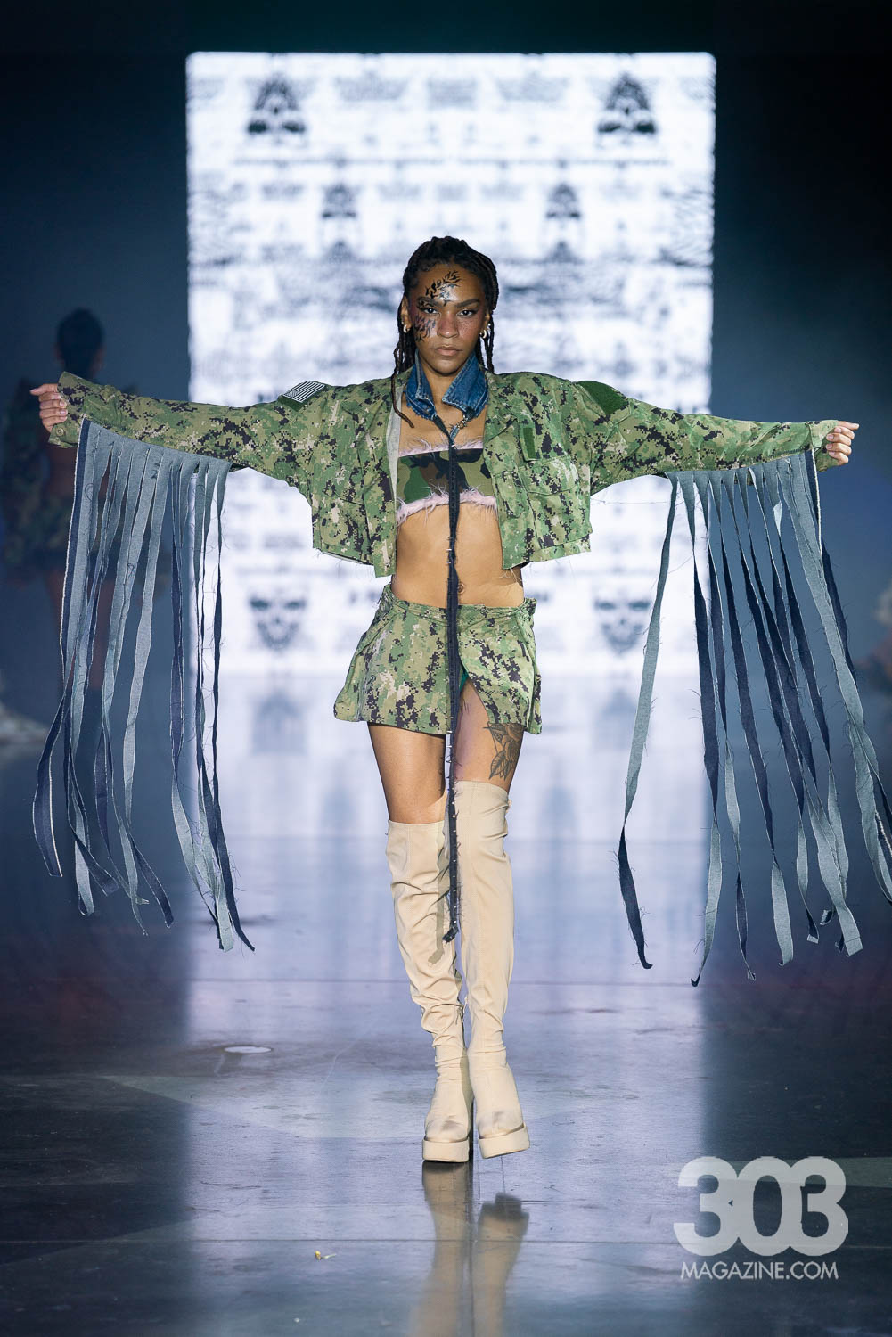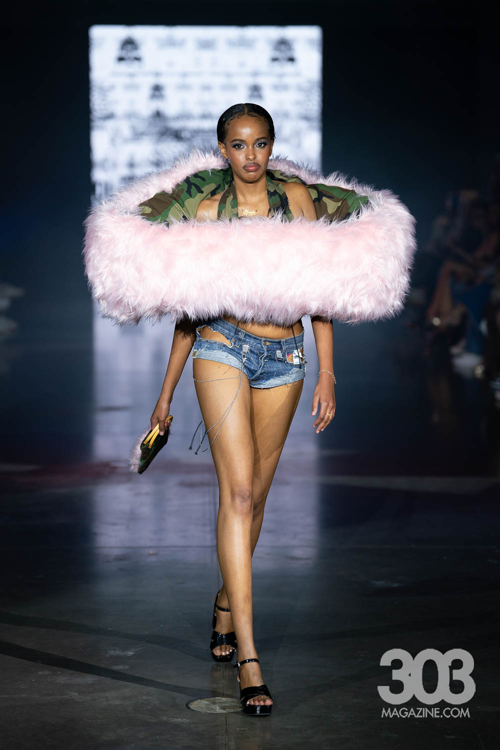 Flash + Rose’s runway look “For The Grrrls,” radiated pure tough-girl energy, turning the catwalk into a battleground of bold confidence and fearless fashion. The first model was a co-founder of Girls Skate Denver, an organization that empowers girls and builds confidence through skating. She skated down the runway to open the collection, setting a gritty energy for the rest of Flash + Rose’s segment.