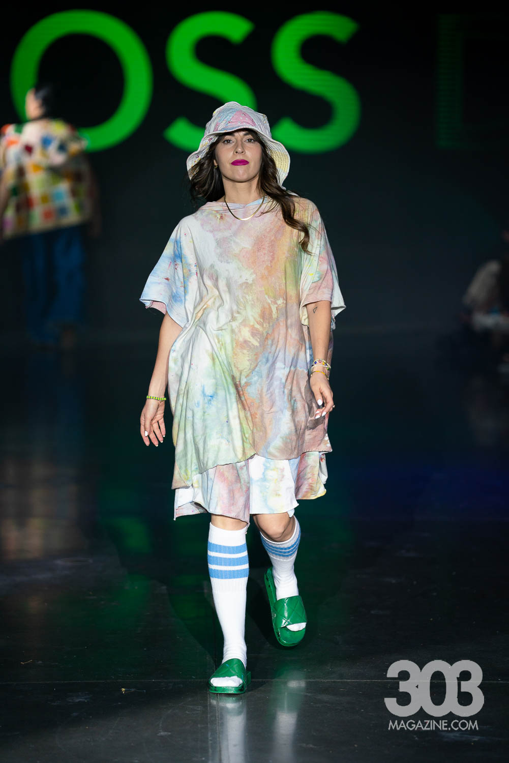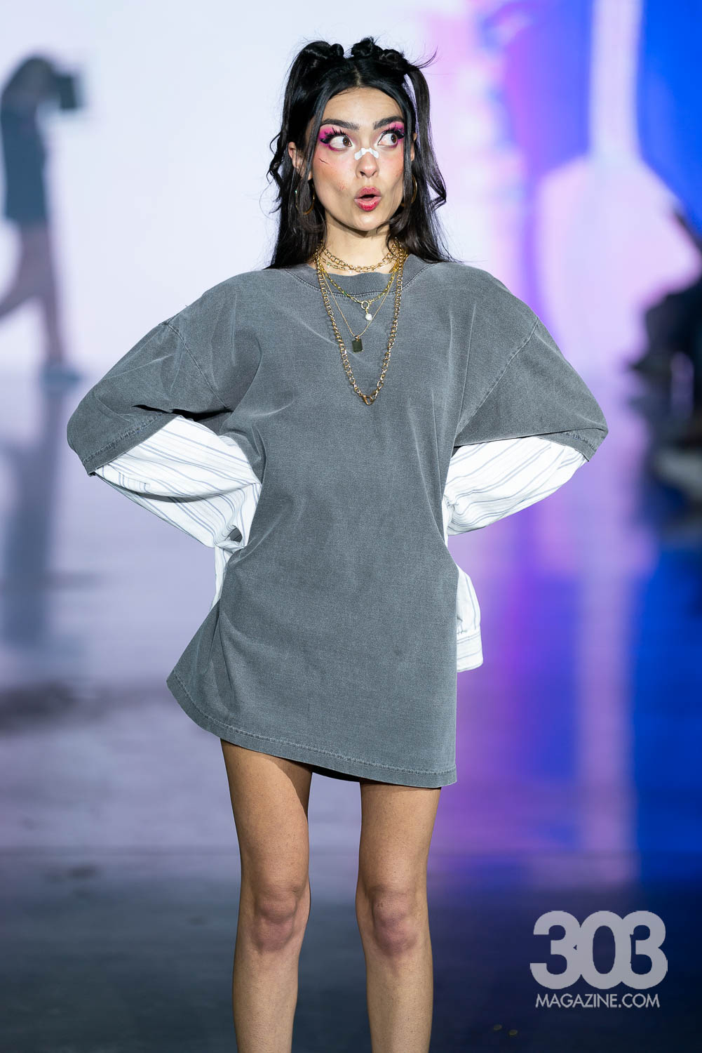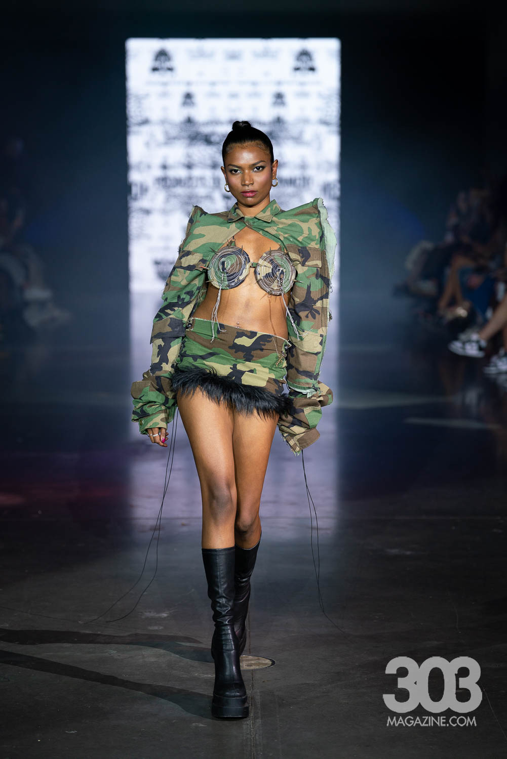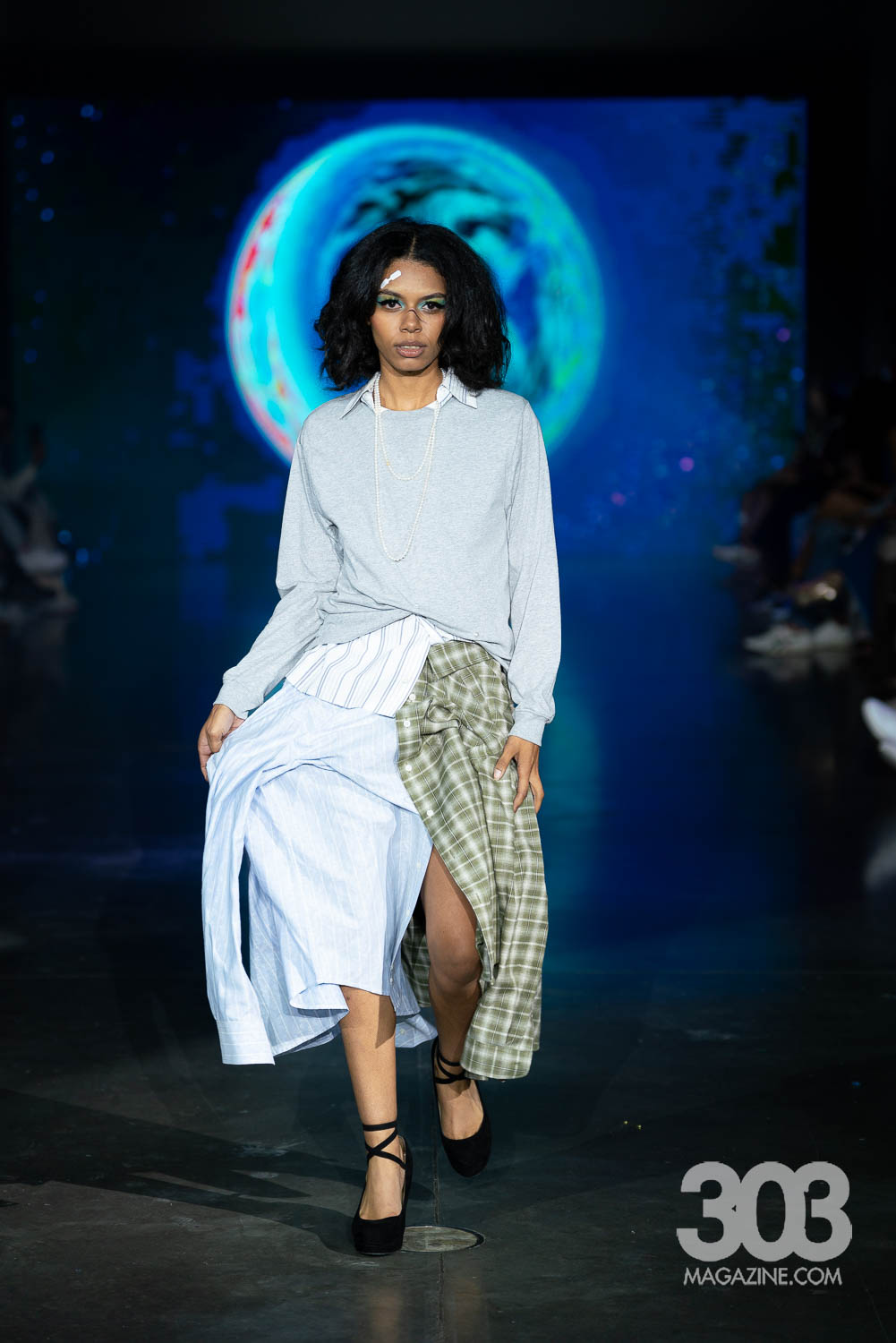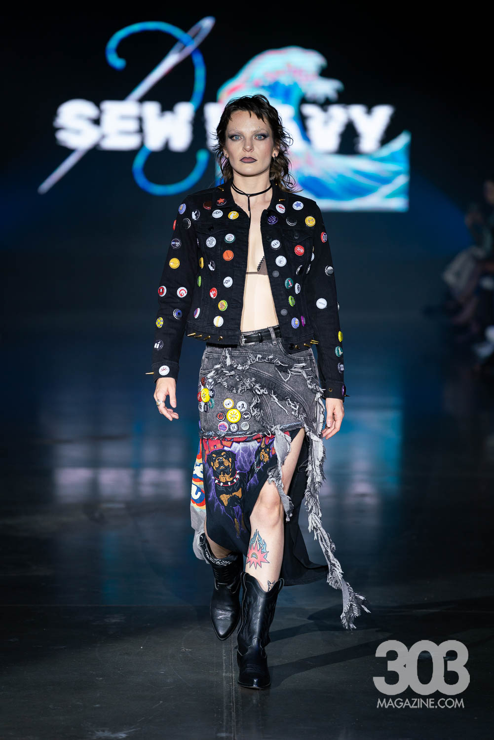 Flash + Rose’s runway look “For The Grrrls,” radiated pure tough-girl energy, turning the catwalk into a battleground of bold confidence and fearless fashion. The first model was a co-founder of Girls Skate Denver, an organization that empowers girls and builds confidence through skating. She skated down the runway to open the collection, setting a gritty energy for the rest of Flash + Rose’s segment.