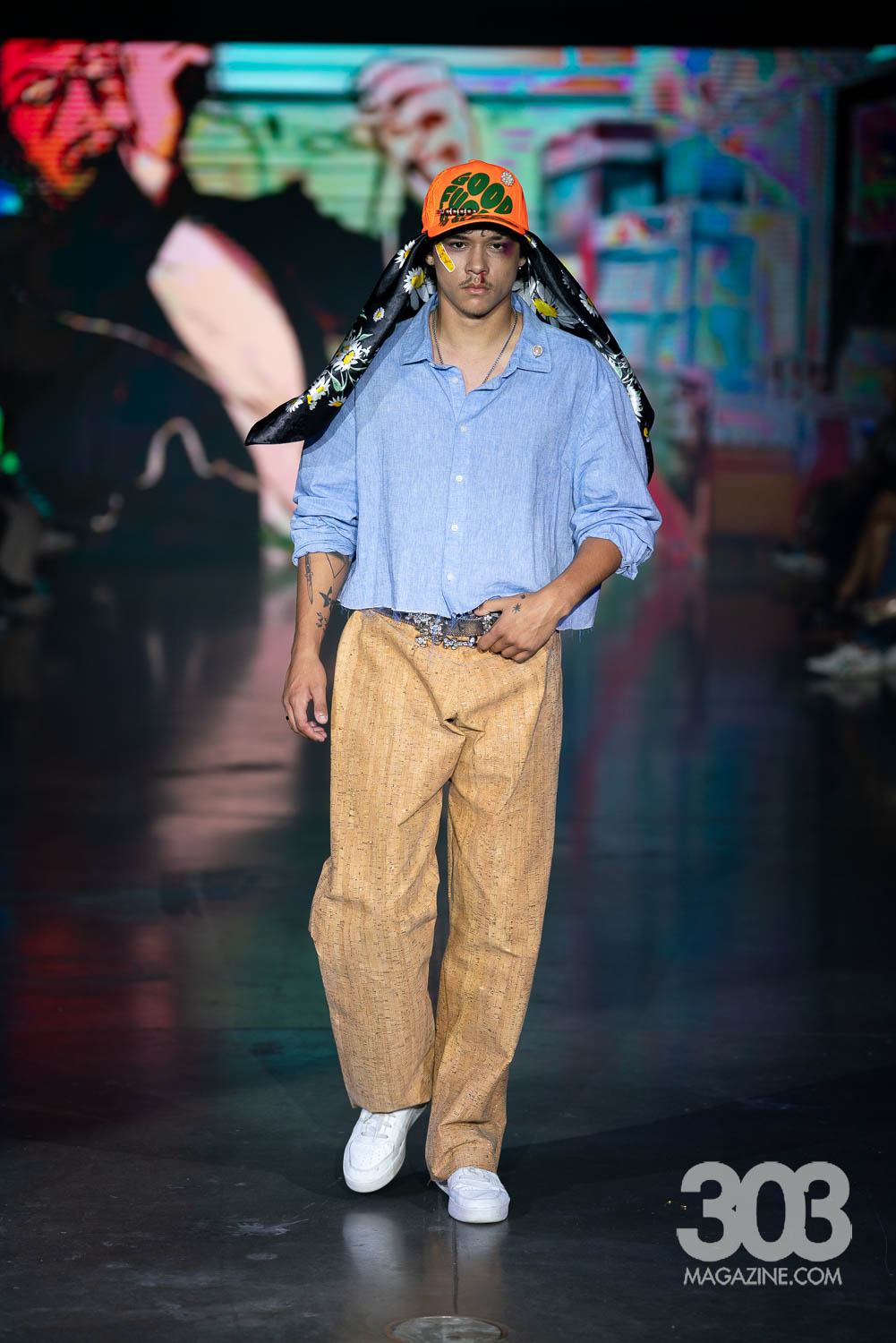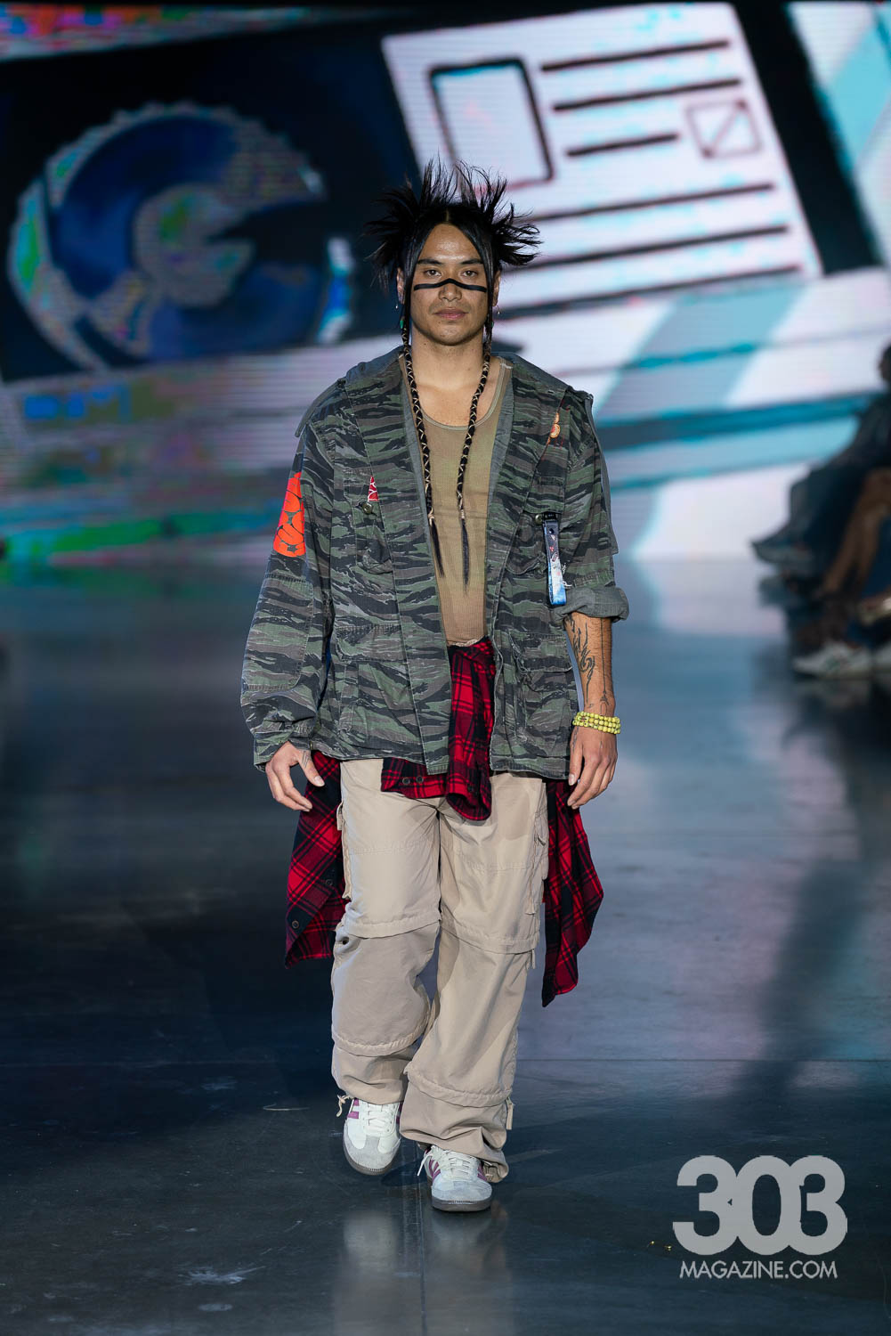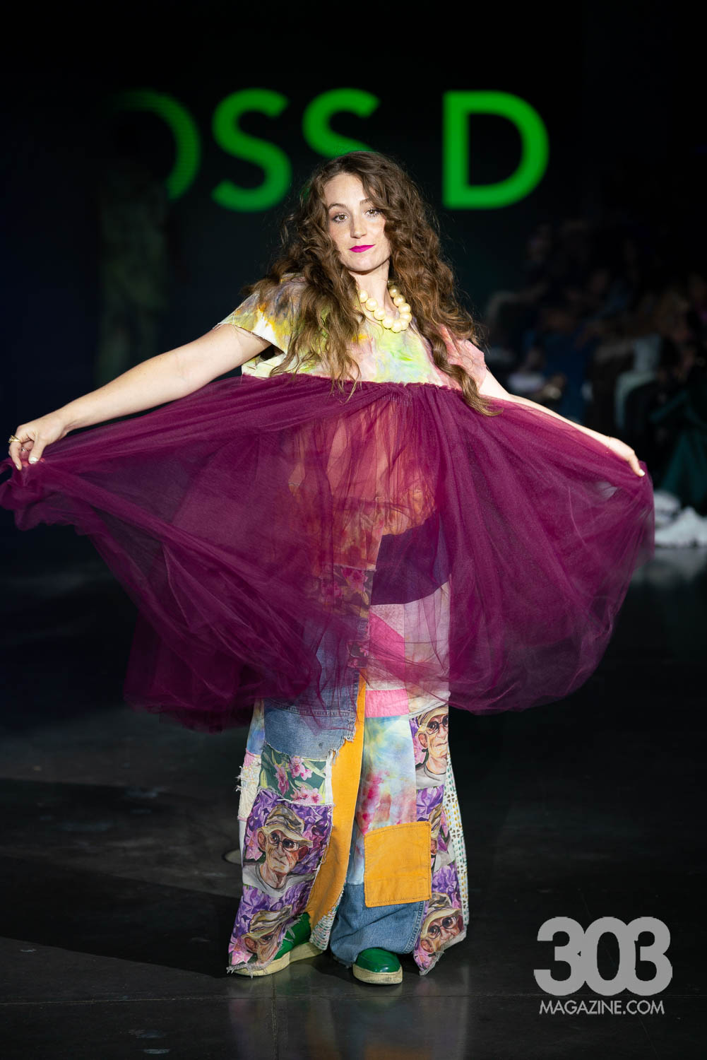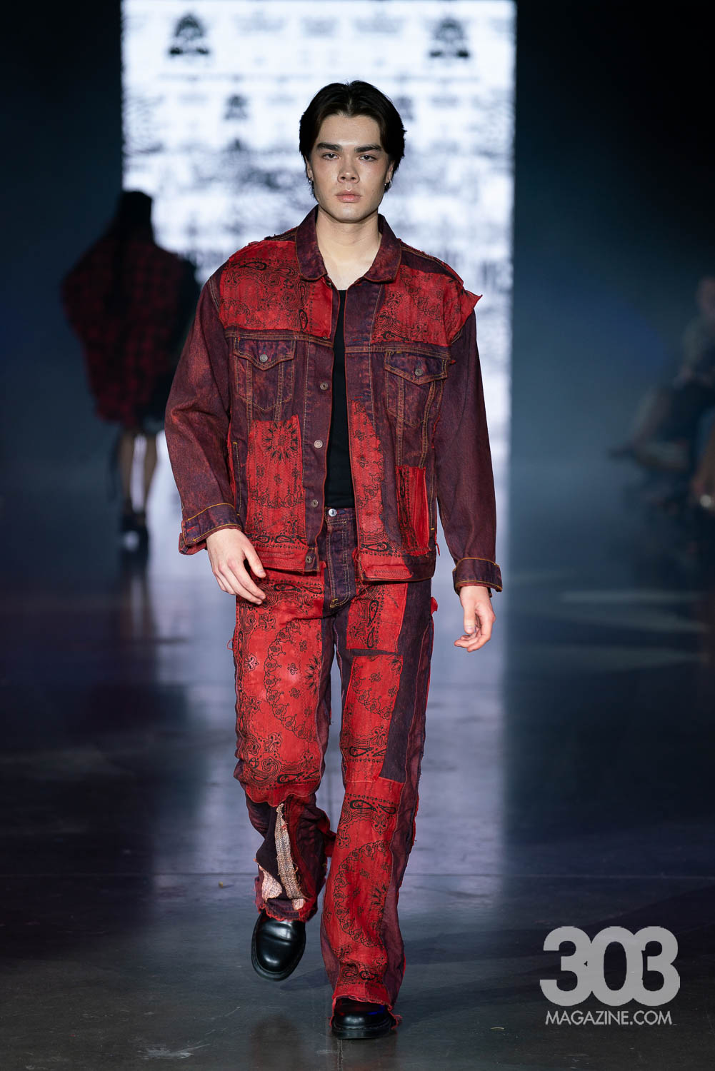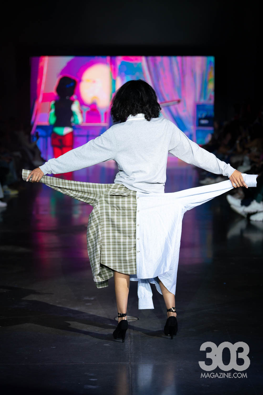 Flash + Rose’s runway look “For The Grrrls,” radiated pure tough-girl energy, turning the catwalk into a battleground of bold confidence and fearless fashion. The first model was a co-founder of Girls Skate Denver, an organization that empowers girls and builds confidence through skating. She skated down the runway to open the collection, setting a gritty energy for the rest of Flash + Rose’s segment.