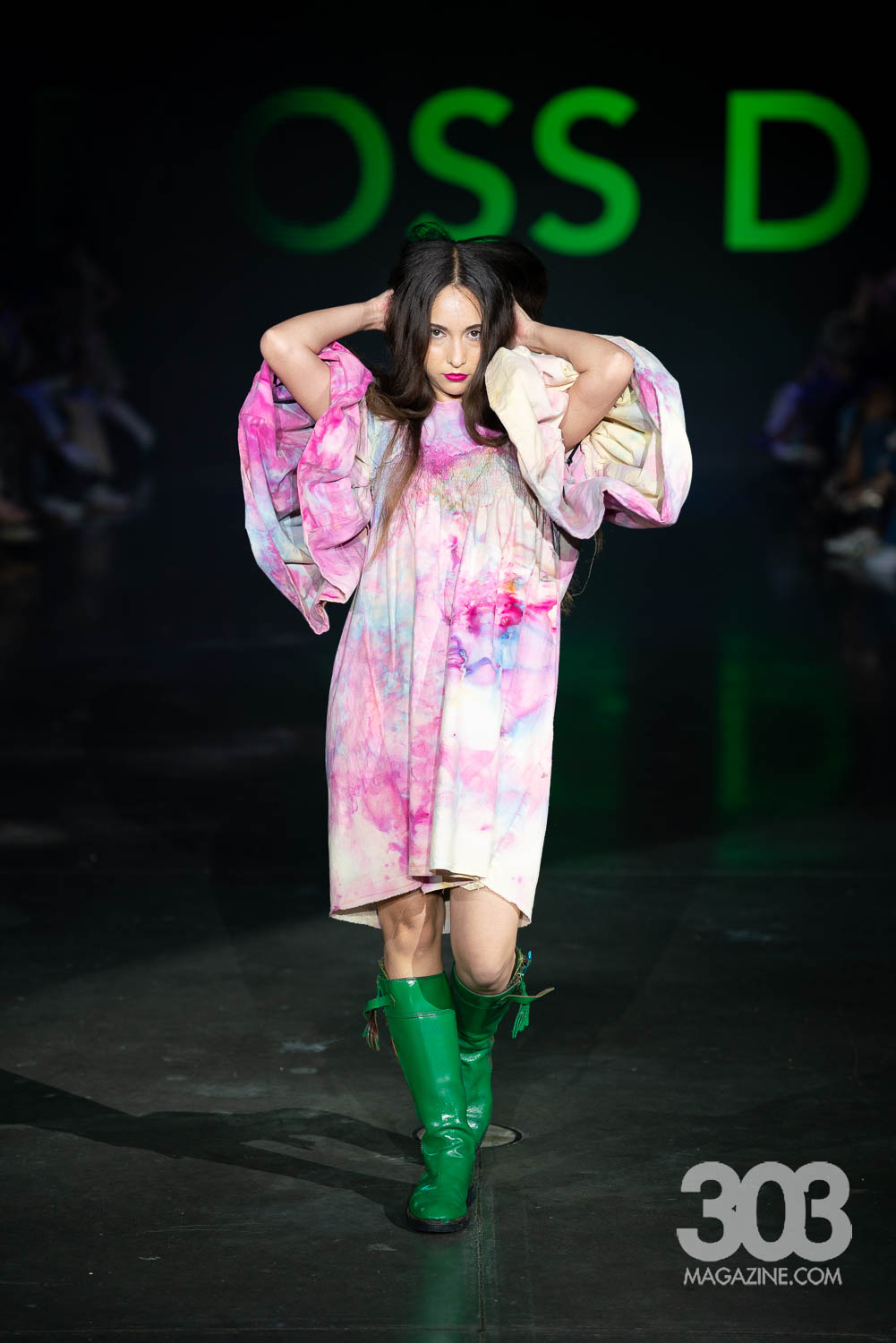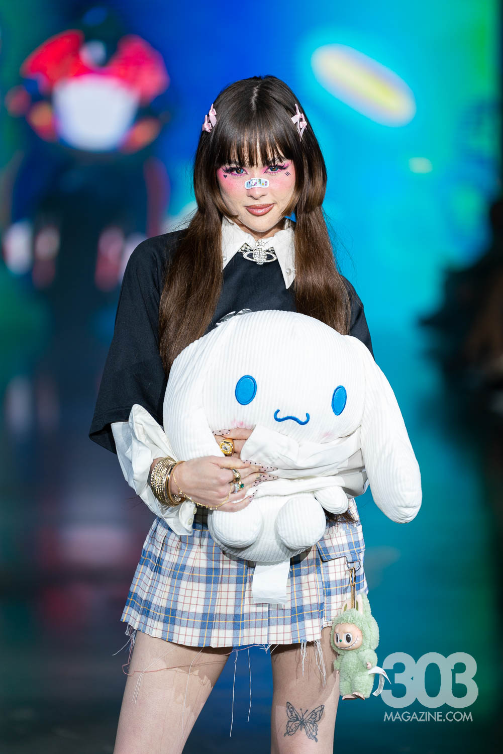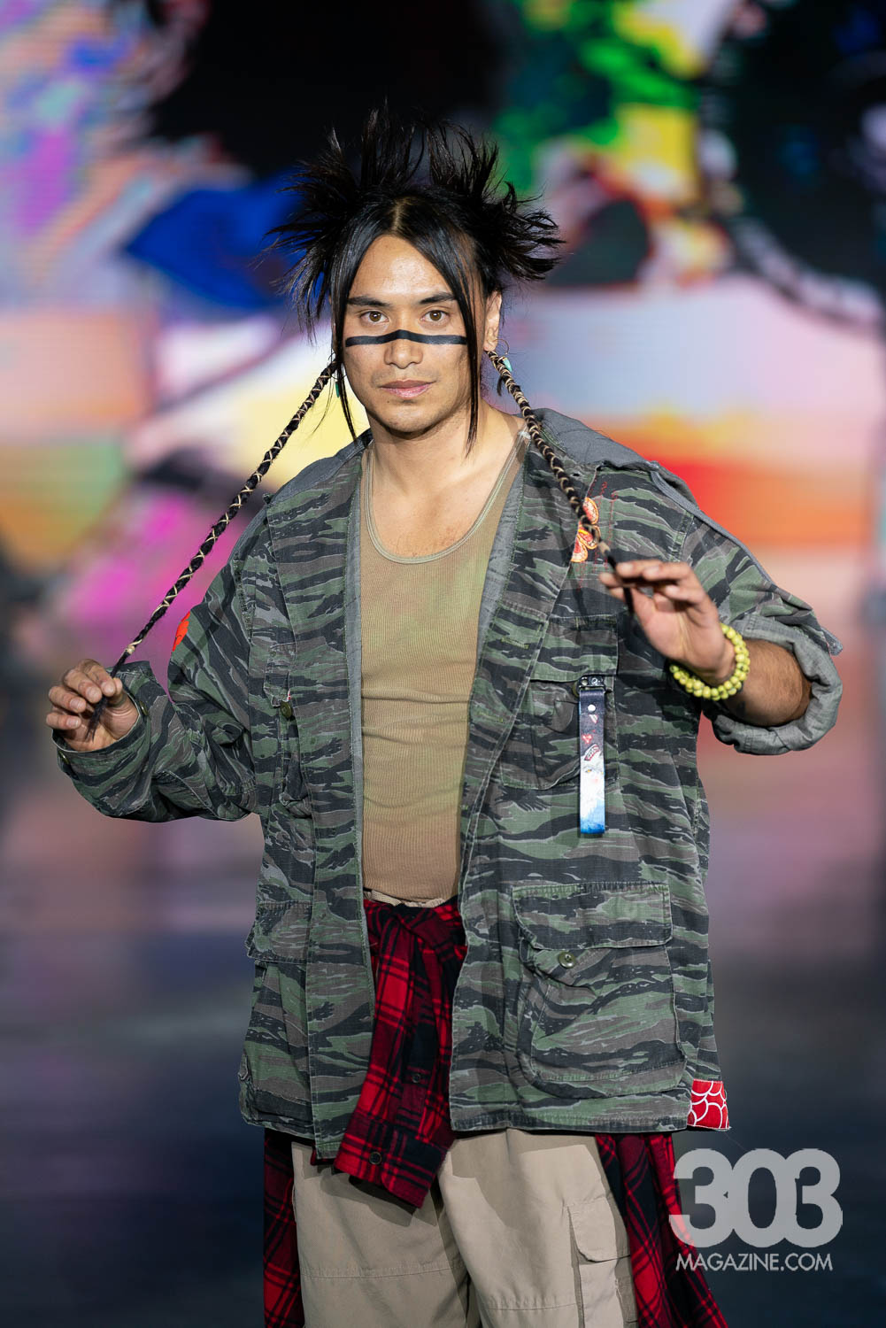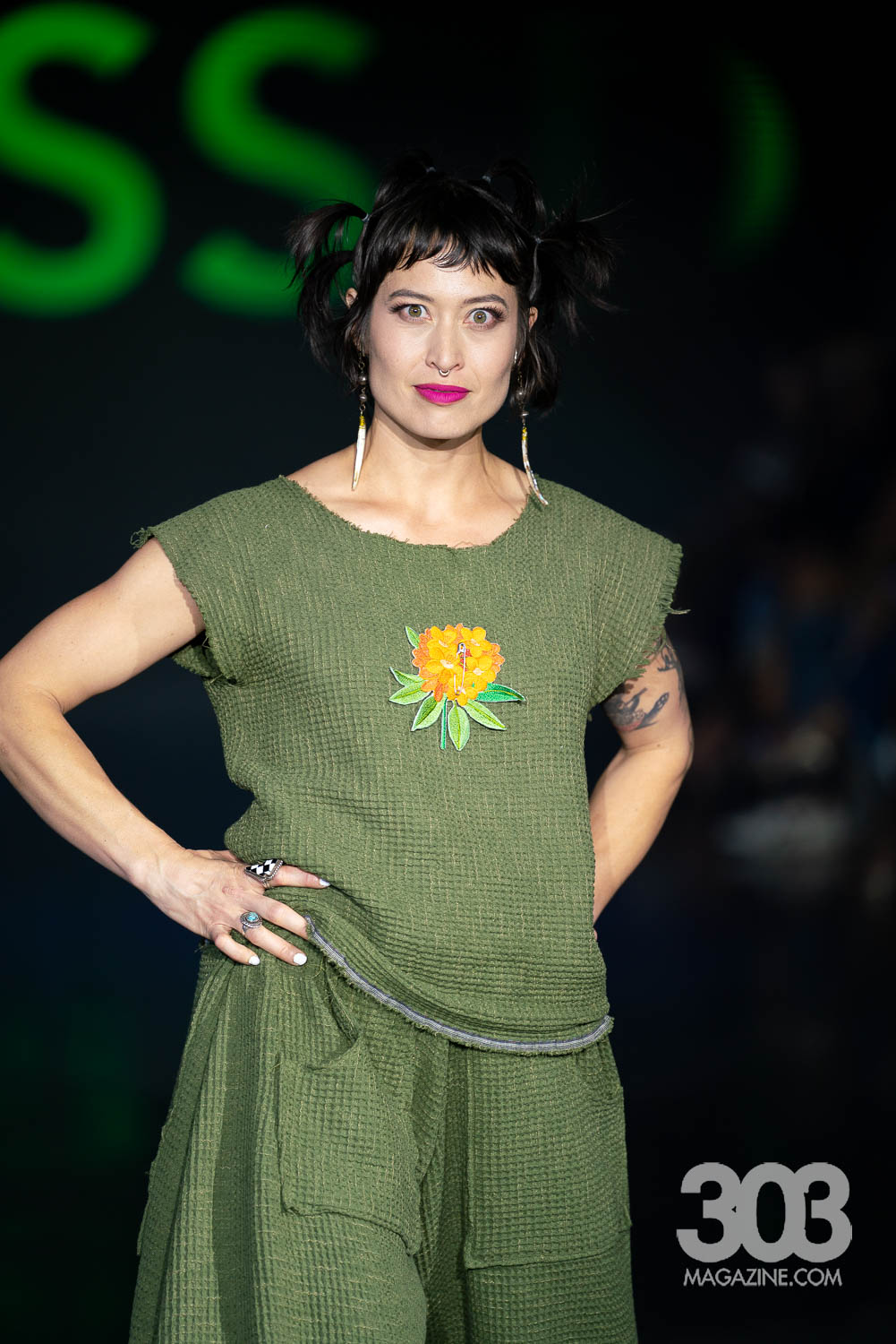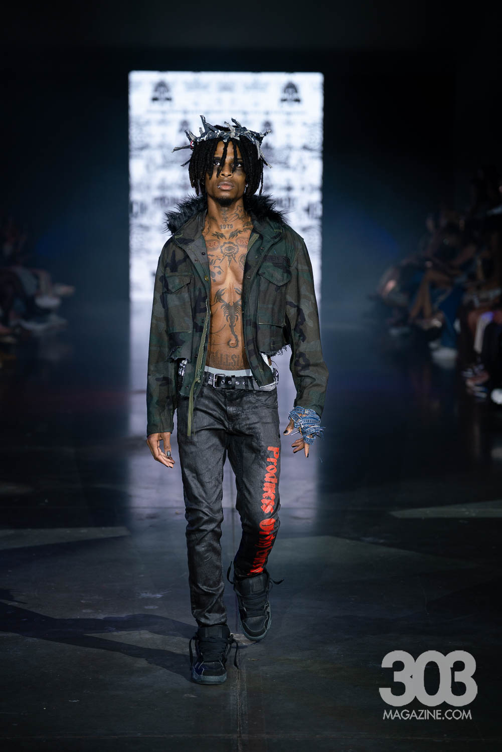 Flash + Rose’s runway look “For The Grrrls,” radiated pure tough-girl energy, turning the catwalk into a battleground of bold confidence and fearless fashion. The first model was a co-founder of Girls Skate Denver, an organization that empowers girls and builds confidence through skating. She skated down the runway to open the collection, setting a gritty energy for the rest of Flash + Rose’s segment.