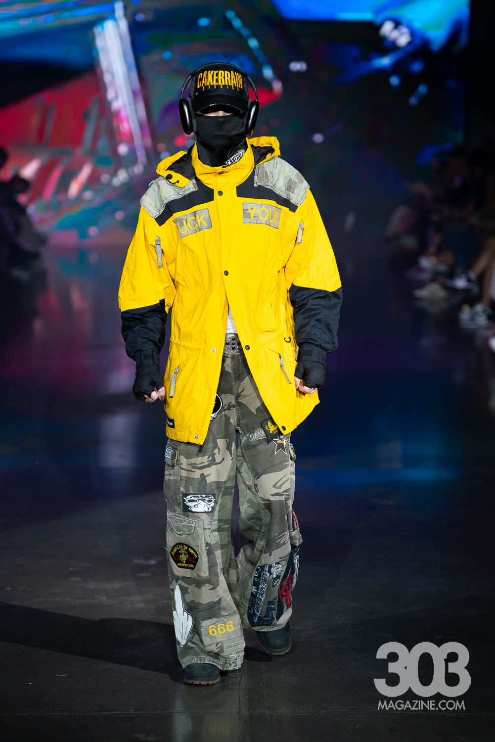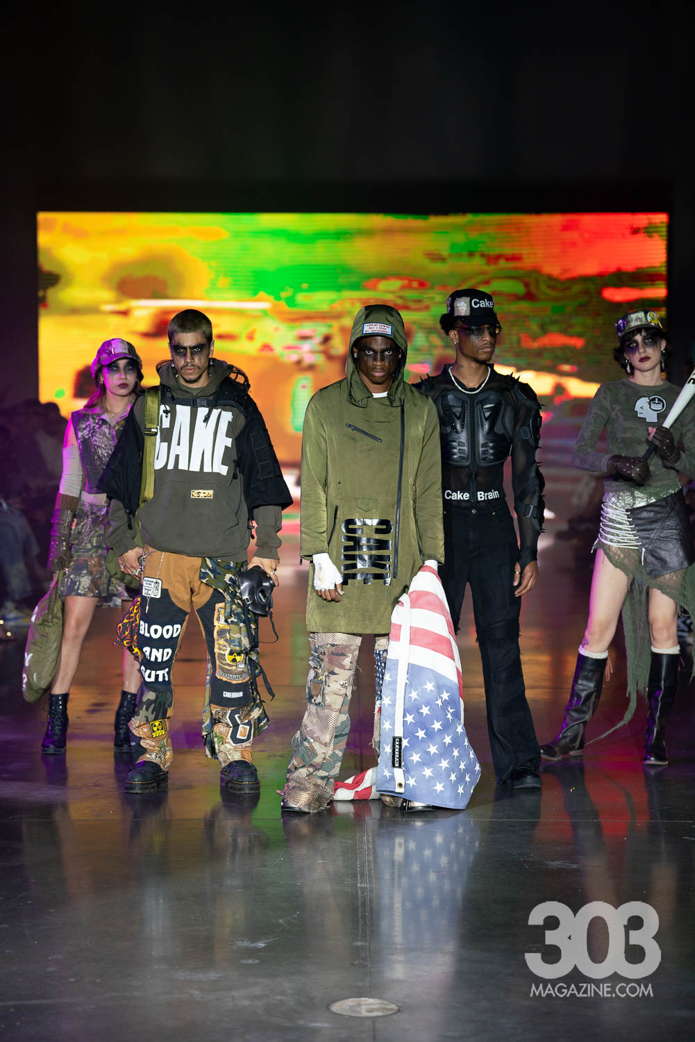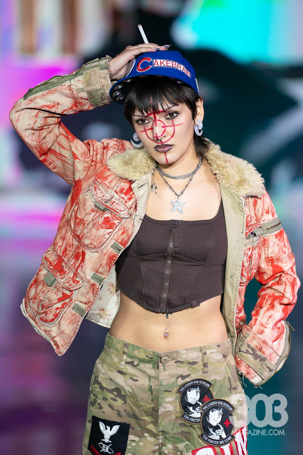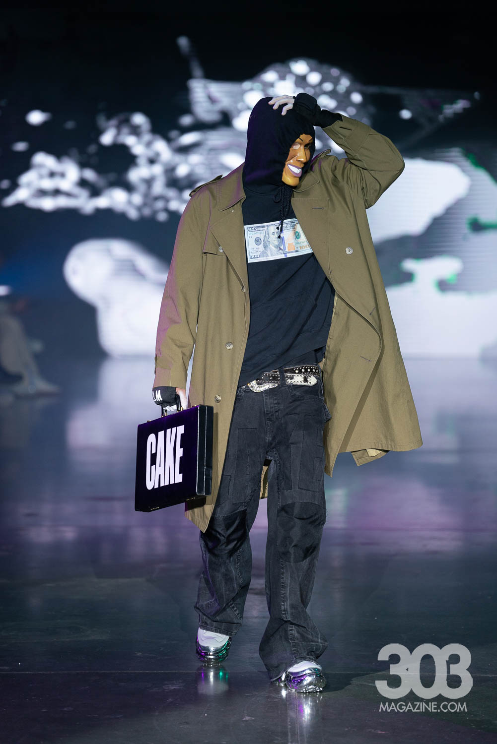 CAKEBRAIN brought a rebellious spectacle to the runway from start to finish, kicking off with the five-piece collection that earned the winning spot at the Emerging Designer Challenge. Things quickly took a bold turn when a masked model stormed the runway holding a briefcase labeled “CAKE” and flipping off the audience, setting the tone for what was to come. Each subsequent look amped up the intensity: expressive, fearless pieces that blurred the line between fashion and performance art. The grand finale saw the masked figure return, only to reveal himself as Ethan Hernandez, the visionary behind it all and a true mastermind orchestrating chaos with style.