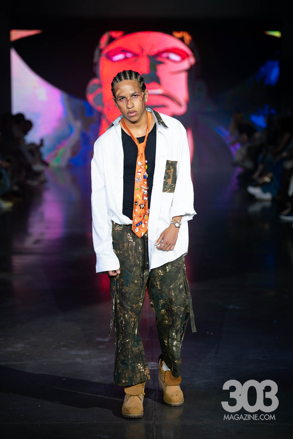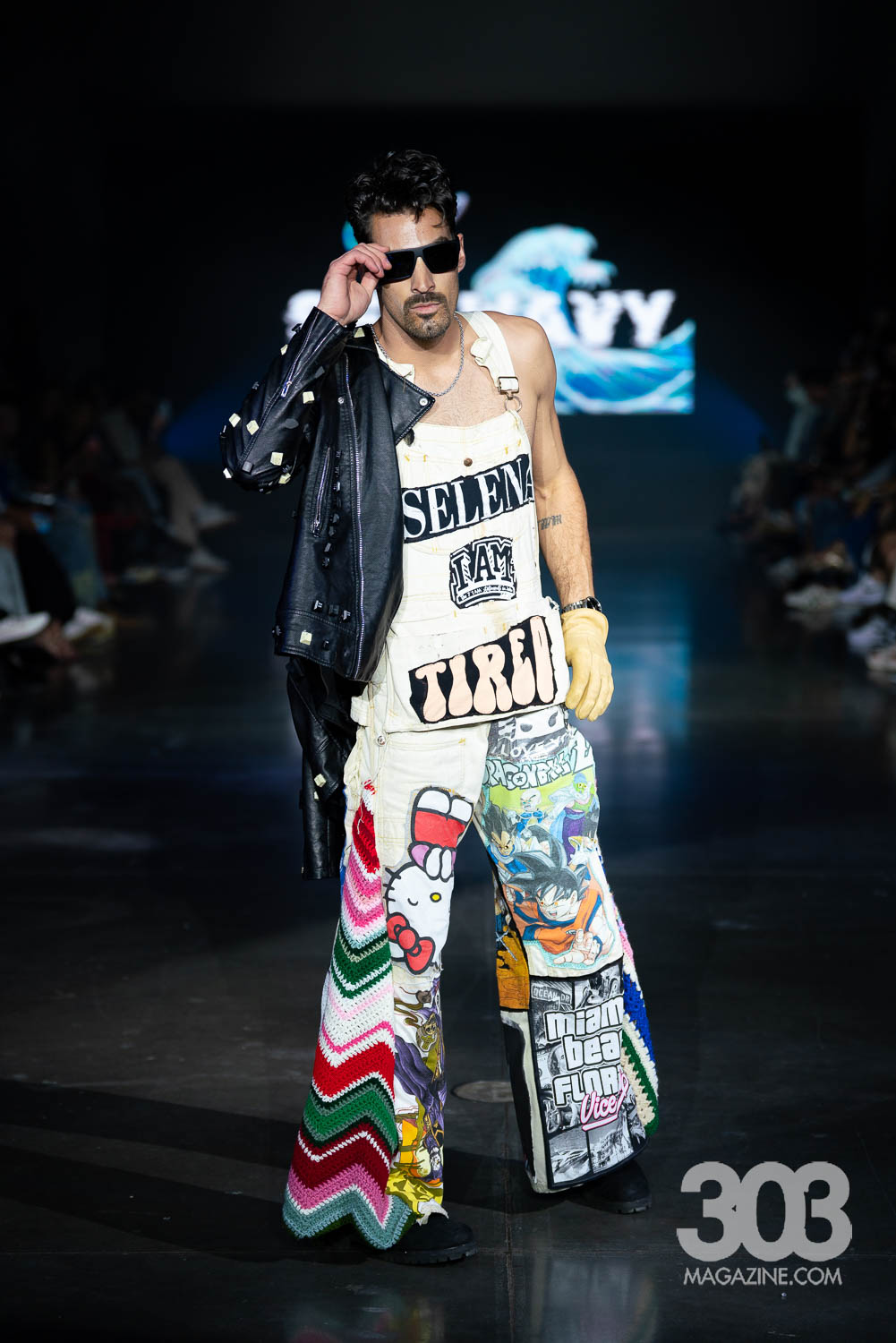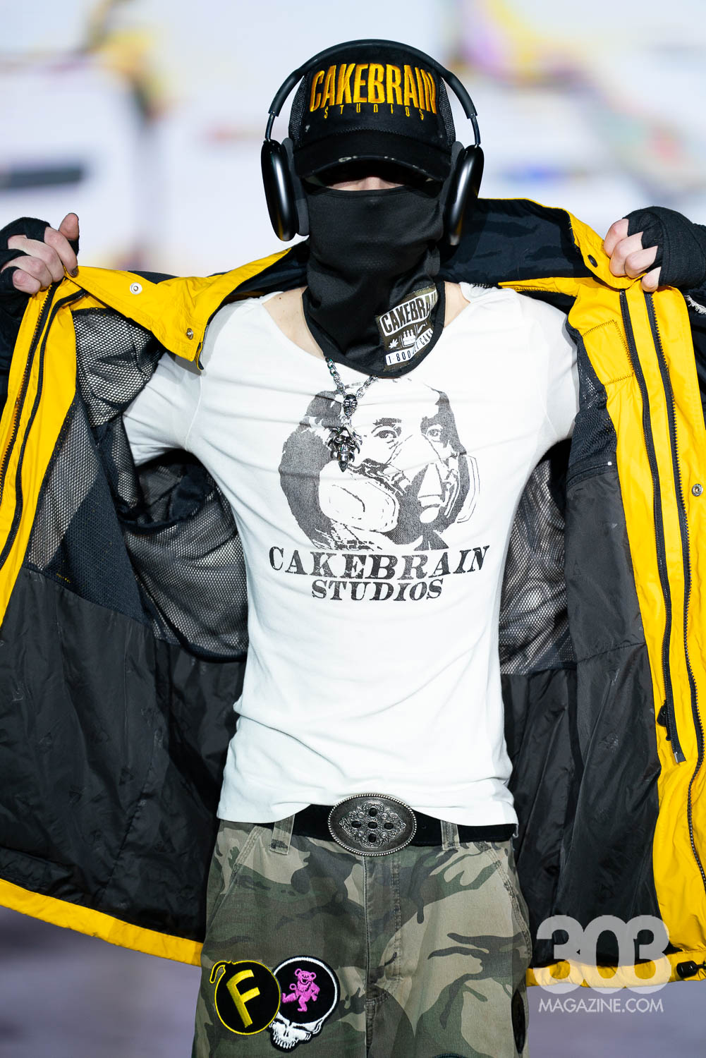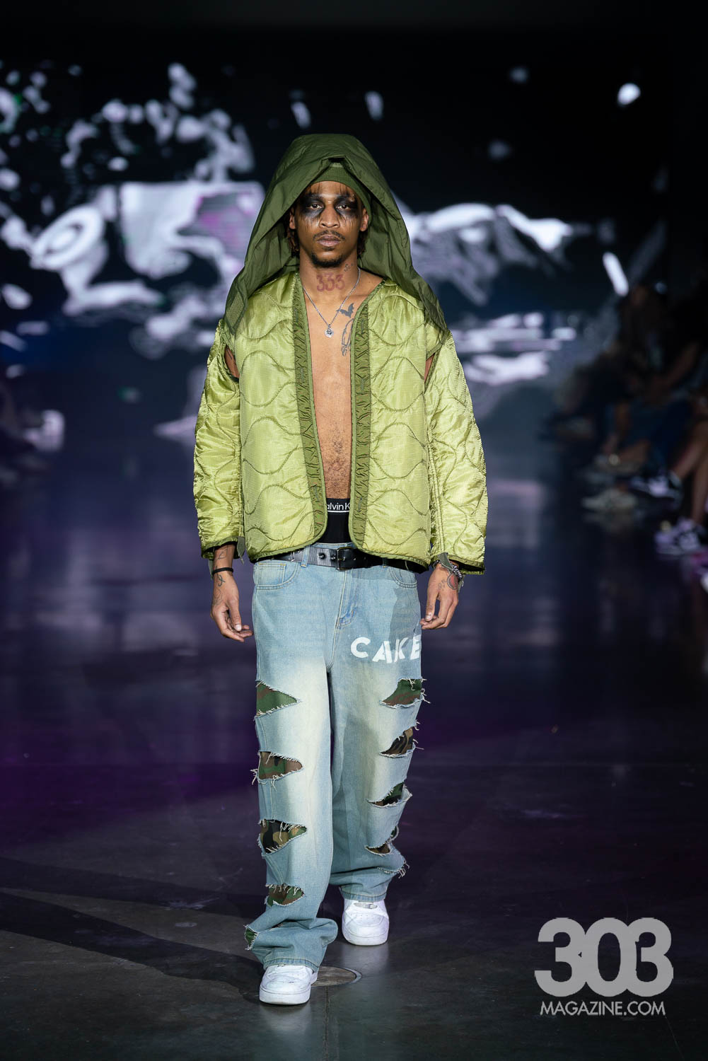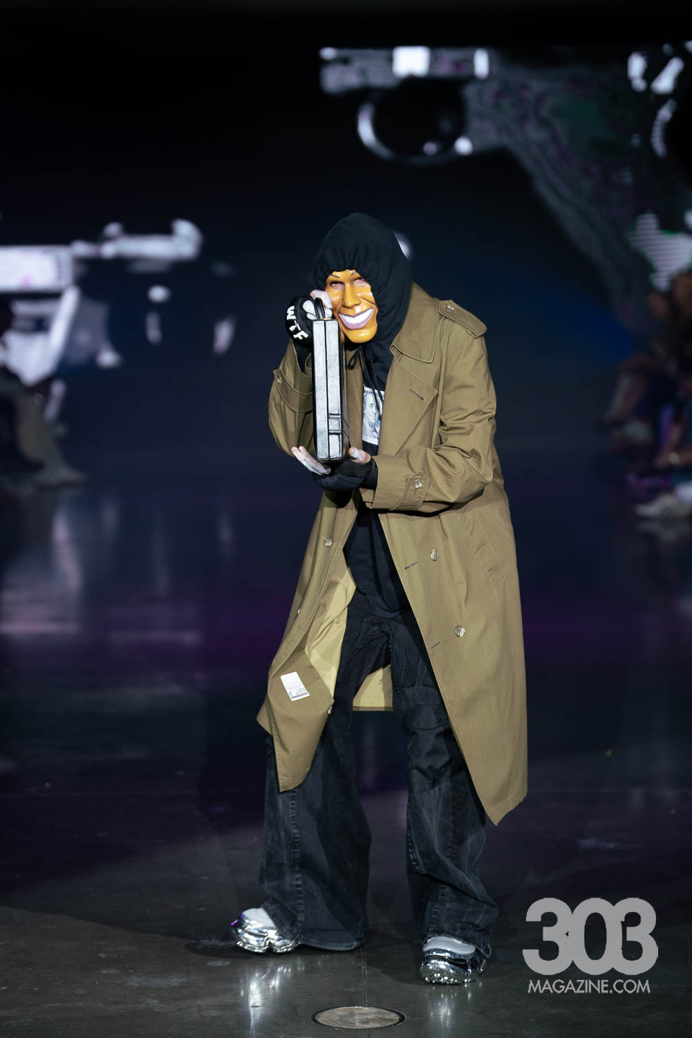 CAKEBRAIN brought a rebellious spectacle to the runway from start to finish, kicking off with the five-piece collection that earned the winning spot at the Emerging Designer Challenge. Things quickly took a bold turn when a masked model stormed the runway holding a briefcase labeled “CAKE” and flipping off the audience, setting the tone for what was to come. Each subsequent look amped up the intensity: expressive, fearless pieces that blurred the line between fashion and performance art. The grand finale saw the masked figure return, only to reveal himself as Ethan Hernandez, the visionary behind it all and a true mastermind orchestrating chaos with style.
