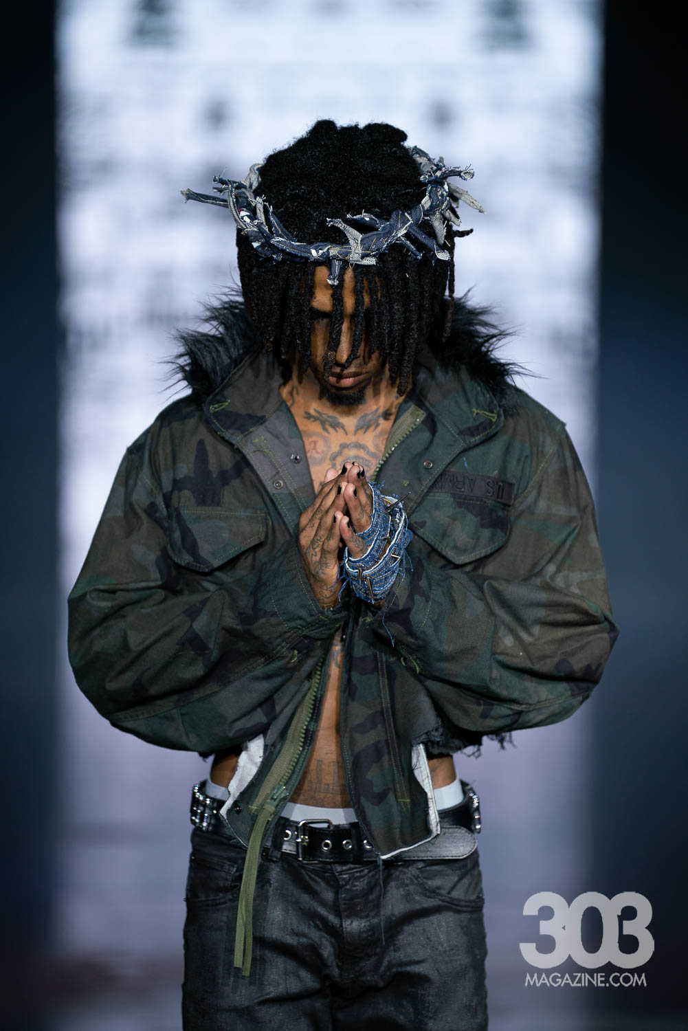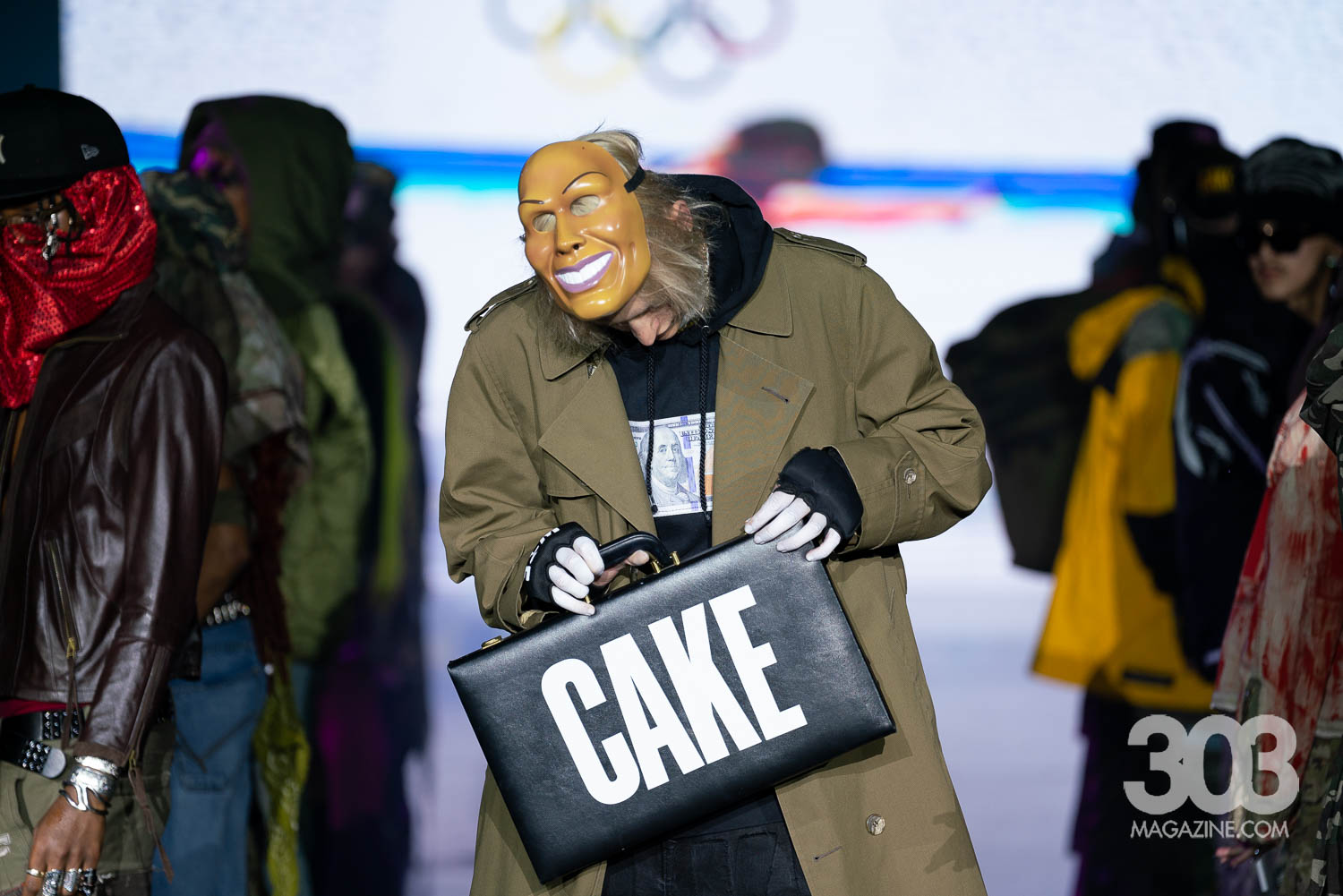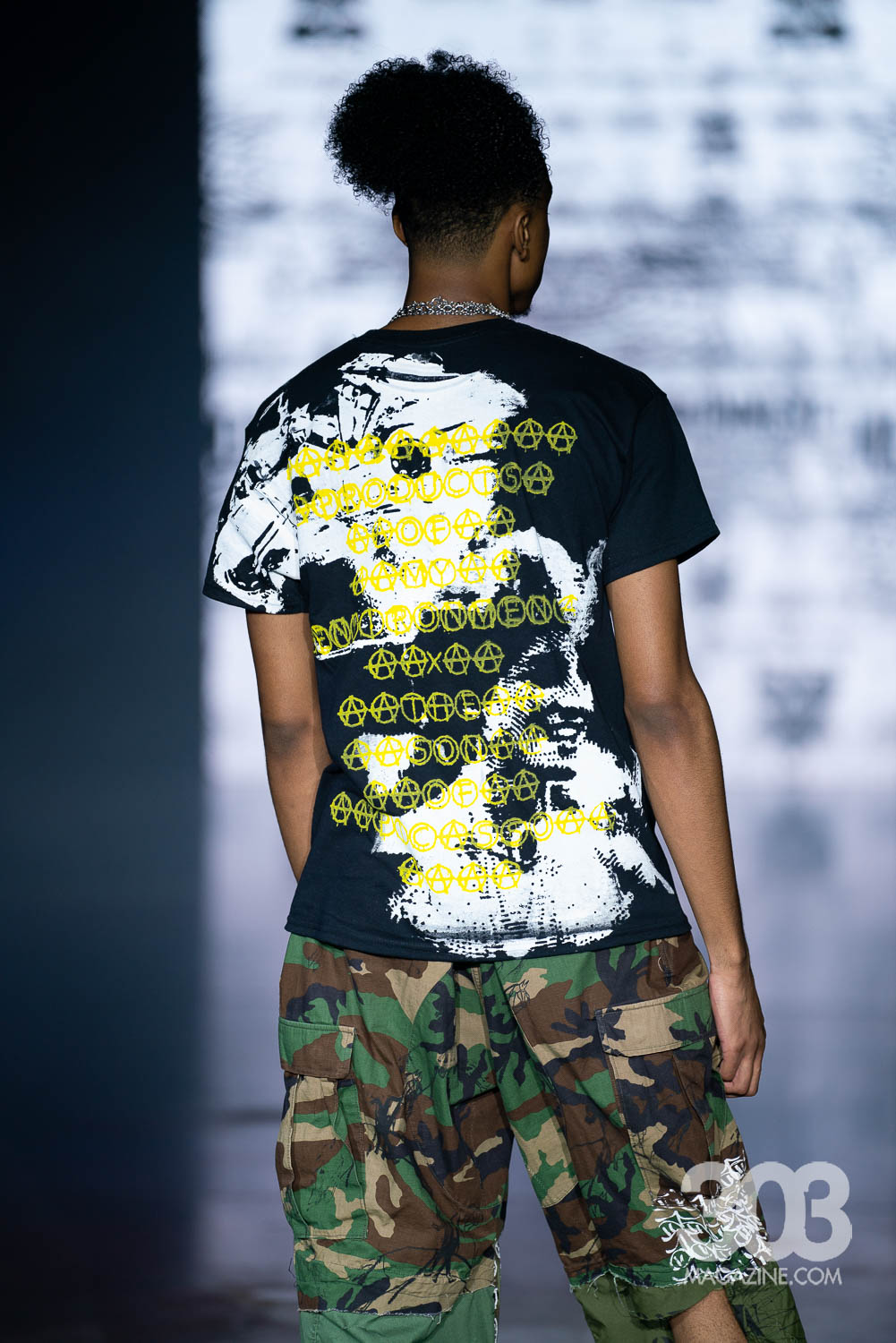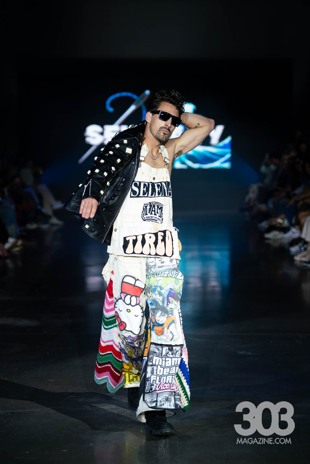 CAKEBRAIN brought a rebellious spectacle to the runway from start to finish, kicking off with the five-piece collection that earned the winning spot at the Emerging Designer Challenge. Things quickly took a bold turn when a masked model stormed the runway holding a briefcase labeled “CAKE” and flipping off the audience, setting the tone for what was to come. Each subsequent look amped up the intensity: expressive, fearless pieces that blurred the line between fashion and performance art. The grand finale saw the masked figure return, only to reveal himself as Ethan Hernandez, the visionary behind it all and a true mastermind orchestrating chaos with style.