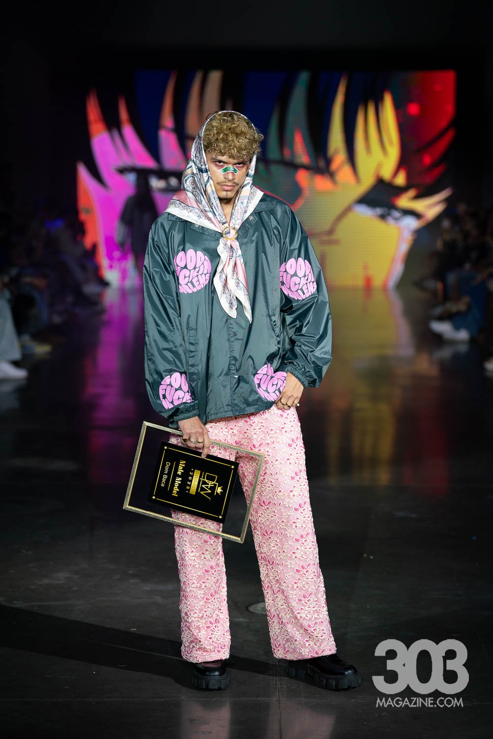 The night came to a lively close with GOOD PROBLEMS, whose collection delivered fresh, playful takes on streetwear that felt both nostalgic and new. Models hit the runway clutching stuffed animals, blending youthful charm with edgy, contemporary styling. The looks reimagined streetwear with bold colors, unexpected textures and a carefree attitude that felt effortlessly cool. Capping off the show, model Dom Baca made a standout appearance, proudly carrying his Male Model of the Year plaque.