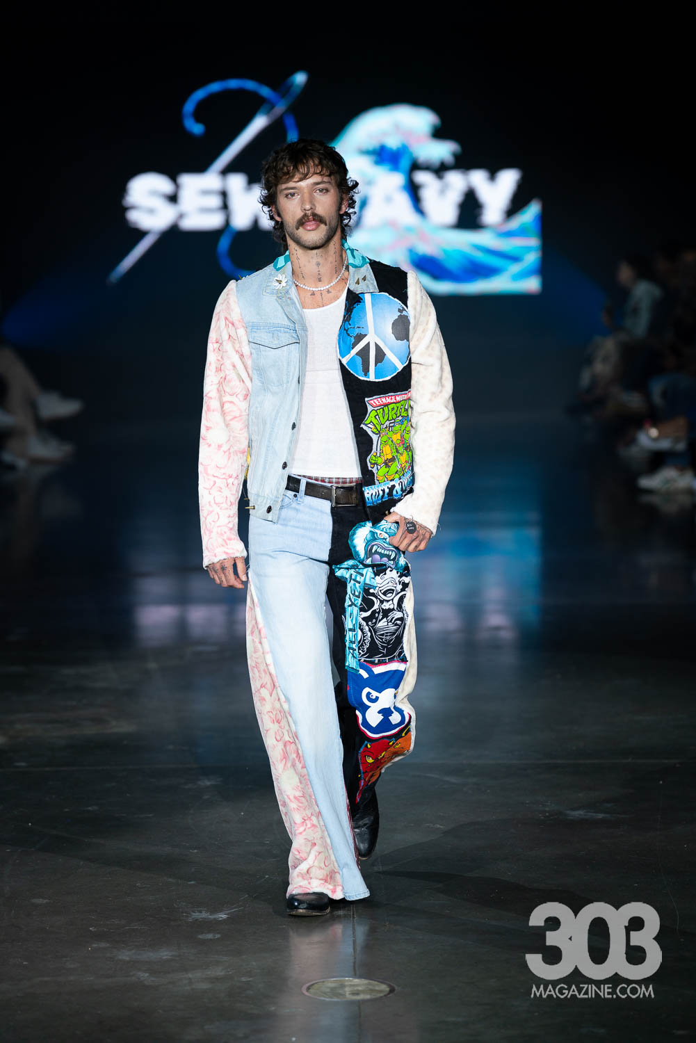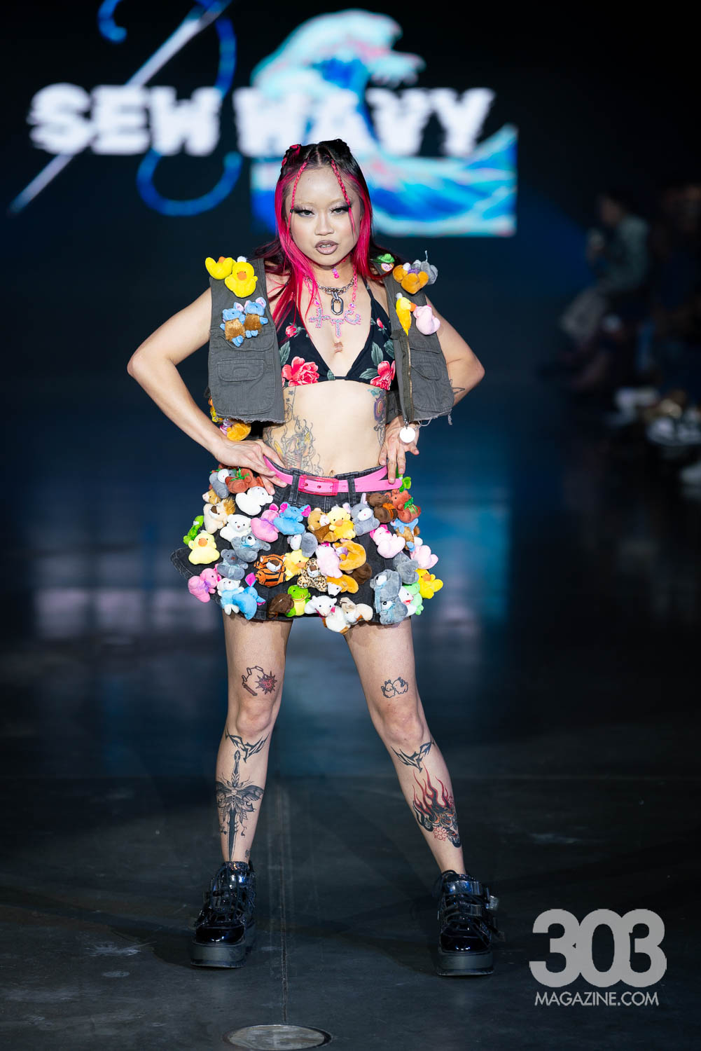 Sew Wavy’s collection was a playful parade of nostalgia and whimsy, with each model strutting down the runway at a deliberate pace, inviting the audience to take in every imaginative detail. The spotlight was on two-piece matching sets, each one uniquely adorned with stuffed animal charms, glittering sparkles, toy cars, painstaking patchwork and other treasures. The result was a joyful clash of fashion and fantasy, an ode to carefree creativity wrapped in bold, expressive styling.