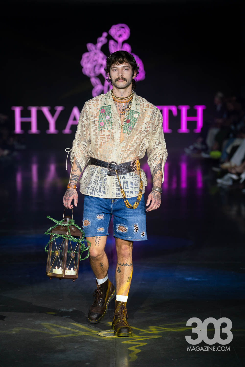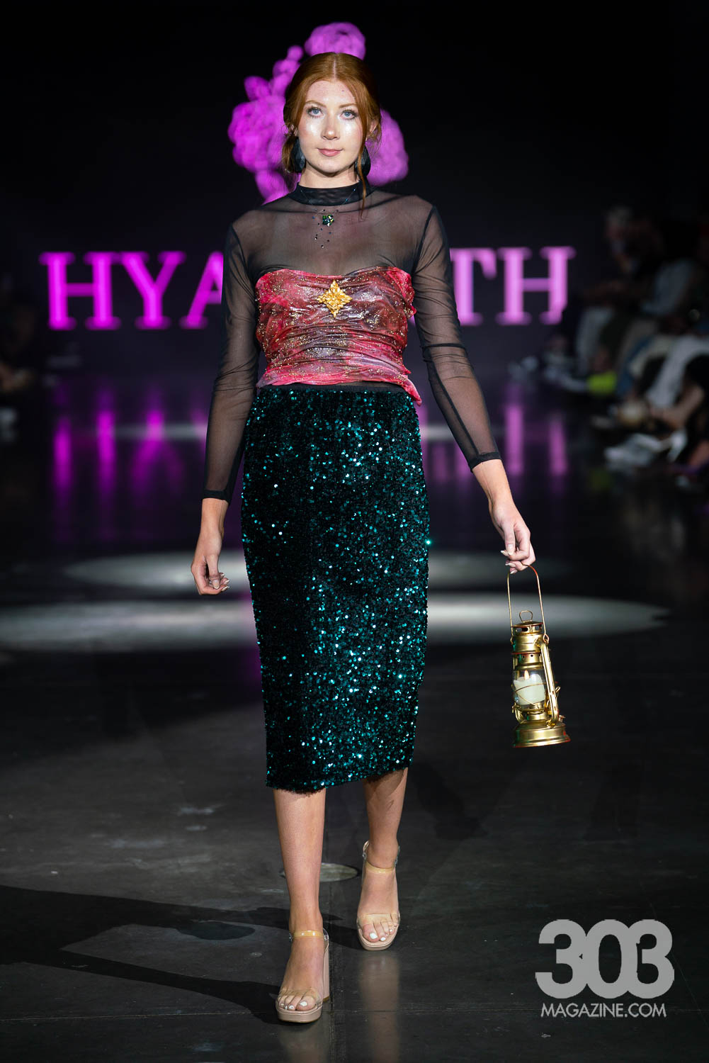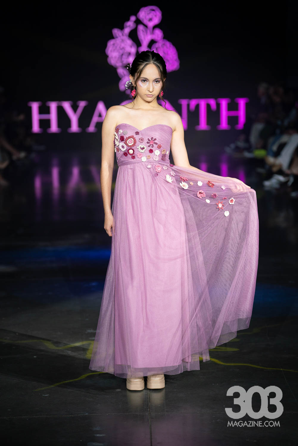 The first brand to strut down the runway was Hyacinth, designed by Rachel Hazelwood. The runway shimmered with enchantment as models floated down like woodland spirits, each carrying delicate props: glowing lanterns, sprigs of baby’s breath or ethereal wings. The air was filled with a low, magical hum of music that set a dreamlike tone, perfectly complementing the sheer fabrics and glistening tulle that draped their bodies. Sparkles caught the light with every movement as the entire show felt dreamlike.