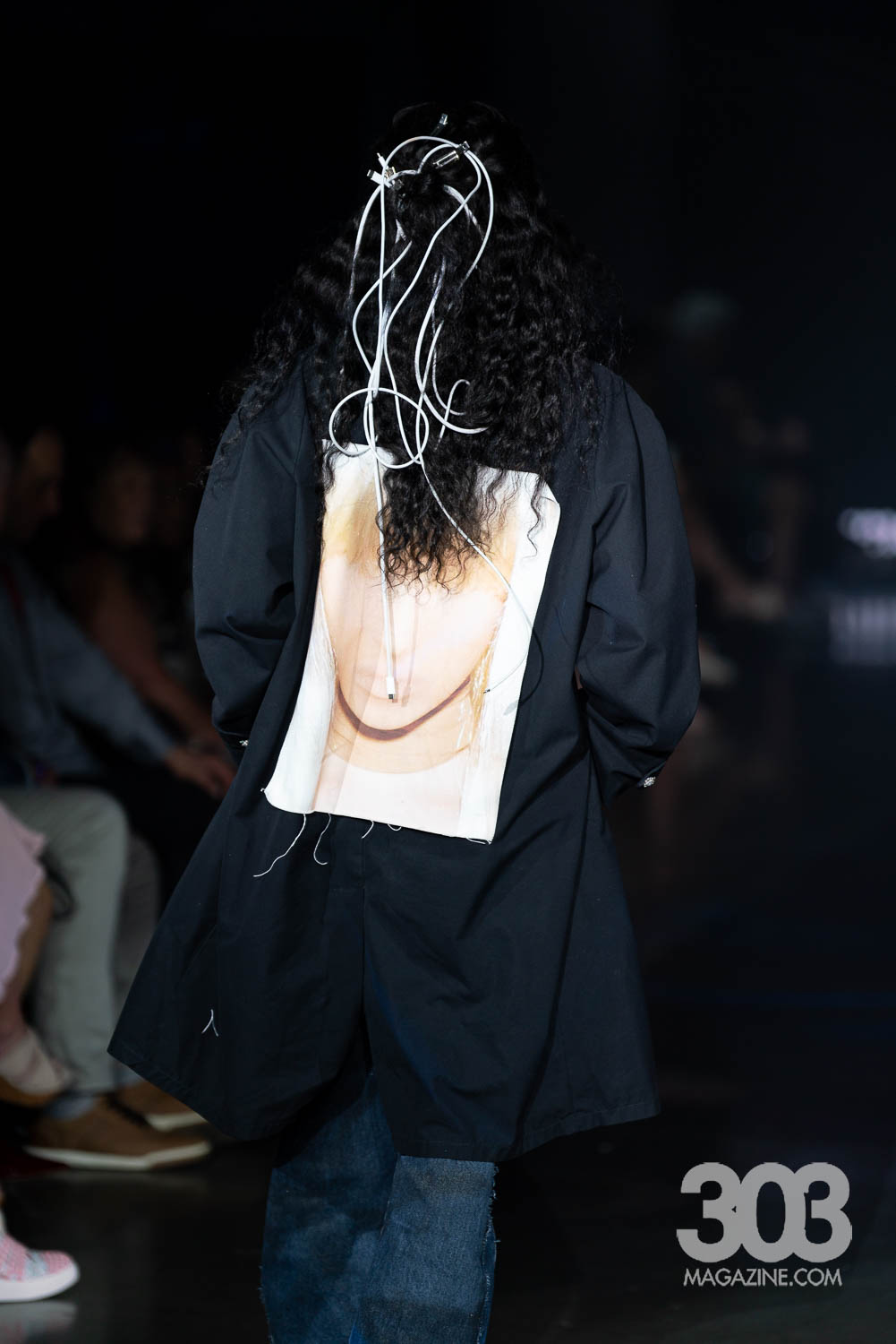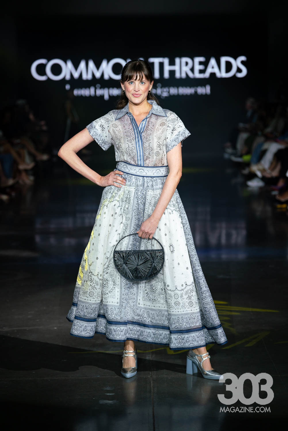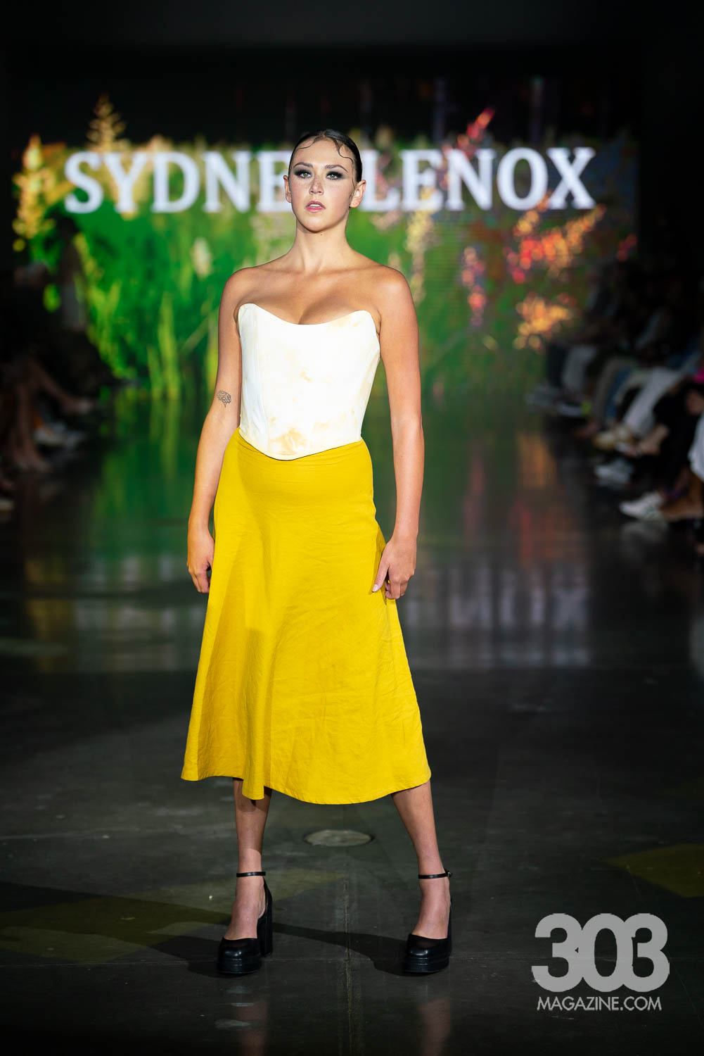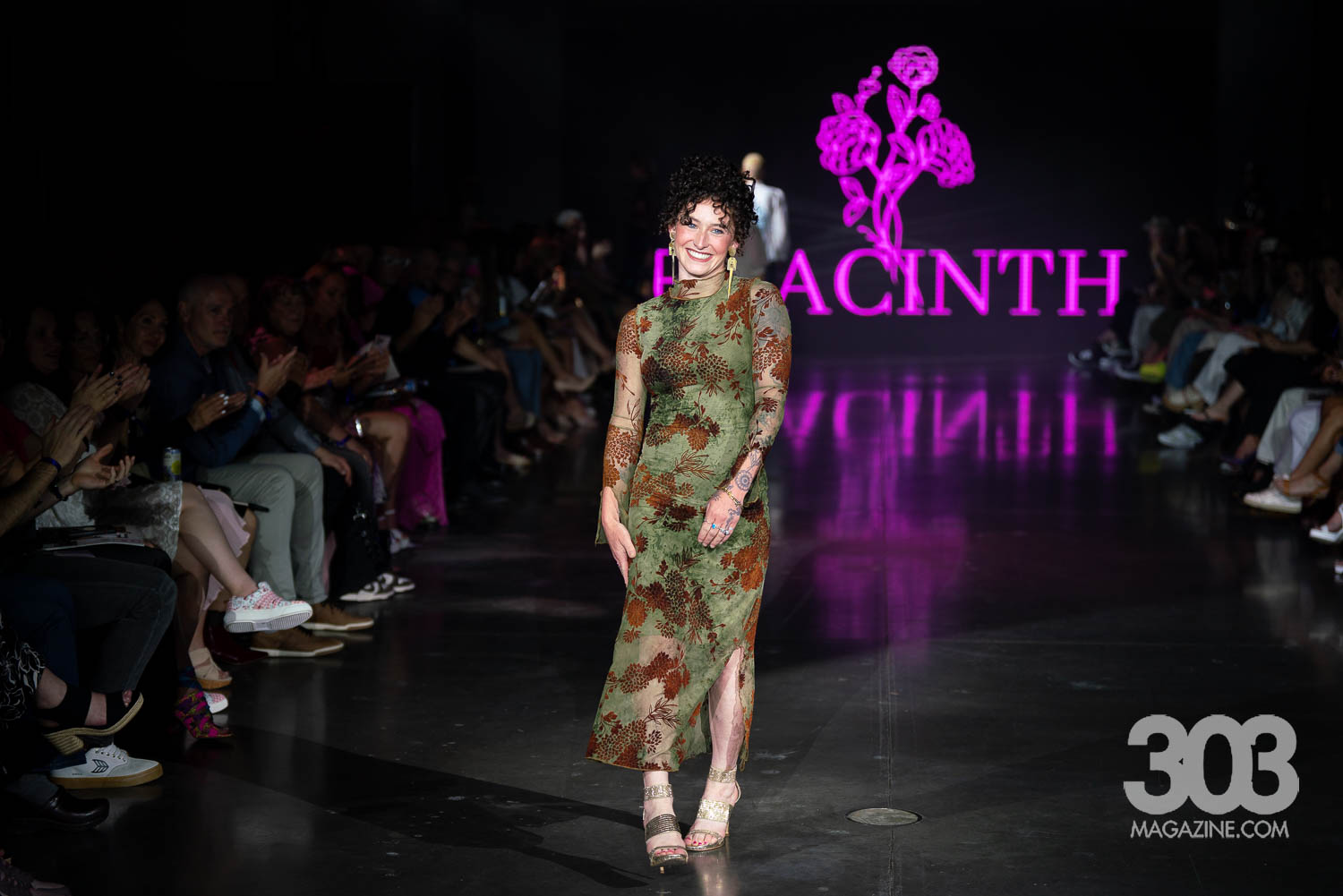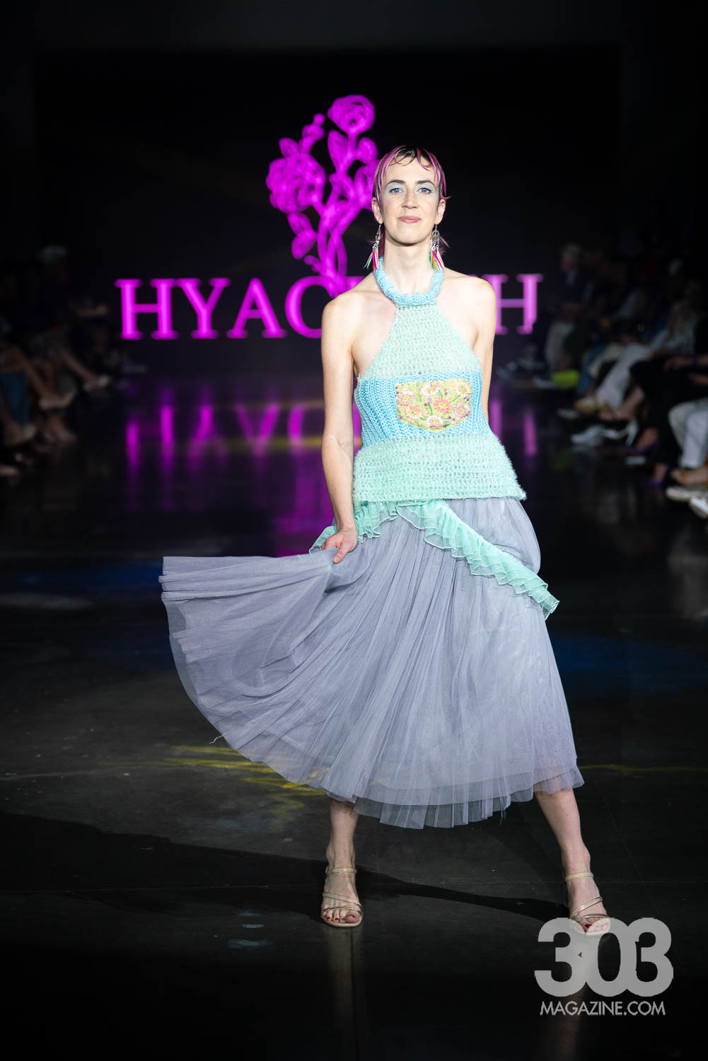 As guests started finding their way to their seats and the lights started to dim, the night welcomed host Smitty of Channel 93.3 Colorado Alternative radio. Smitty, dressed by Common Threads, prepared us for the night ahead. Six sustainable designers, Hyacinth, Sydney Lennox, Common Threads, Brandi McMichael, Abstraction and Garms 1 of 1 showed powerful collections, marking the official beginning of the Spring 2025 season.