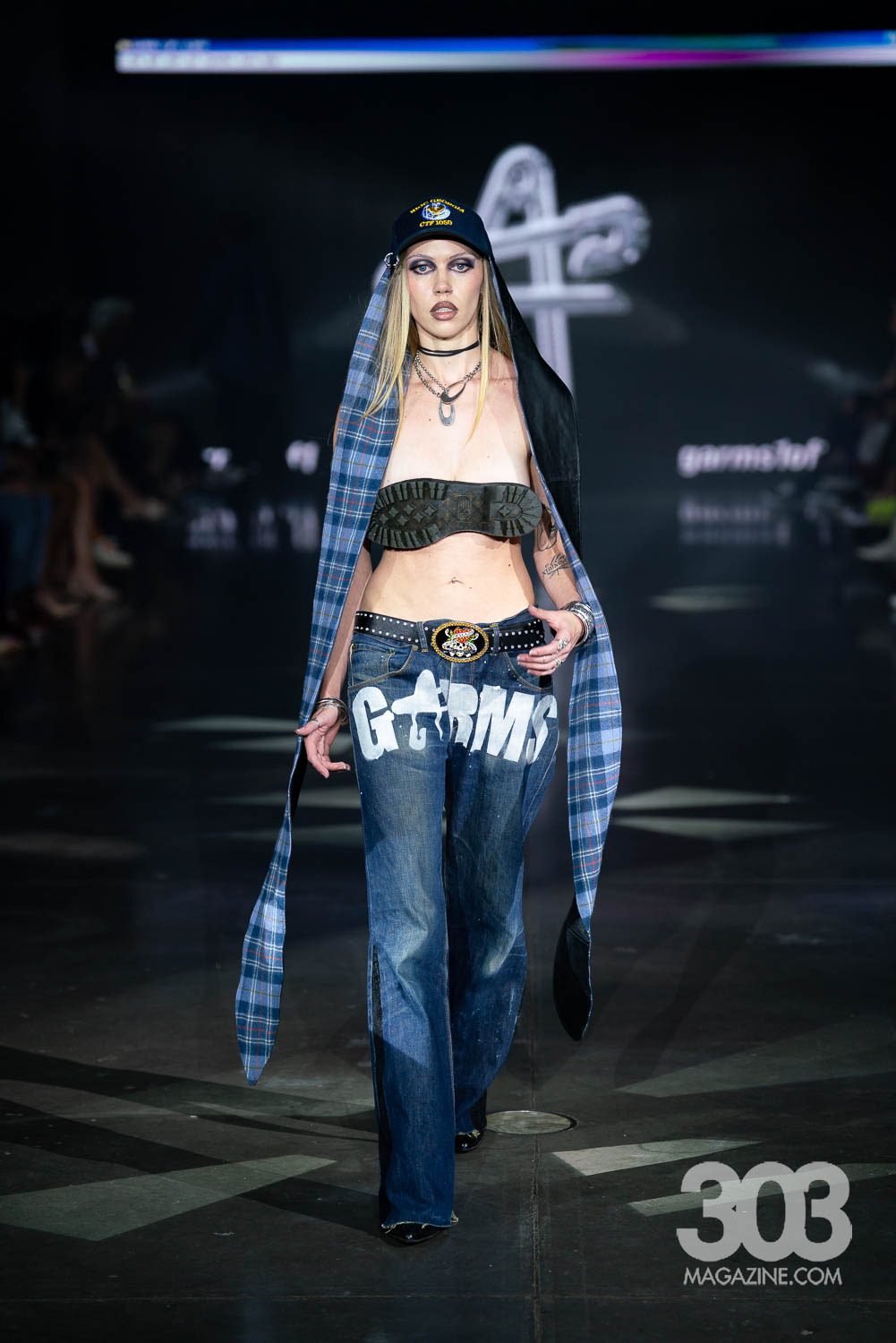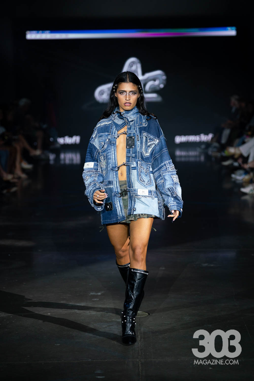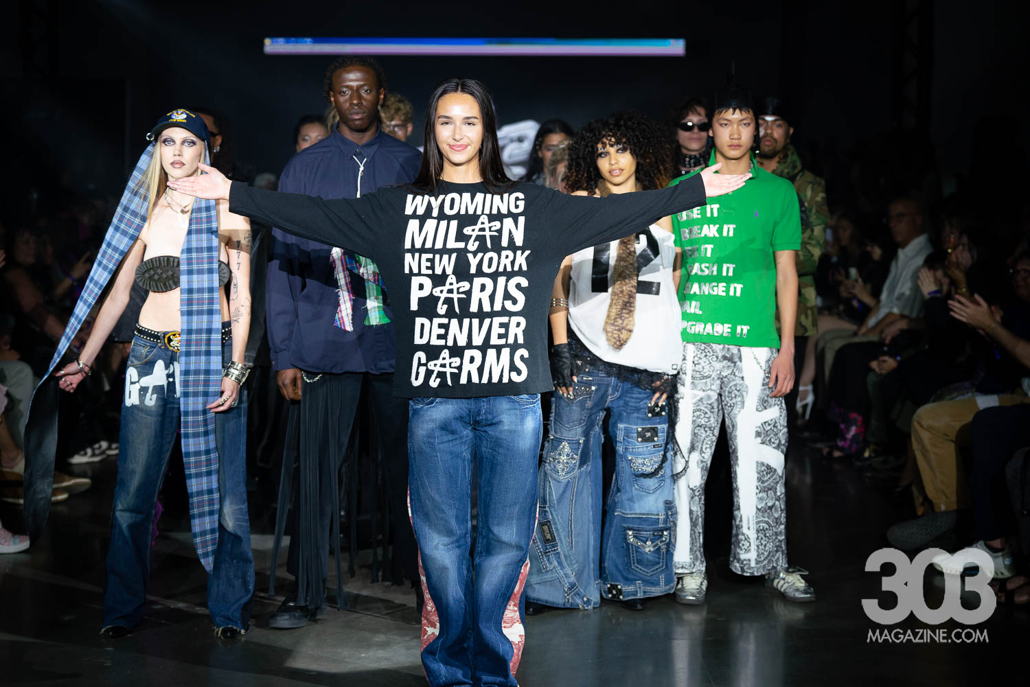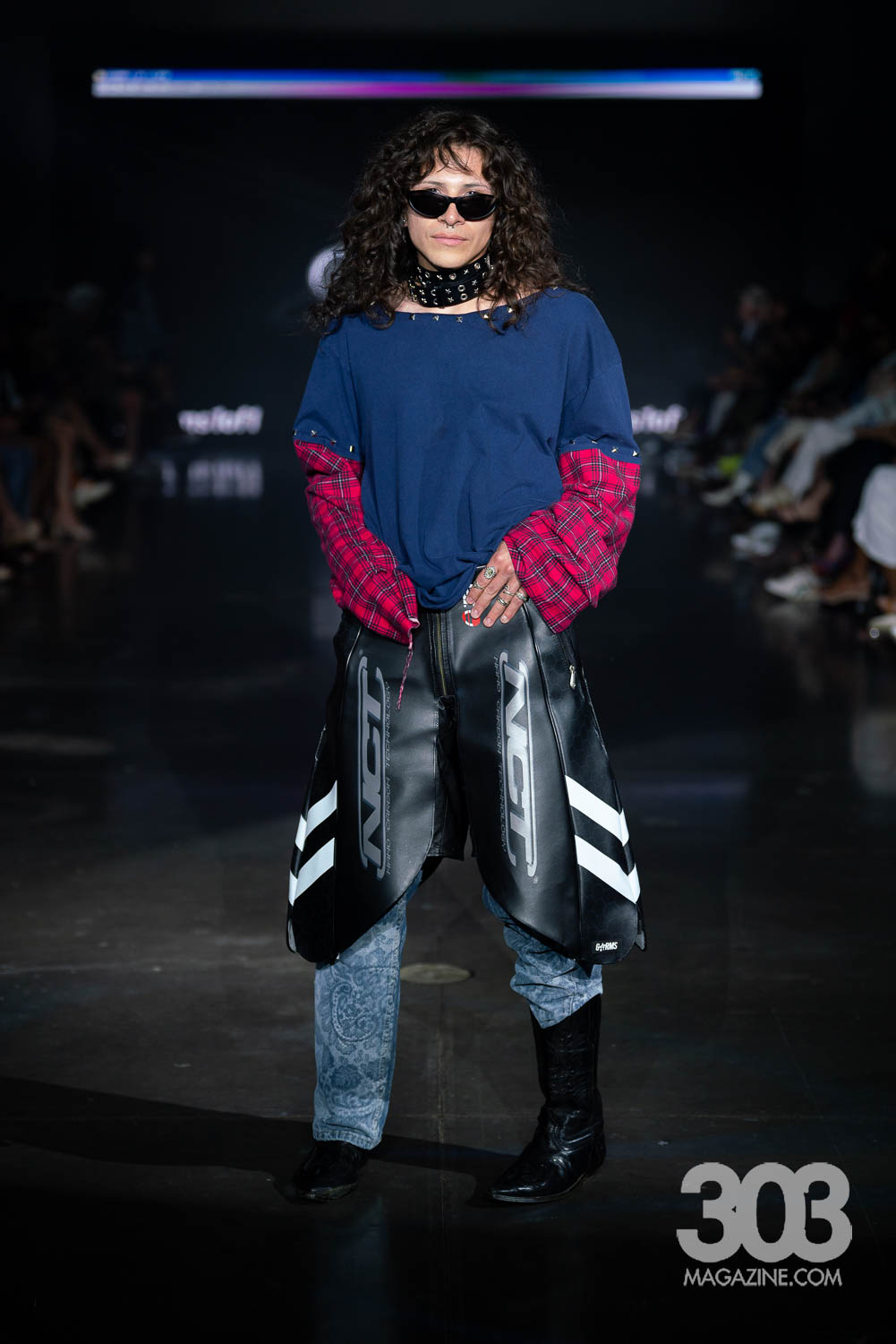 Garms 1 of 1 closed the show with an electrifying digital display on the screen and Daft Punk’s “Technologic,” blaring through the speakers. Having made waves in Milan, Paris, New York Wyoming, and previous Denver Fashion Week seasons, Ari Burback brought once again delivered an unforgettable experience. Bold, cutting-edge pieces stormed the runway, featuring striking uses of leather, reworked vintage, and even unexpected elements such as a model en pointe and the sole of a shoe repurposed into a daring top. Yes, the final look was a showstopper: a top crafted entirely from the sole of a Dr. Martens boot, with a belt holding the back. This collection proved one thing: Garms 1 of 1 continues to redefine fashion with fearless creativity and undeniable impact.