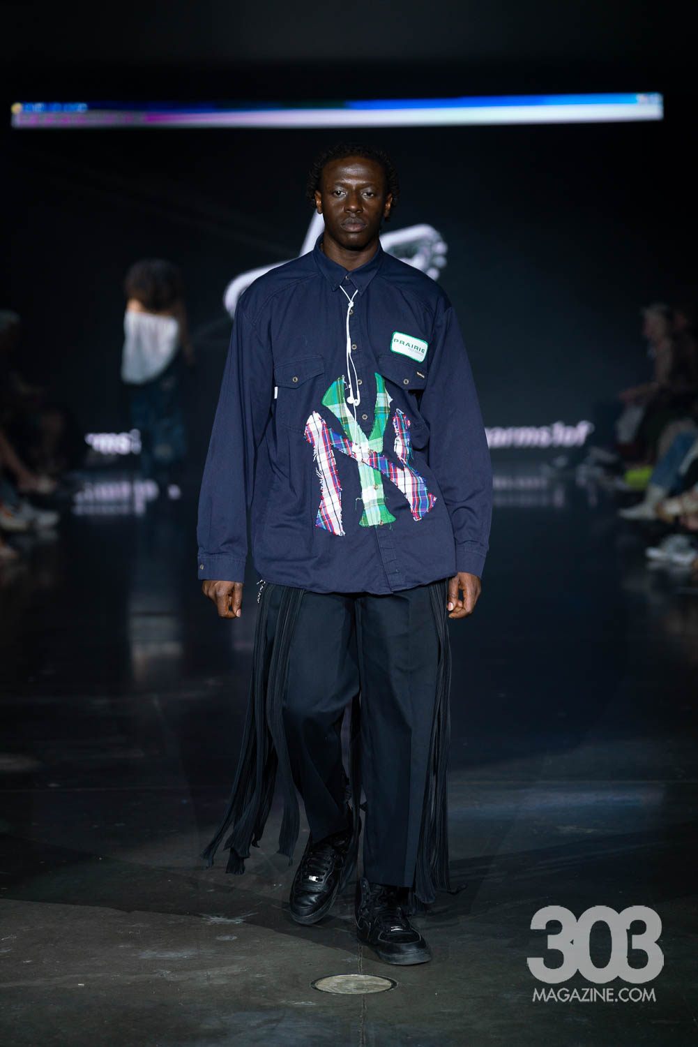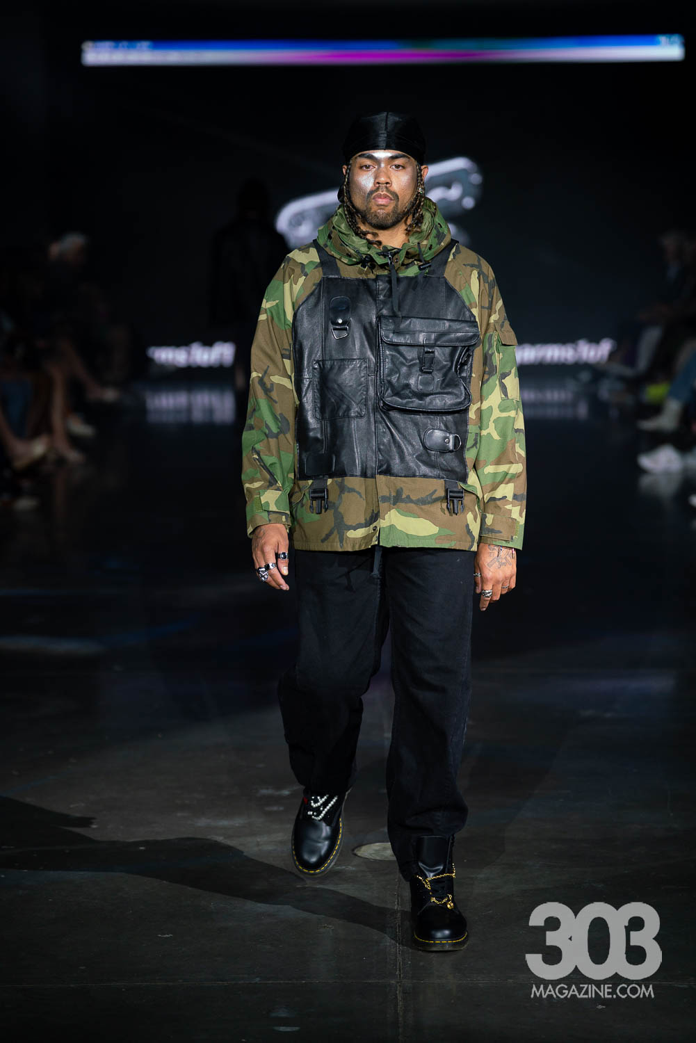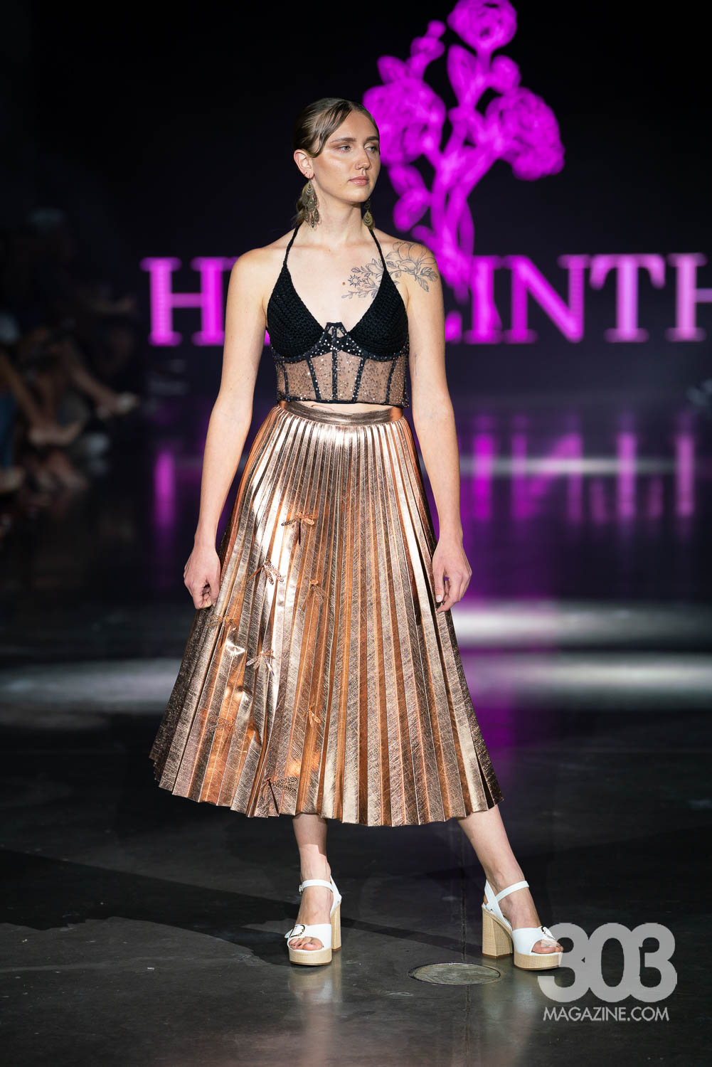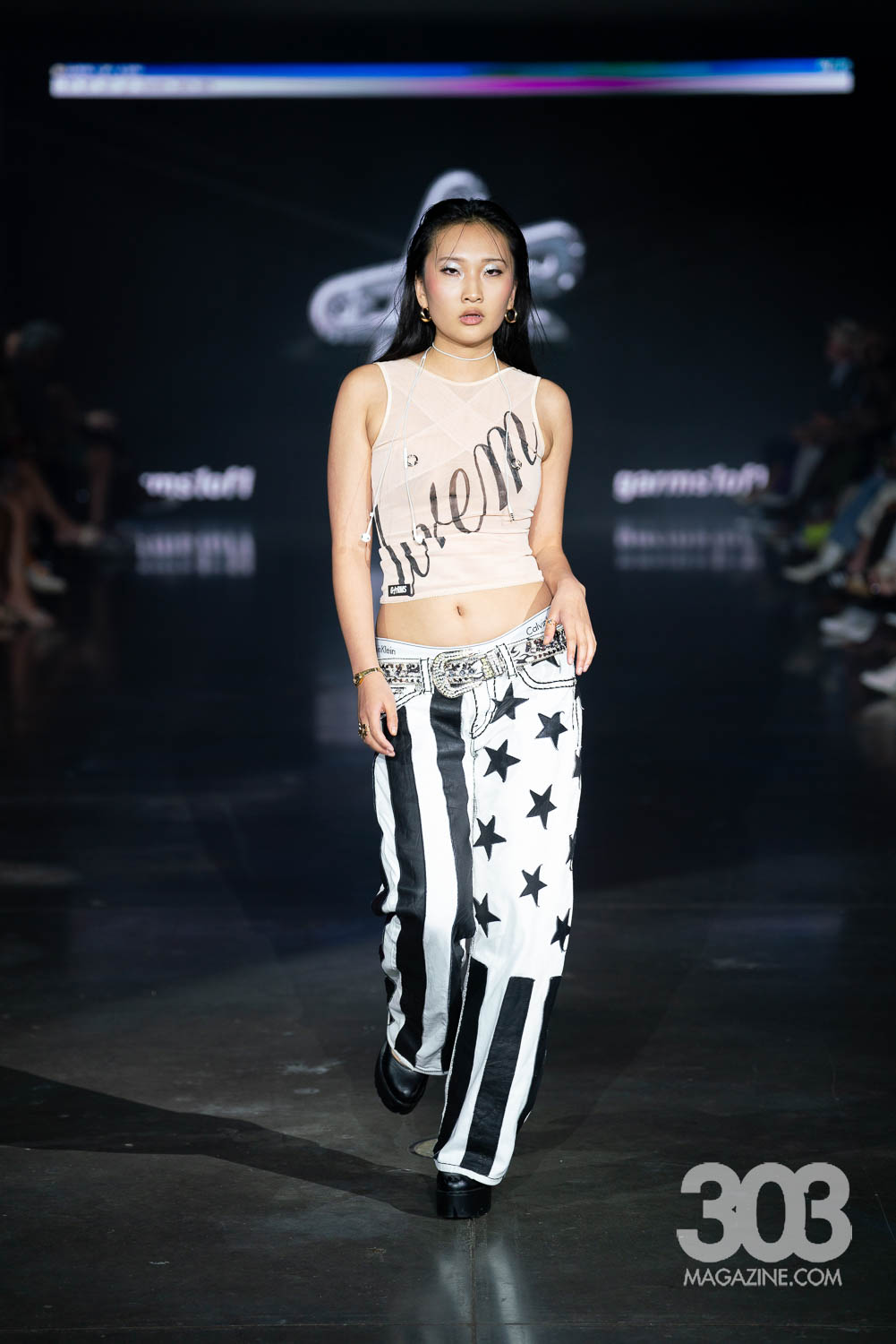 Garms 1 of 1 closed the show with an electrifying digital display on the screen and Daft Punk’s “Technologic,” blaring through the speakers. Having made waves in Milan, Paris, New York Wyoming, and previous Denver Fashion Week seasons, Ari Burback brought once again delivered an unforgettable experience. Bold, cutting-edge pieces stormed the runway, featuring striking uses of leather, reworked vintage, and even unexpected elements such as a model en pointe and the sole of a shoe repurposed into a daring top. Yes, the final look was a showstopper: a top crafted entirely from the sole of a Dr. Martens boot, with a belt holding the back. This collection proved one thing: Garms 1 of 1 continues to redefine fashion with fearless creativity and undeniable impact.