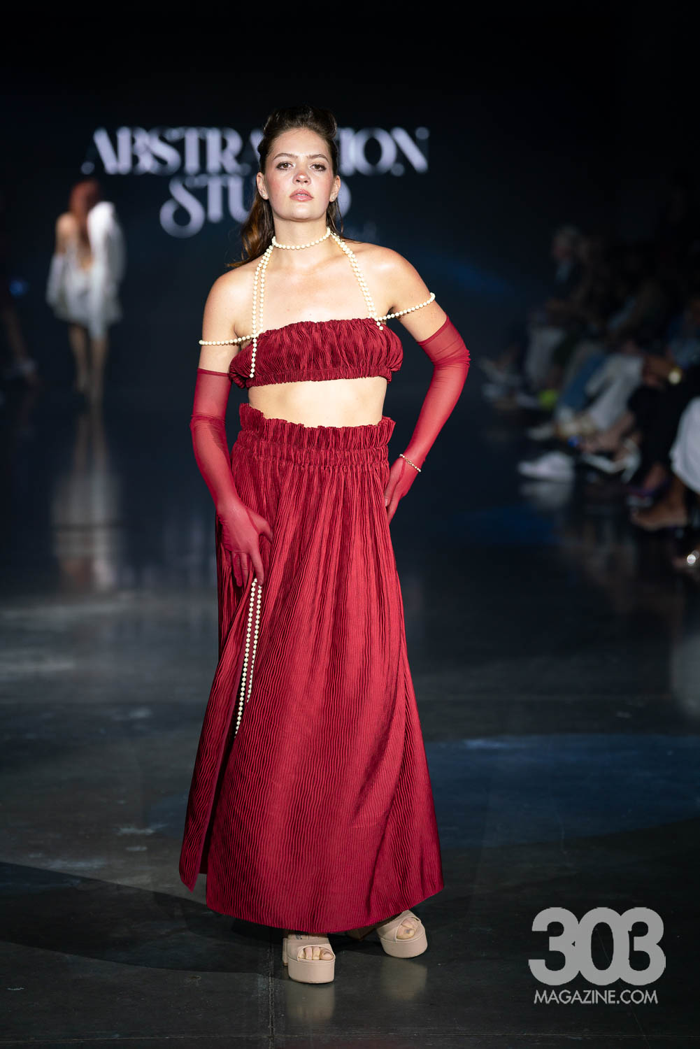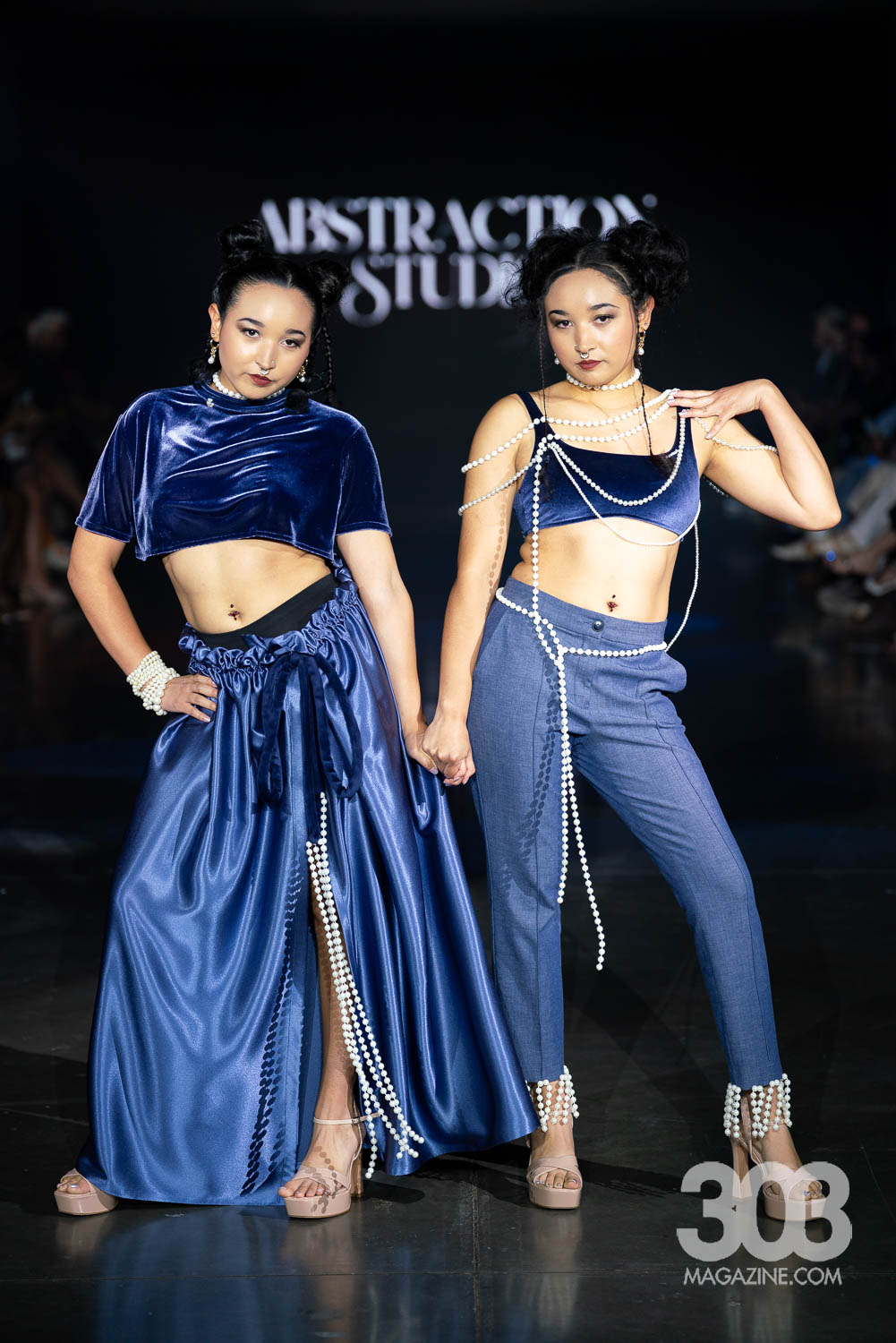 Abstraction Design opened with a striking video that set the tone for the show, displaying messages that established her collection as one of resistance, strength and transformation. As each look graced the runway, pearls appeared as a recurring motif, captivating the audience with their subtle strength. The color story flowed seamlessly, with tones of white, maroon, silver-grey, and blue presented in perfect harmony. Another set of twins, models Destiny and Desirae Sanchez, made an appearance, dressed in impeccably coordinated outfits that highlighted the thoughtful craftsmanship behind the collection. Every garment was executed with elegance, intention, and a quiet sense of power.