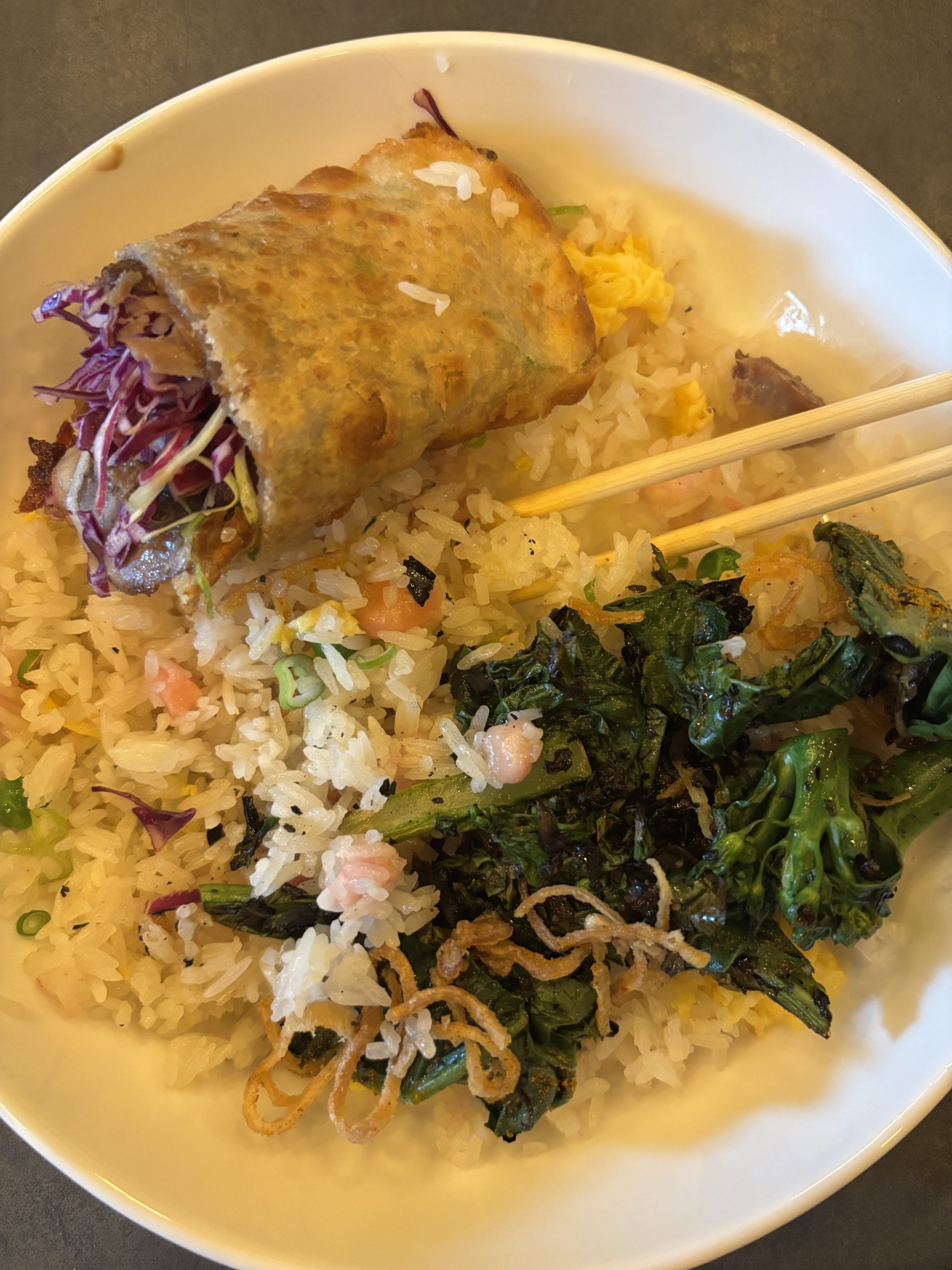 Duck roll with gai lan and bone marrow fried rice. Photo by Amber Wyatt