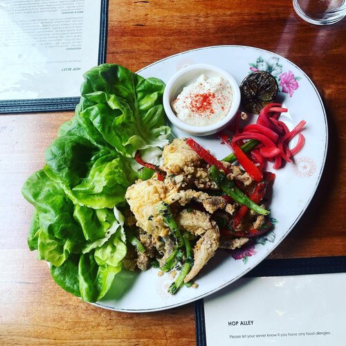 Salt & Pepper Soft Shell Crabs with bibb lettuce wraps, charred lime aioli and pickled red onion. Photo courtesy of Hop Alley on Instagram