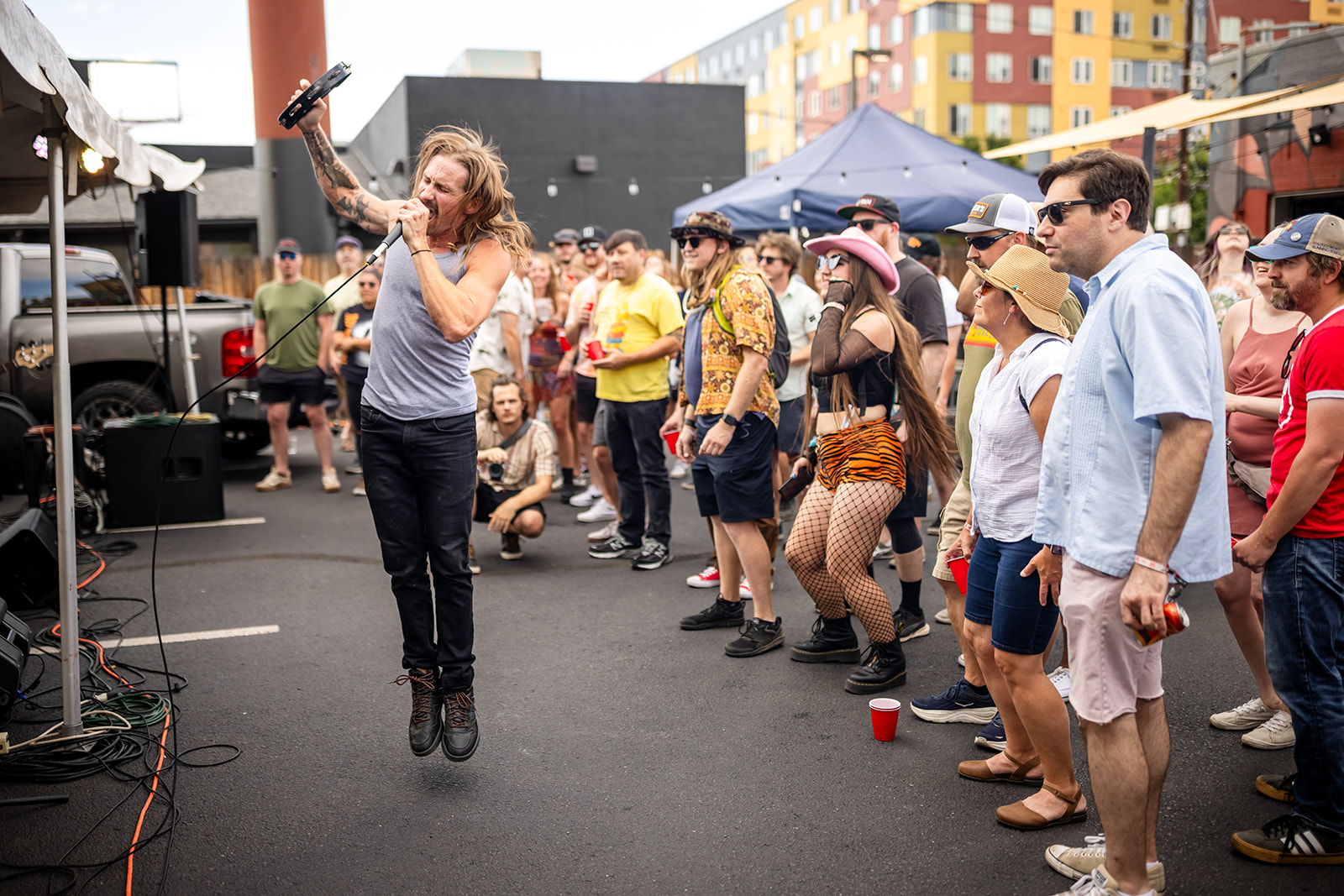 Local band The Photo Atlas stormed back with a Vans Warped Tour style sound, edged with a fiercer, aggressive bite that electrified their set. Vocalist and guitarist Alan Andrews Jr., the sole original member of the four-piece, was born to command the stage, galvanizing the crowd with a fist-raising “Hey, hey, hey” chant and a thunderous drum solo mid-song. “Seems like we’re having a good time,” he grinned, later tossing out, “What do you guys think, 2 more, 3 more?” before hyping their upcoming track “Just Keep Moving On.” Fans clapped in rhythm as Alan snatched a tambourine for the final song, shouting, “Thanks for rocking with us all these years! We love the UMS, sad to see it go, but let’s enjoy it now!” At Banded Oak Brewing’s parking lot on Saturday, the scorching heat was no match for the metaphorical cool of the band’s unity with their fans, driven by rad guitar riffs and pounding drums. After a long hiatus, these veterans of Tom Petty lineups and video game soundtracks returned with a 2024 EP, building on their 2006 debut album and 2009 EP. Their fierce comeback and deep Denver roots confirms their place in this final UMS.
