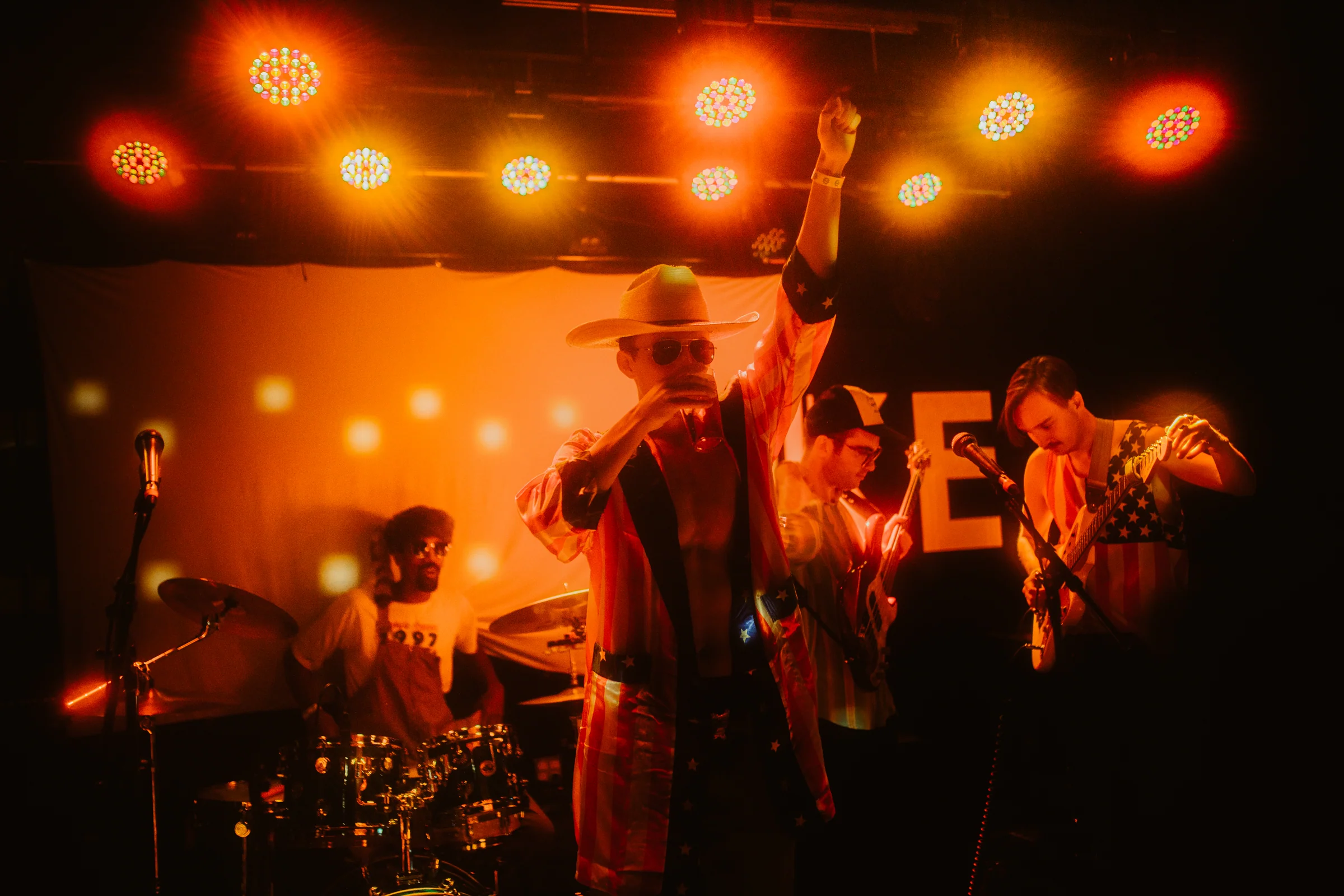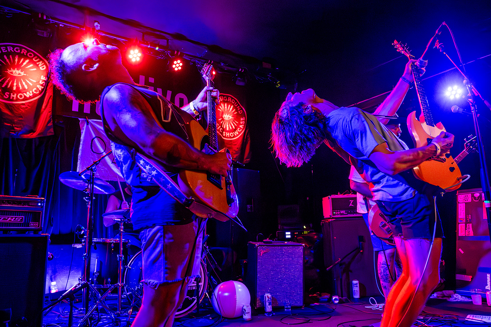 Bud Bronson & The Good Timers closed out the Underground Music Showcase’s 25-year run with a full-throttle party-rock explosion, hitting the Hi-Dive stage at 11 p.m. on Sunday and raging past midnight. Volleyballs and pink flamingos flew through the air, courtesy of two trash bags the band tossed to the crowd, stuffed with goodies from their UMS stipend. “Did you guys miss us? We haven’t played a show in the states in like three years,” the band shouted, shaking their hair and headbanging furiously. A third guitarist ripped into a rad solo, while an Ozzy banner and UMS flag framed the chaotic scene. The moshpit churned with members of nearly every band from this year’s lineup, joined by local DJs. The bassist, in vintage Broncos shorts, and the guitarist in an old-school Metallica shirt, led the charge as fans in Bud Bronson tees sang along. “You guys made it to the final level of UMS,” the frontman touted, acknowledging the historic moment. Stage dives and crowd surfing erupted, with two fans grabbing the band’s tambourine and riding the crowd’s waves. “For people crowd surfing, be safe, be nice to each other,” The frontman urged. Snippets of Ozzy Osbourne punctuated a few times throughout set, and a cover of Cheap Trick’s “Surrender” — with its “Mommy’s alright/ Daddy’s alright” refrain — saw a random fan leap onstage to sing a verse before diving back into the fray. The show ended past midnight with the band shouting out to “Support local music, support local artists!” The crowd chanted for an encore, but the band countered with “Dance party!” before passing the baton to the DJs. As the final notes faded, the band posed for a photo on the Hi-Dive stage, sealing the final chapter of UMS with a legendary, sweat-soaked bash.