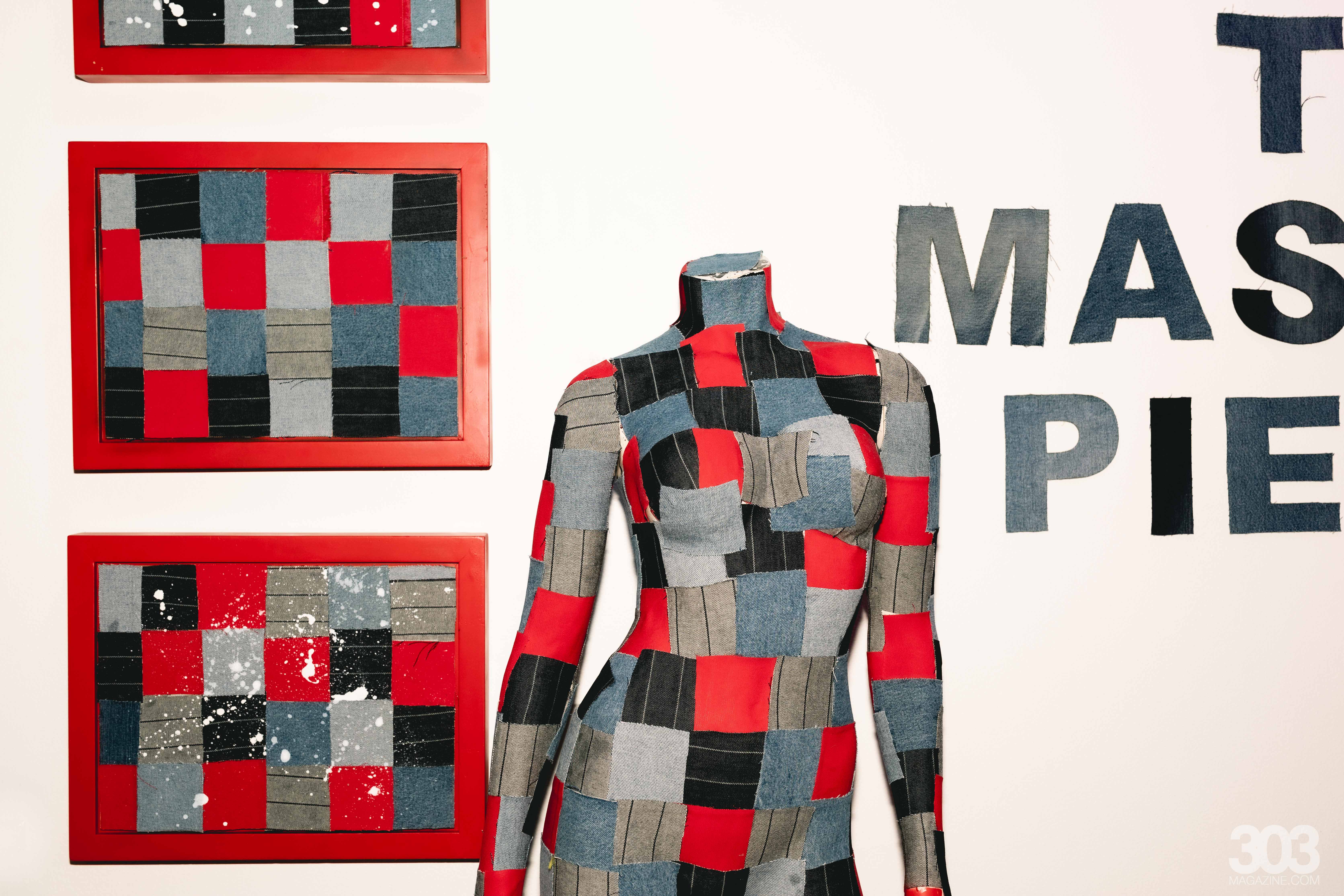 Nearby, framed artworks continued the theme, showcasing similar patchwork designs within ornate gold frames. The frames elevated the repurposed materials to a fine art status, a sentiment that was echoed by a patchworked mannequin as a central piece in the collection, meticulously cover in pieced-together denim and red fabric squares.