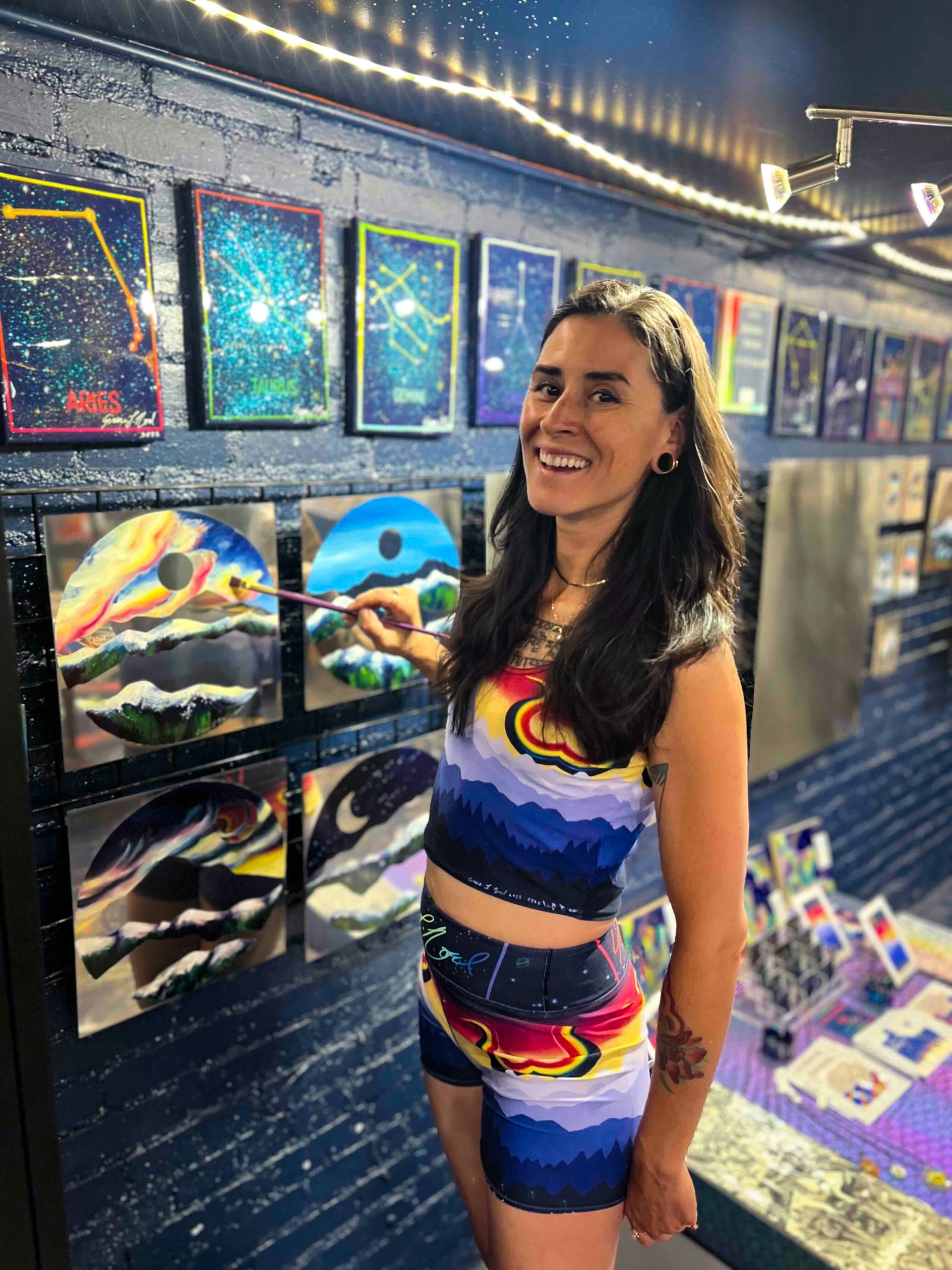 Her latest display, The Mountain Meditation Series, debuted on July 20 and features multiple mixed-media expressions that Noel hopes will inspire future pieces. “My new series includes three styles, and I hope to choose one that will be painted onto the two 24″ x 30” stainless steel panels that I was gifted by Mai Wyn Schantz, a renowned Denver-based oil painter who has decades of experience creating fine artwork on stainless steel and aluminum,” said Noel. By working over a reflective surface, Noel lets viewers look inward while gazing at elegant expressions of the natural world. While she says that the 18 pieces on display are basically sketches, they’re a subtle departure from her earlier work, and are incredible in their own right. “My signature rainbow palette connects every self-produced art series I’ve made since 2016. Overall, my artwork has a theme of honoring ancestors and an appreciation for the interconnection that we all share, not just as people but with all life on Earth and the universe. While my new Mountain Meditations artwork seems to deviate from my signature rainbow style, I used the same set of oil paints to show how these colors originate in our colorful Colorado landscape,” she continued.